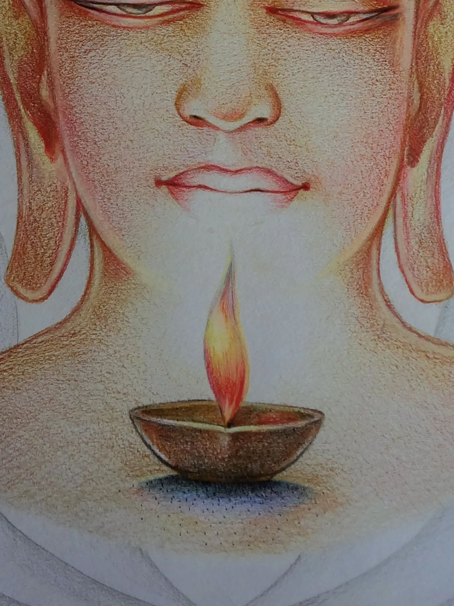Each delicate stroke of pencil color on paper is a testament to the artist's dedication and skill. Rendered on high-quality paper, the subtle layering of pigments creates a depth and texture that captivates the eye. You'll appreciate the meticulous attention to detail, from the serene expression of the central figure to the gentle glow of the illuminating flame.