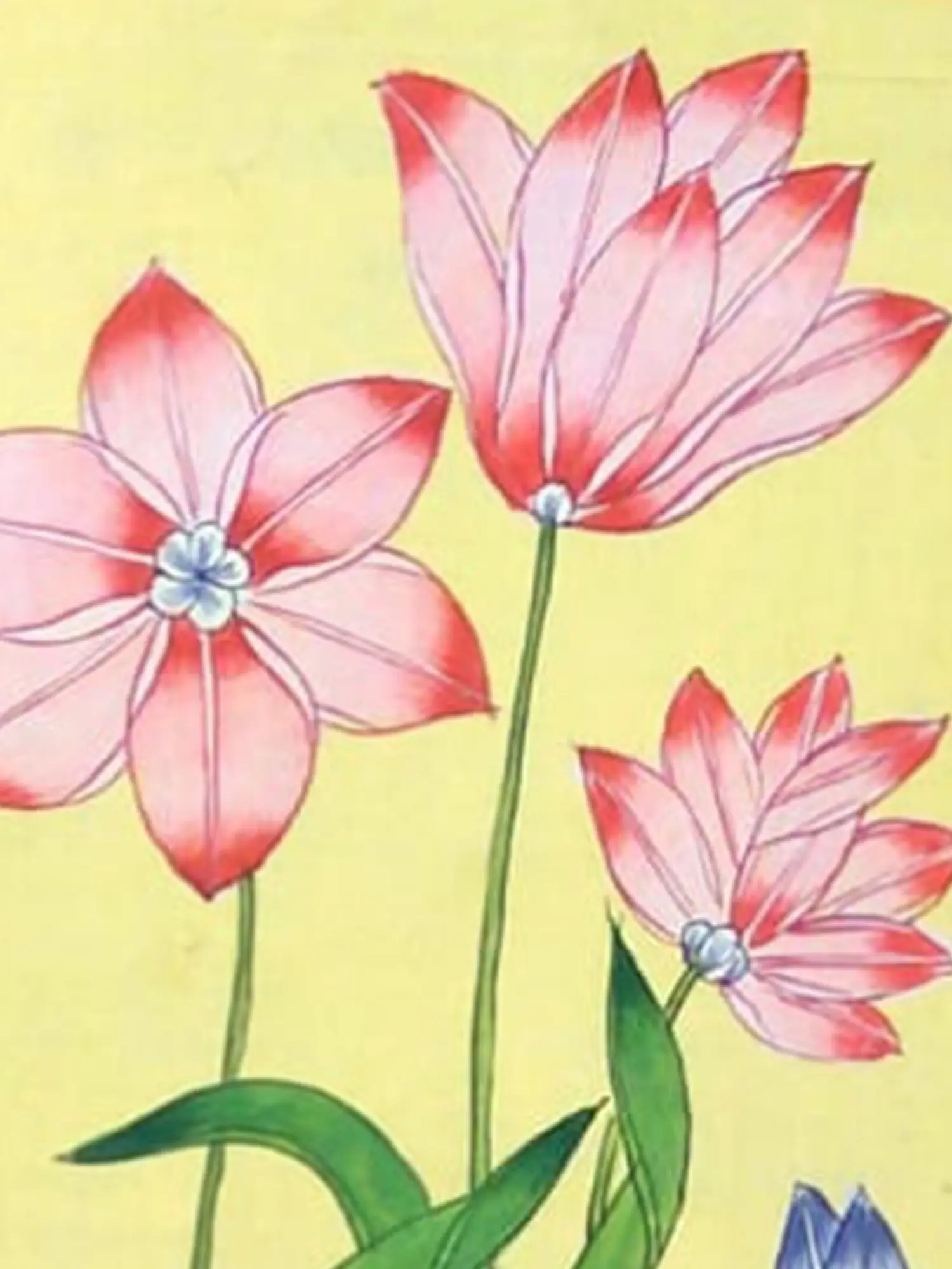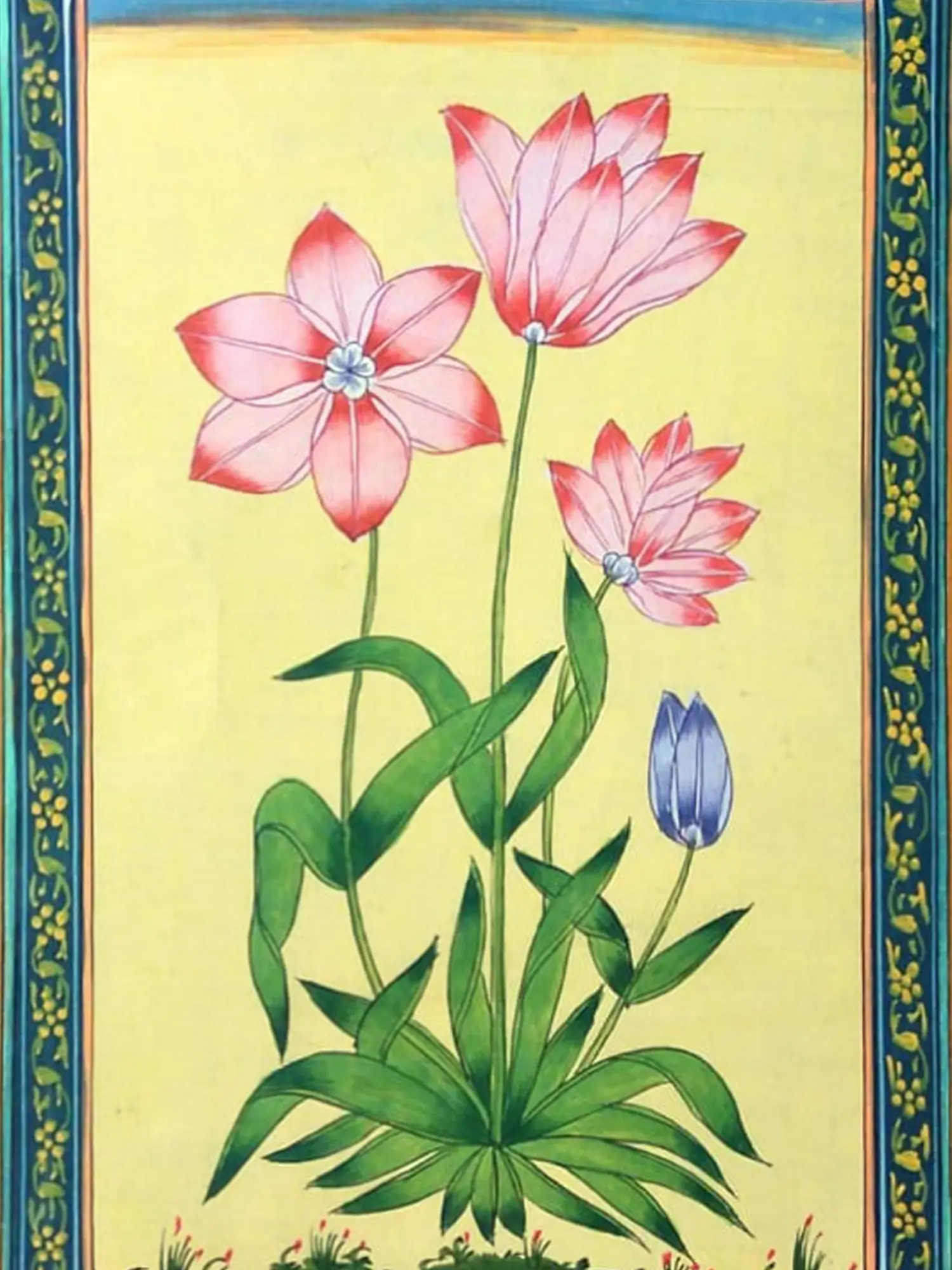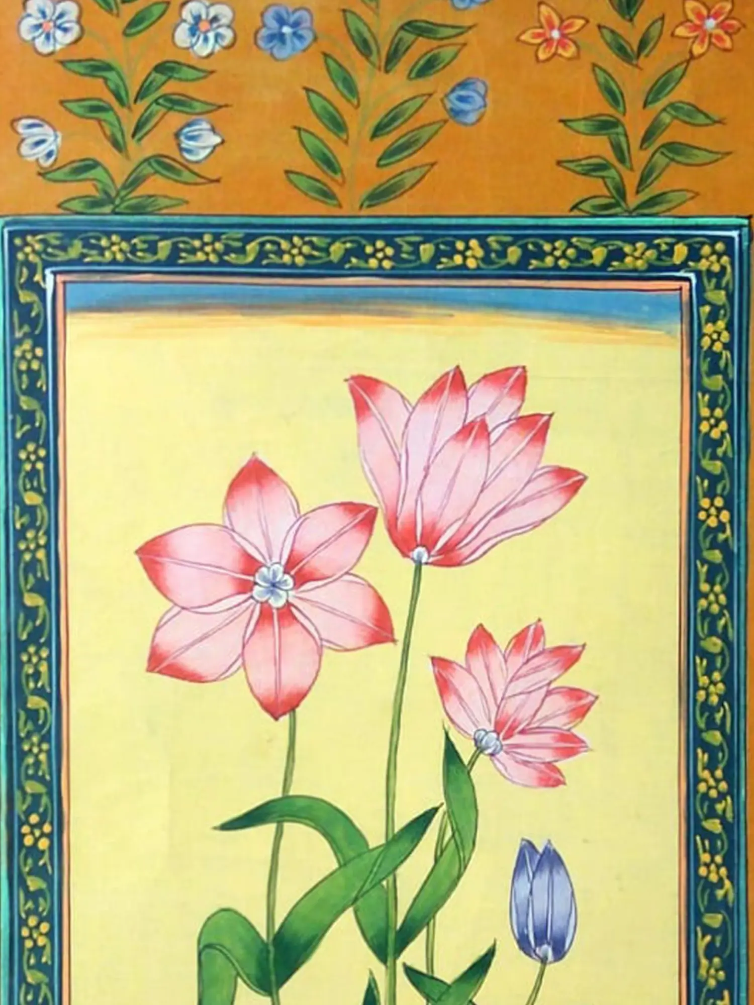 The primary focus draws you into a luminous central panel, where three elegant flowers unfurl their delicate pink petals, accented by subtle red veins. A single, unopened blue bud hints at future beauty, nestled amongst lush, deep green foliage. This vibrant core is framed by an intricately patterned border of blues and golds, itself set against a rich, warm ochre background adorned with a scattering of smaller, cheerful blossoms. The dimensions, measuring 13 inches in height and 9 inches in width, make this piece a captivating focal point without overwhelming your chosen setting.