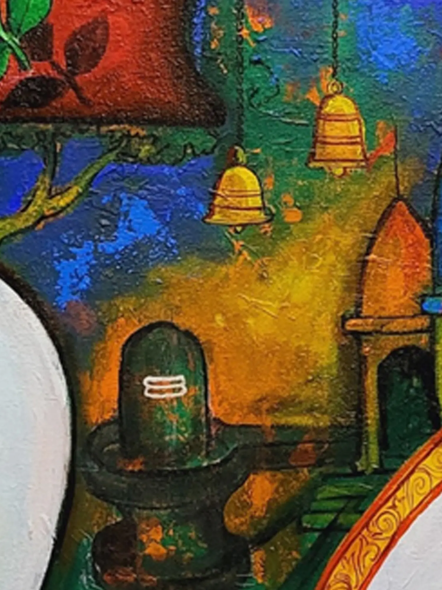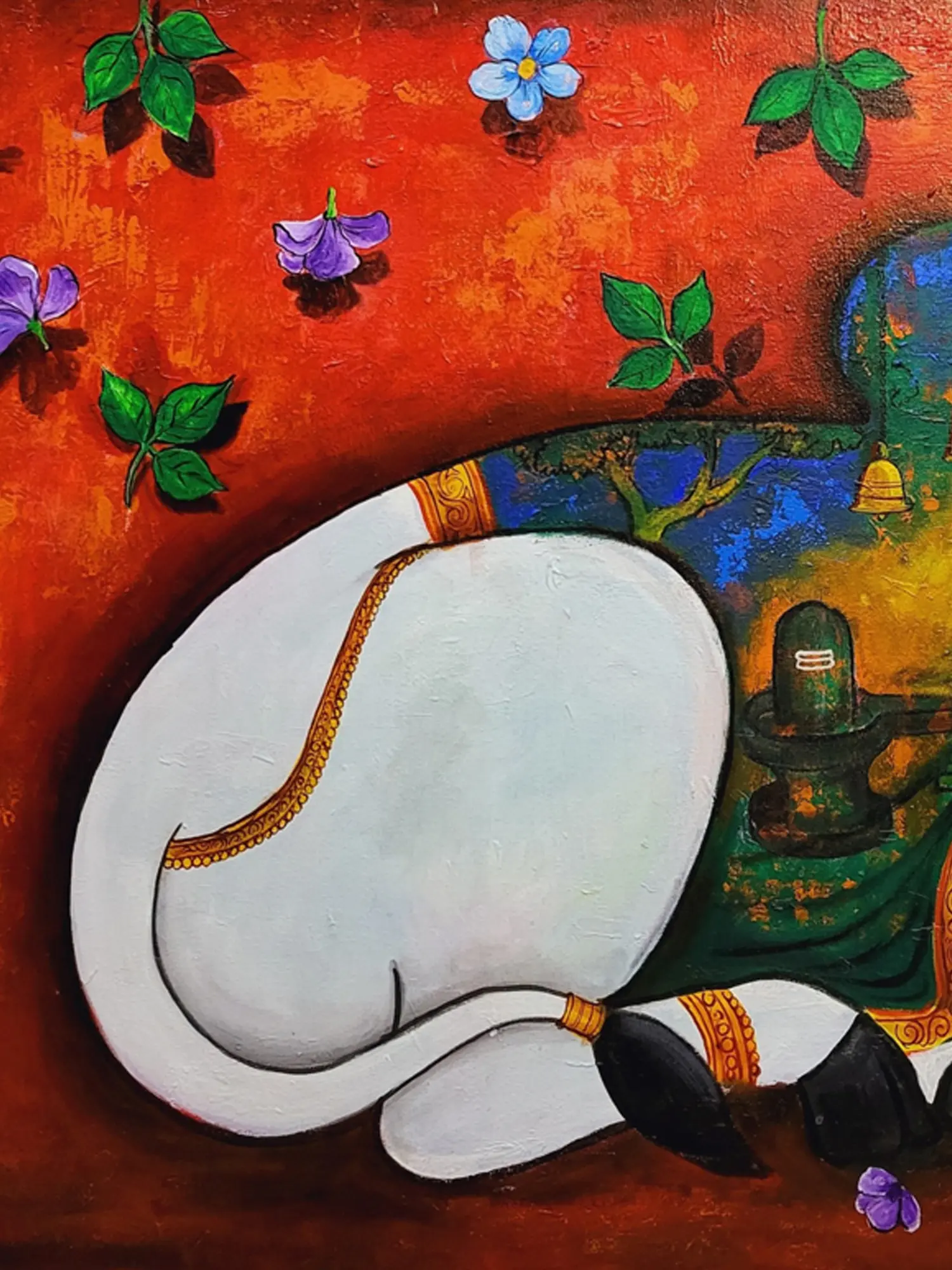 This piece draws inspiration from the sacred Nandi bull, the revered vahana (mount) of Lord Shiva in Hindu mythology. Representing strength, devotion, and purity, the Nandi is a powerful symbol of spiritual steadfastness. The subtle inclusion of a Shiva Lingam in the background further deepens the spiritual narrative, evoking a sense of devotion and cosmic harmony.
