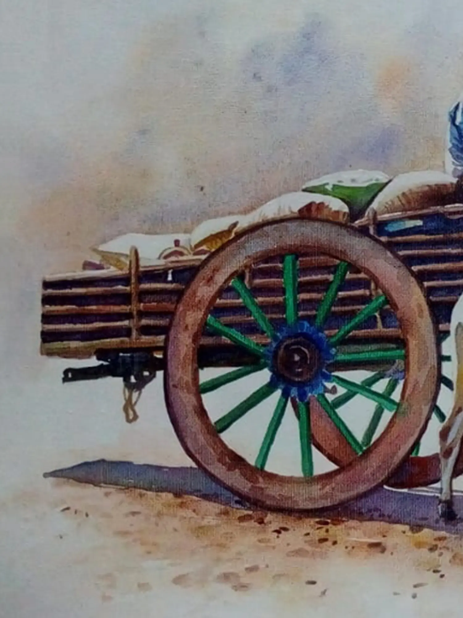 This artwork resonates with the long and rich history of agrarian societies, where the bullock cart has been an indispensable tool for centuries. It symbolizes not just transportation and trade, but a deep connection to the land and the cycles of life. The scene evokes a sense of peaceful continuity, a visual narrative that speaks to the timeless traditions that sustain rural communities and nourish the soul.