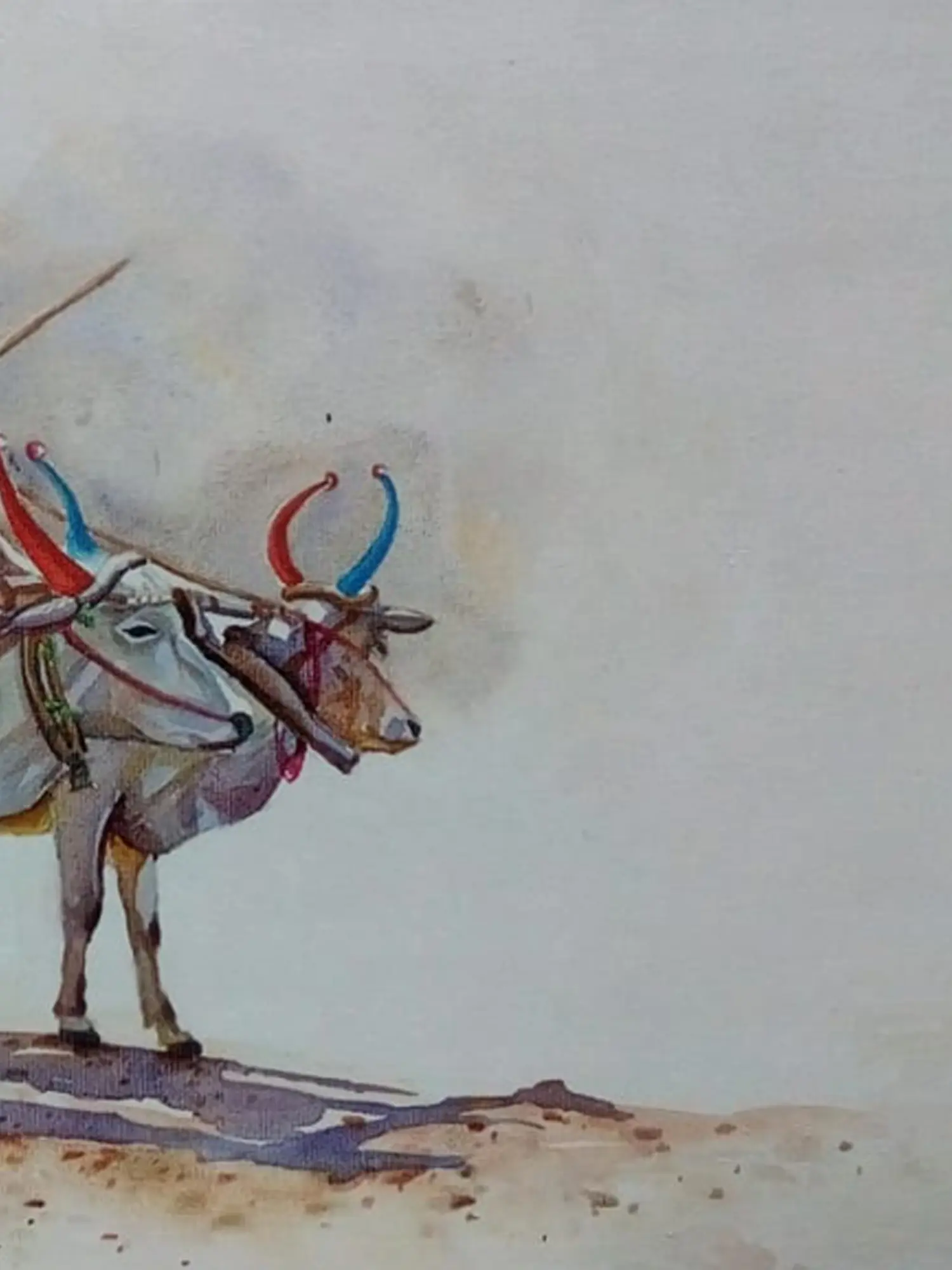 This captivating artwork is rendered on high-quality watercolor paper, a medium chosen for its ability to capture luminous washes and delicate detail. The artist, Dhyanesh Ramani, employs a masterful technique, allowing the colors to flow and blend with a natural grace that defines the soft textures of the earth and the gentle forms of the oxen. Each stroke is deliberate, contributing to a composition that feels both spontaneous and meticulously crafted.