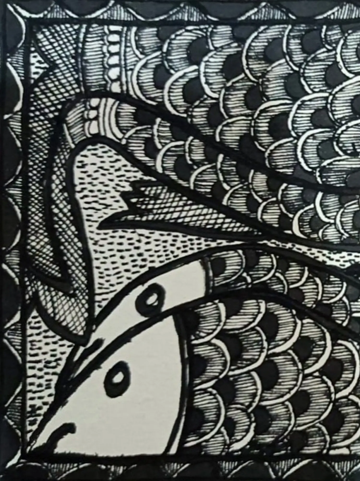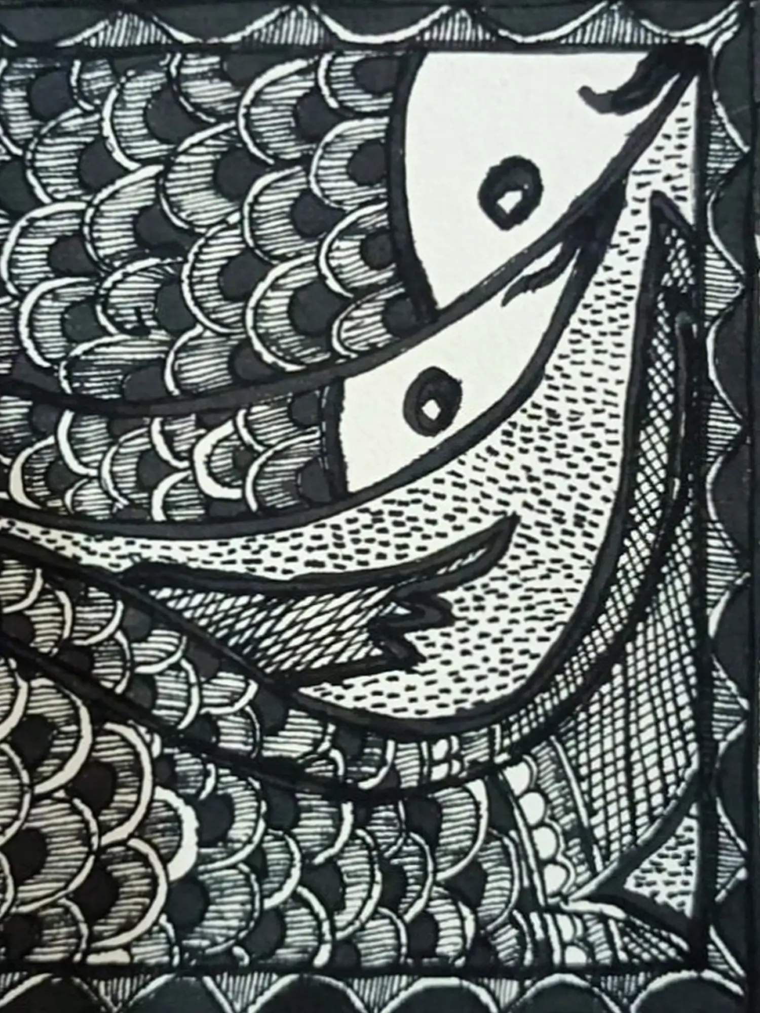 Abundance spills forth from this captivating Madhubani artwork. A vibrant bunch of fish, rendered in acrylics on handmade paper, overflows the frame. Fish, symbolic of prosperity and fertility in Madhubani art, dominate the scene, their scales shimmering with colour. Owning this piece brings a touch of vibrancy and a reminder of life's abundance into your home.