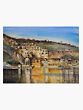 Captures the town's hillside architecture with detailed reflections in the water.