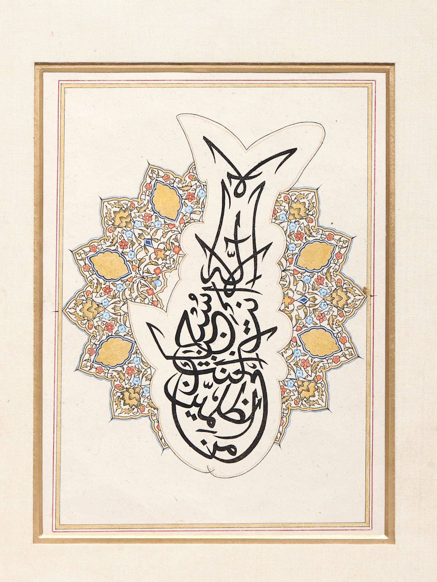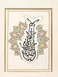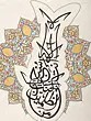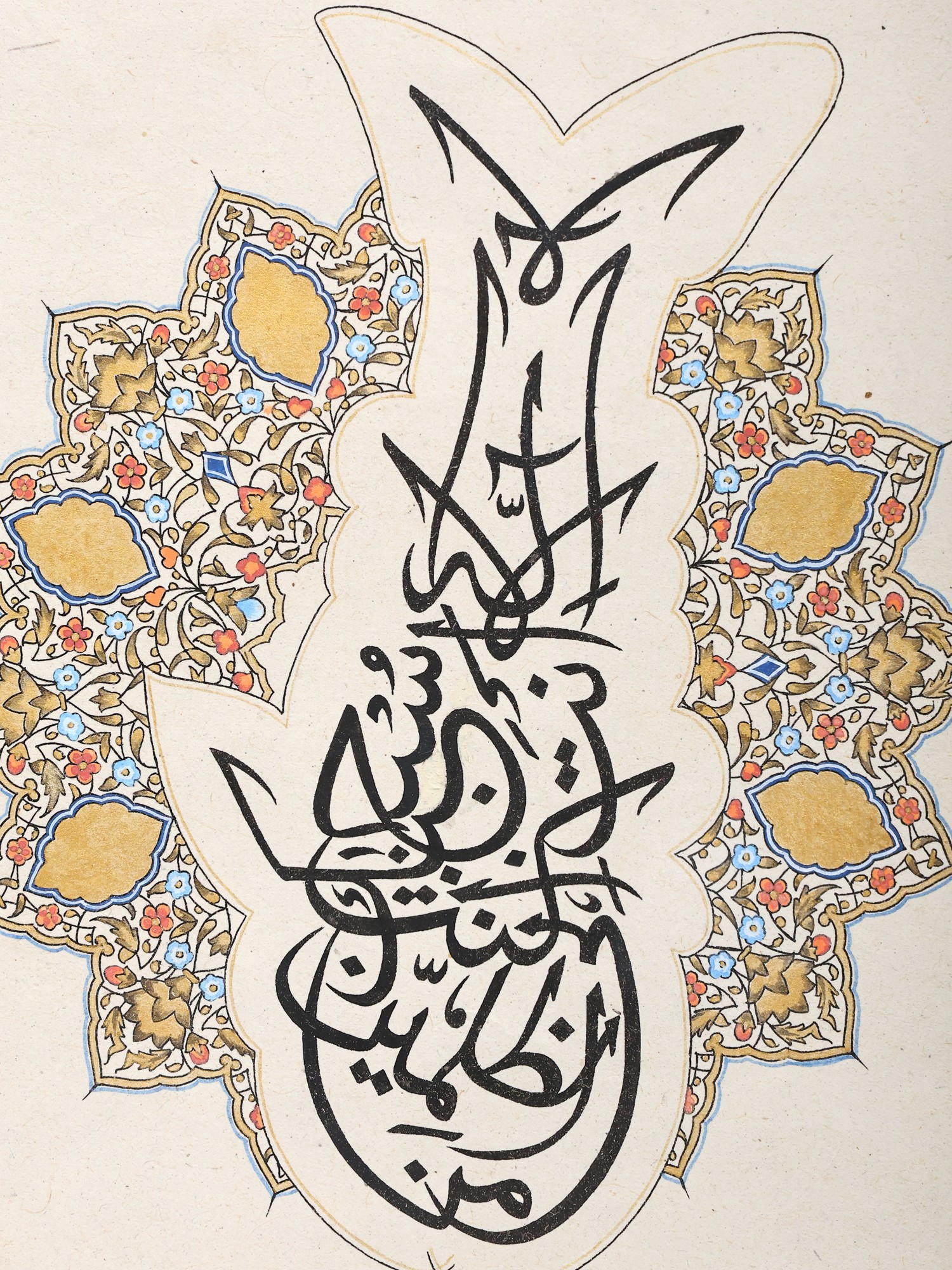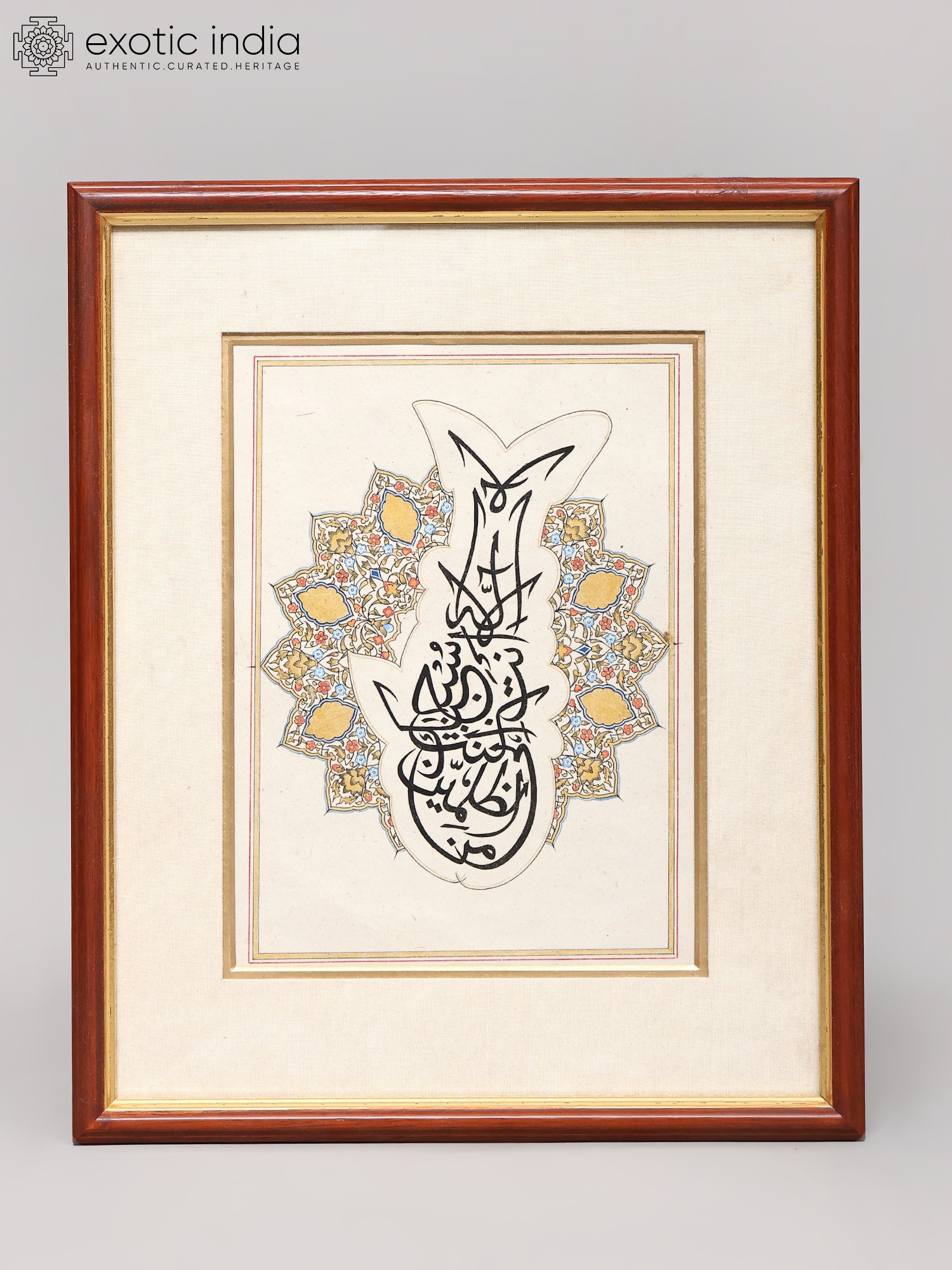 It is splendidly illustrated in a charcoal black curved handwriting showing the exact diacritics that define the exotic language. This calligraphy is the best proof of the finest working of the quill and the dip pen as it is the excellent evidence of the twirling Arabic words that take the shape of a goldfish. The painting is further enhanced by a vibrantly colored plethora of floral patterns which garlands the artificial being.