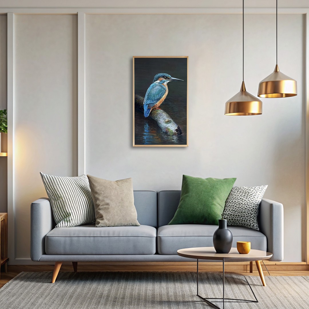 Anant Roop Art Studio's "Calm Kingfisher on Branch" on Acrylic on Canvas beautifully captures the elegance of this iconic bird. In local myth, the Kingfisher is associated with good luck, symbolizing prosperity and success. Additionally, it is seen as a representation of focus and determination, attributes often attributed to this bird's precision in hunting. The artist astutely employs a dark background, enhancing the prominence of the vivid blue hues of the Kingfisher.