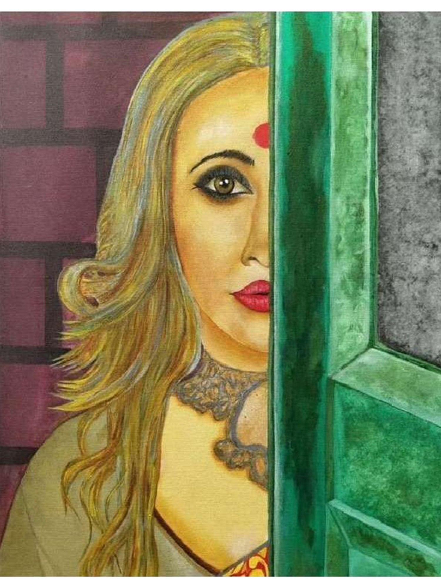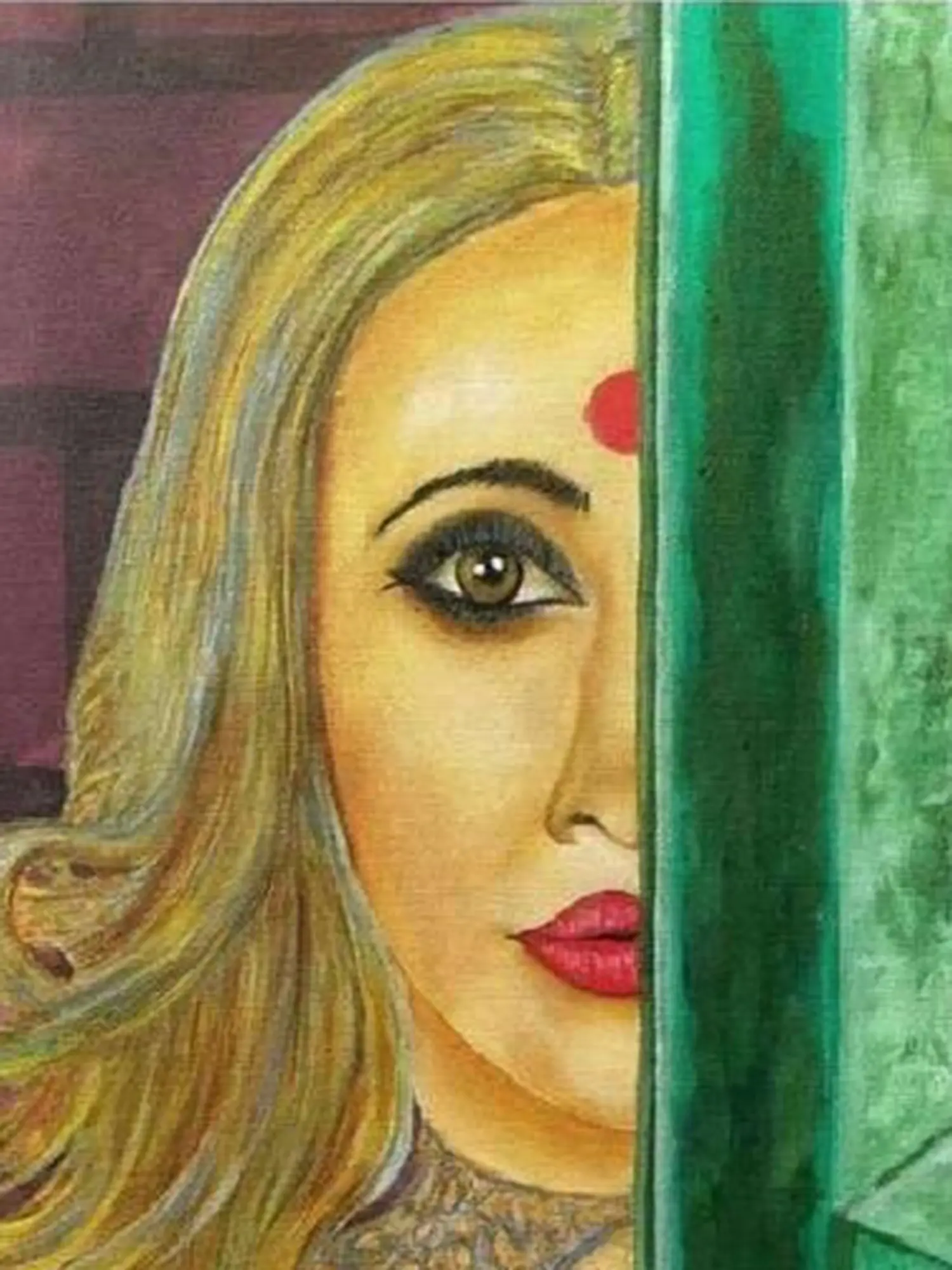 This portrayal evokes a sense of classic Indian femininity, subtly referencing traditions and aesthetics. The prominent *bindi* adorning the forehead, a traditional symbol of marital status or spiritual significance, adds a cultural layer to the portrait. The overall composition suggests a woman poised at the threshold, her gaze both inviting and protective, a visual echo of the enduring spirit found in Indian art and culture.