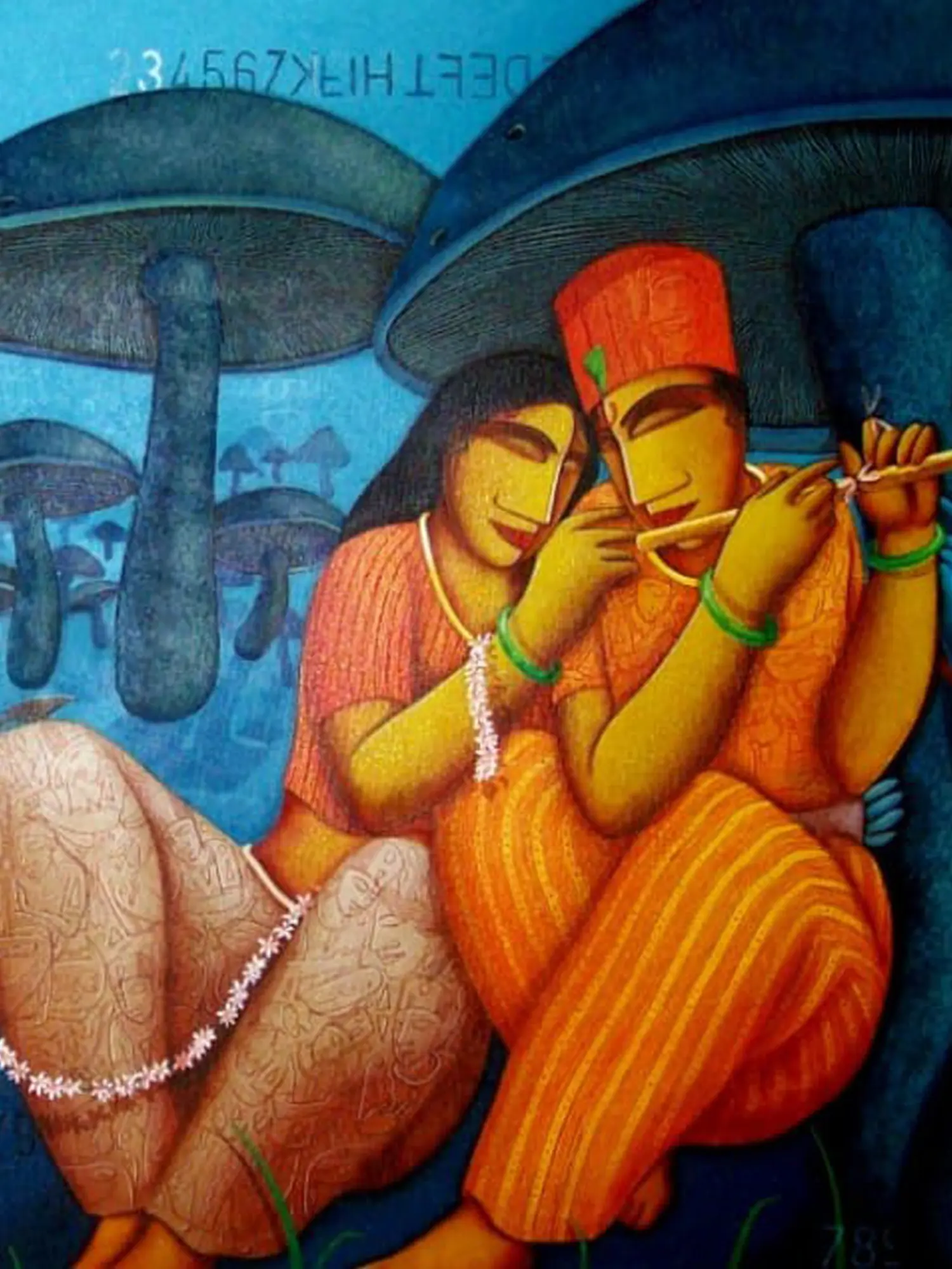 This artwork draws inspiration from the rich tapestry of Indian mythology, specifically evoking the timeless romance of Radha and Krishna. The presence of the flute, a symbol intrinsically linked to Krishna's divine music, hints at the enchanting melodies that bind these souls. The dreamlike, abundant mushroom grove suggests a sacred space, a hidden realm where divine love unfolds away from the earthly gaze. You'll find a spiritual resonance within the scene, a connection to stories that have captivated hearts for centuries.