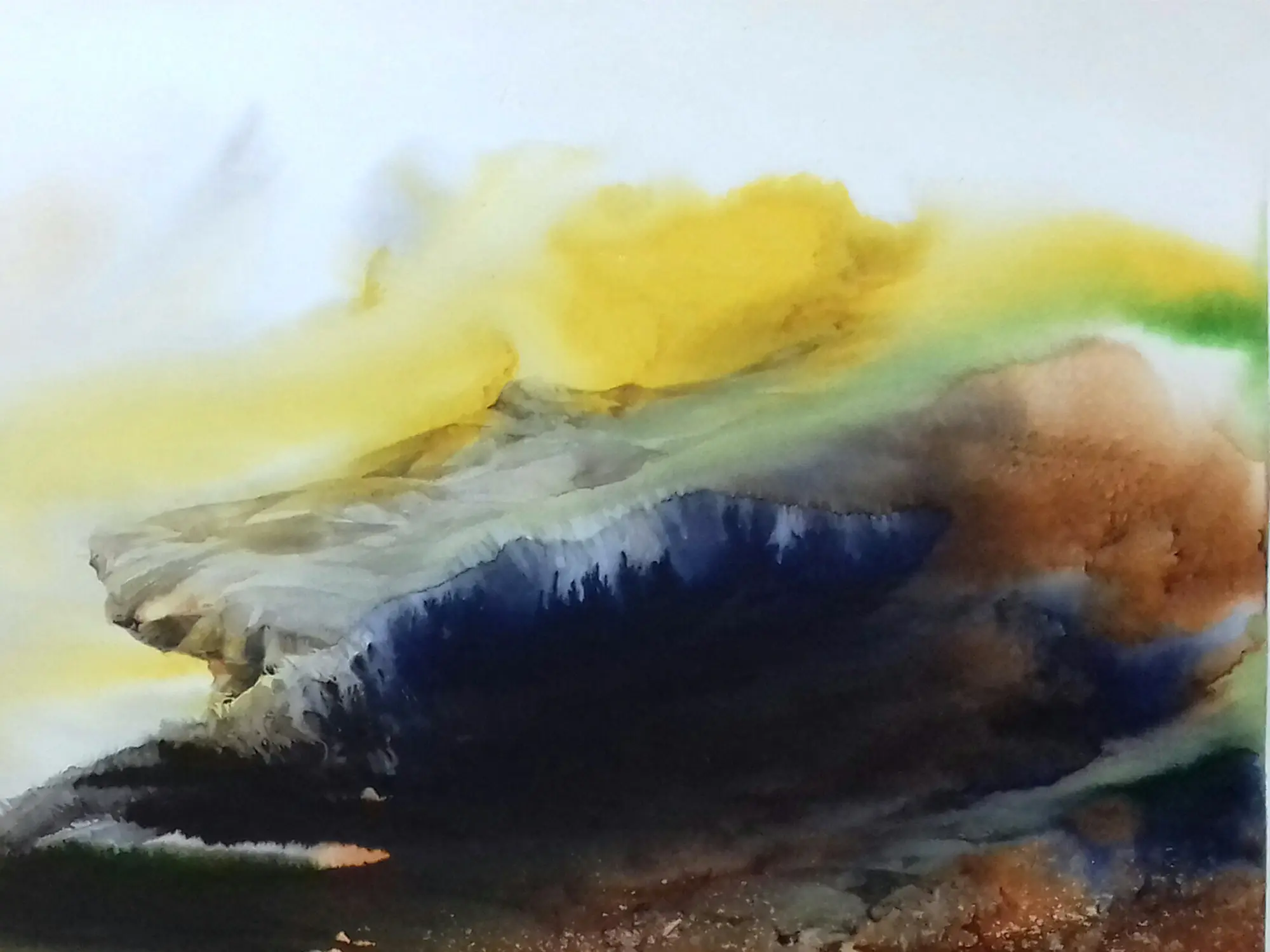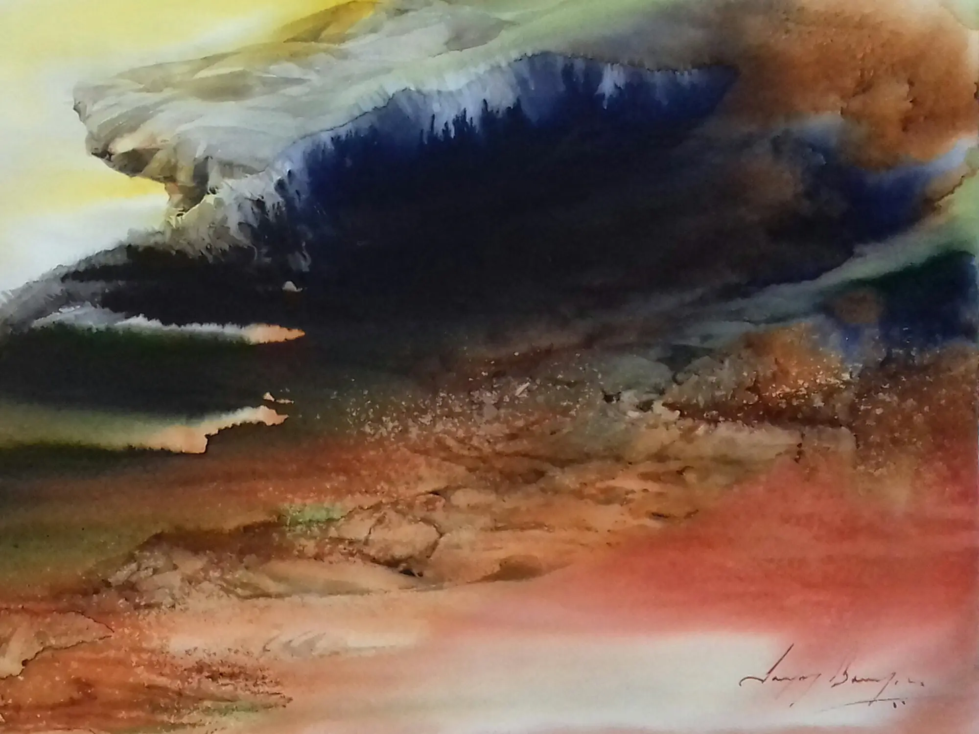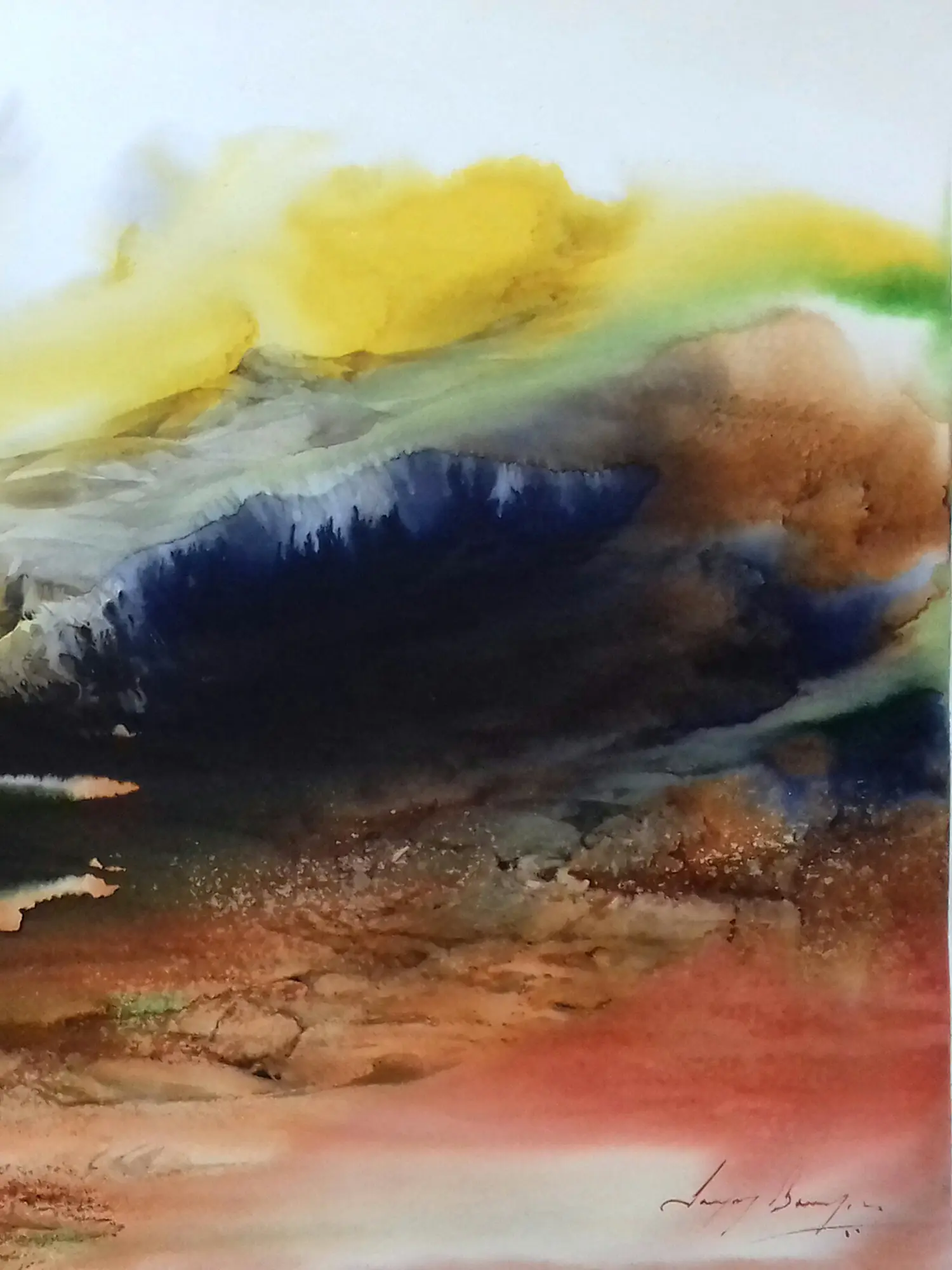 A unique combination of Loose Watercolor and paper blotting this painting titled "Cascade of Nature" by Sanjoy Banerjee, is a watercolor marvel. Here a crumpled paper towel has been used to remove the color from the damp and delicate paper. To create a repeating pattern in the blot marks, the paper is moved in circular motions. Vivid colors and cascading strokes mirror the ceaseless rhythm of nature's dance. There is a magnificent interplay of blue, yellow, and burgundy tones. To display the irregularities of the soil, the sprinkling of paint technique is adopted. Sanjoy Banerjee has attempted to reflect the interdependency of all living beings and the harmony of existence through this painting.
