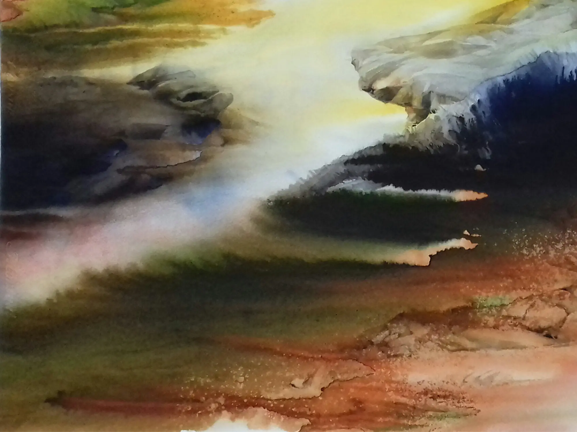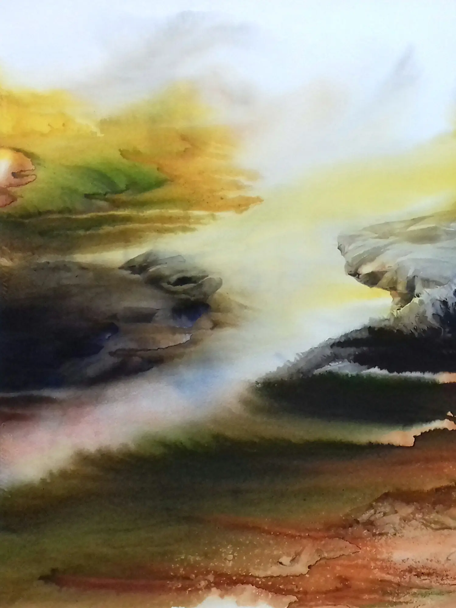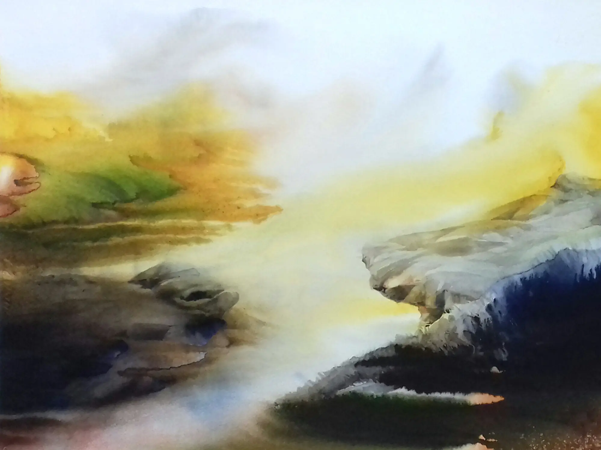 A unique combination of Loose Watercolor and paper blotting this painting titled "Cascade of Nature" by Sanjoy Banerjee, is a watercolor marvel. Here a crumpled paper towel has been used to remove the color from the damp and delicate paper. To create a repeating pattern in the blot marks, the paper is moved in circular motions. Vivid colors and cascading strokes mirror the ceaseless rhythm of nature's dance. There is a magnificent interplay of blue, yellow, and burgundy tones. To display the irregularities of the soil, the sprinkling of paint technique is adopted. Sanjoy Banerjee has attempted to reflect the interdependency of all living beings and the harmony of existence through this painting.