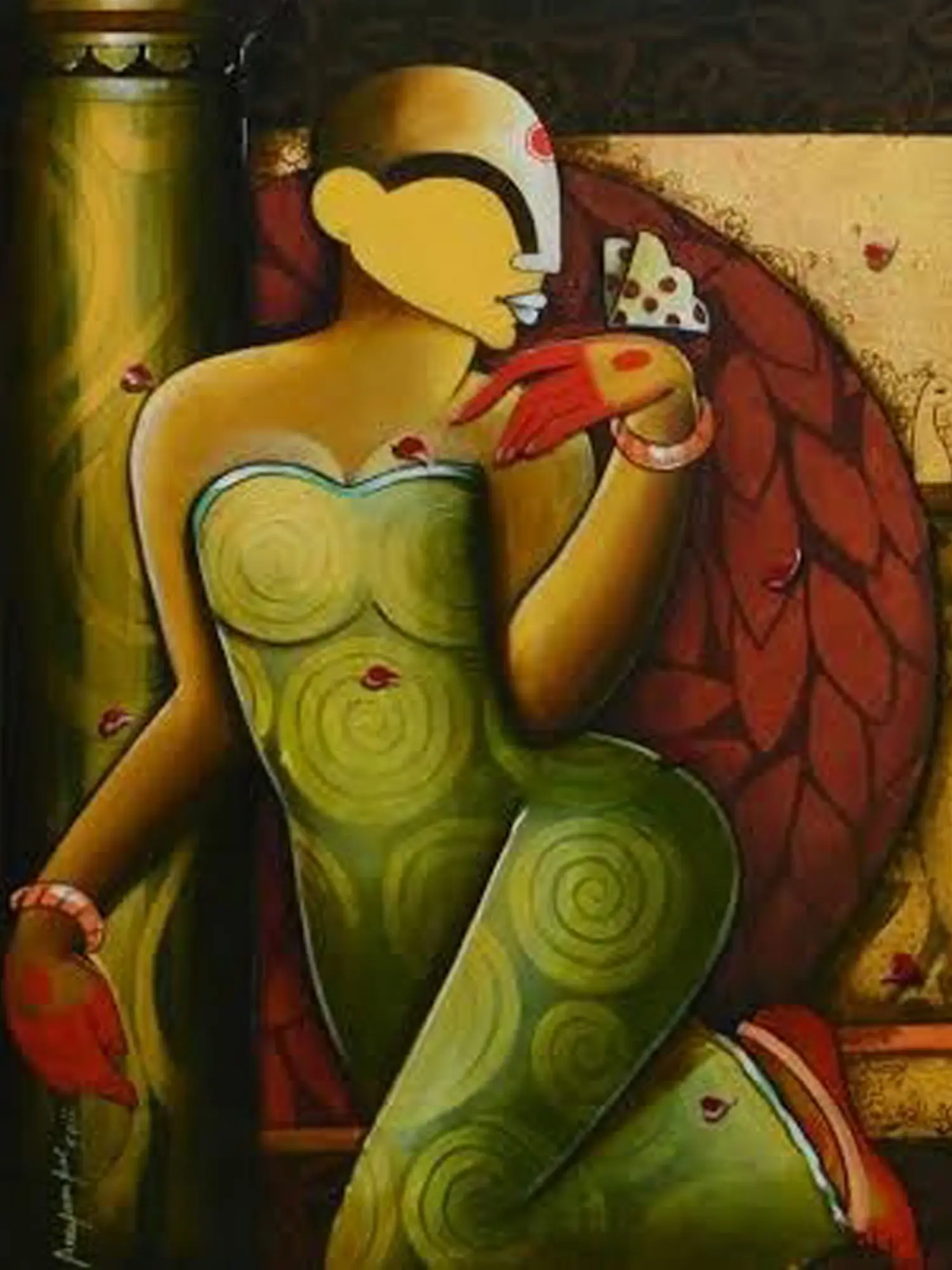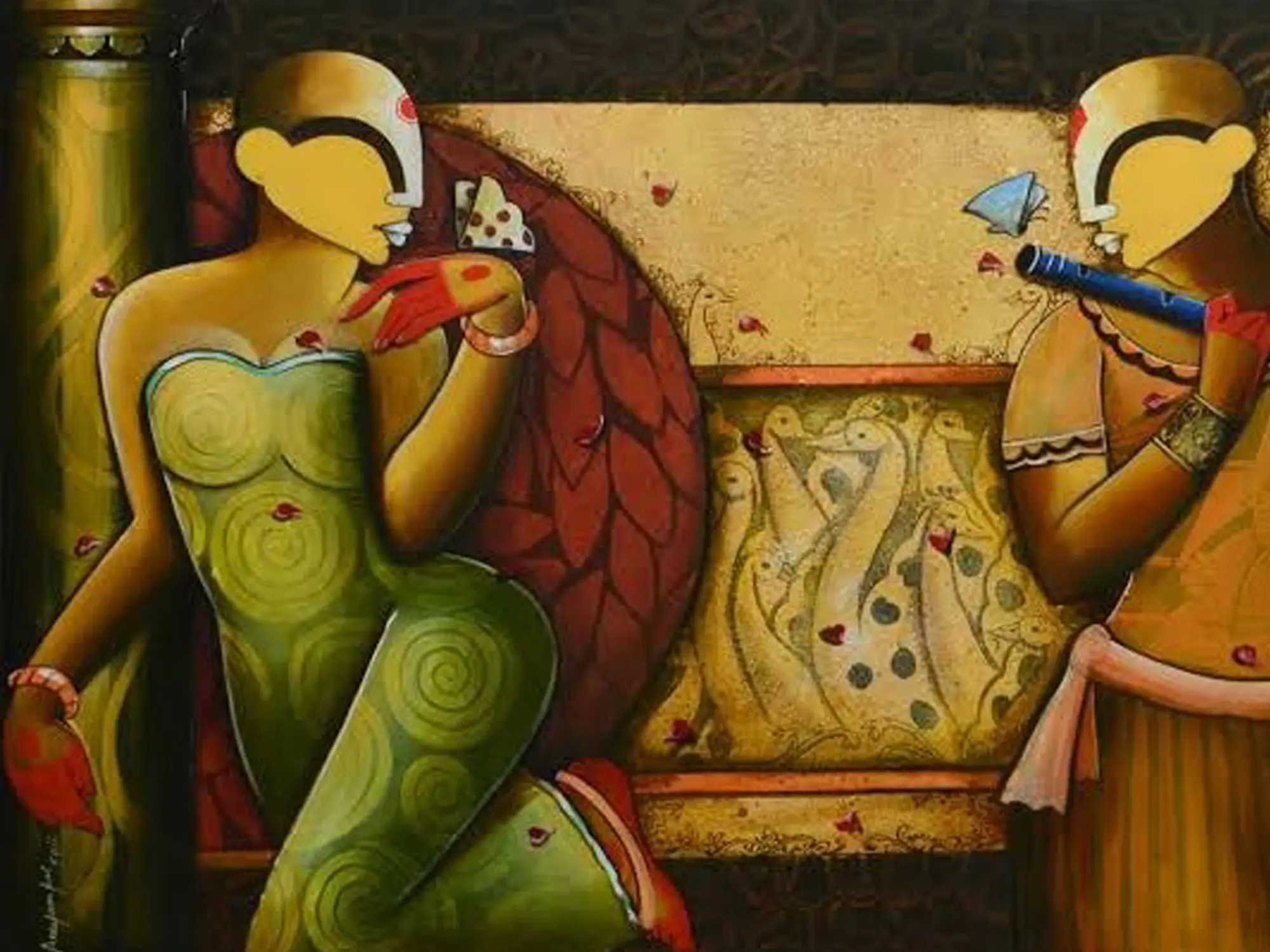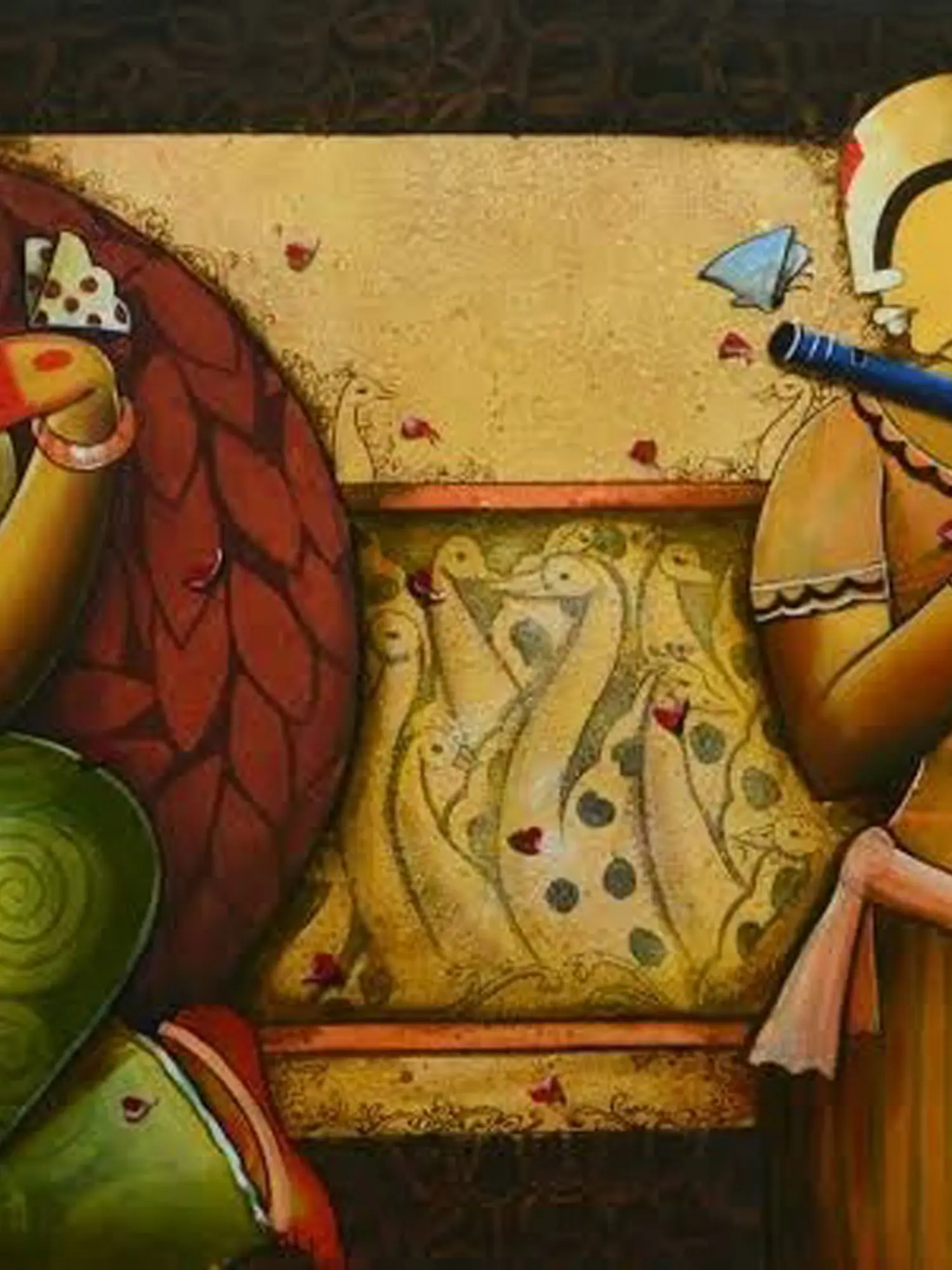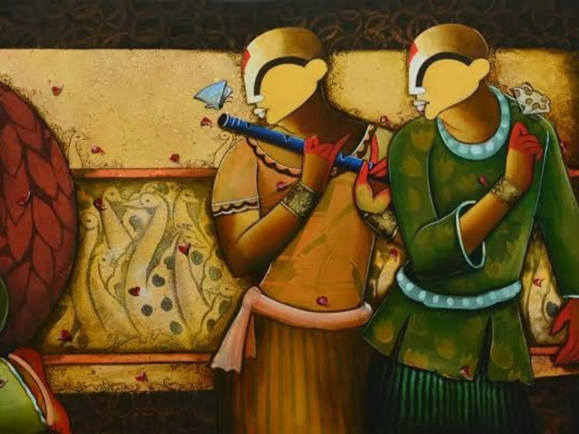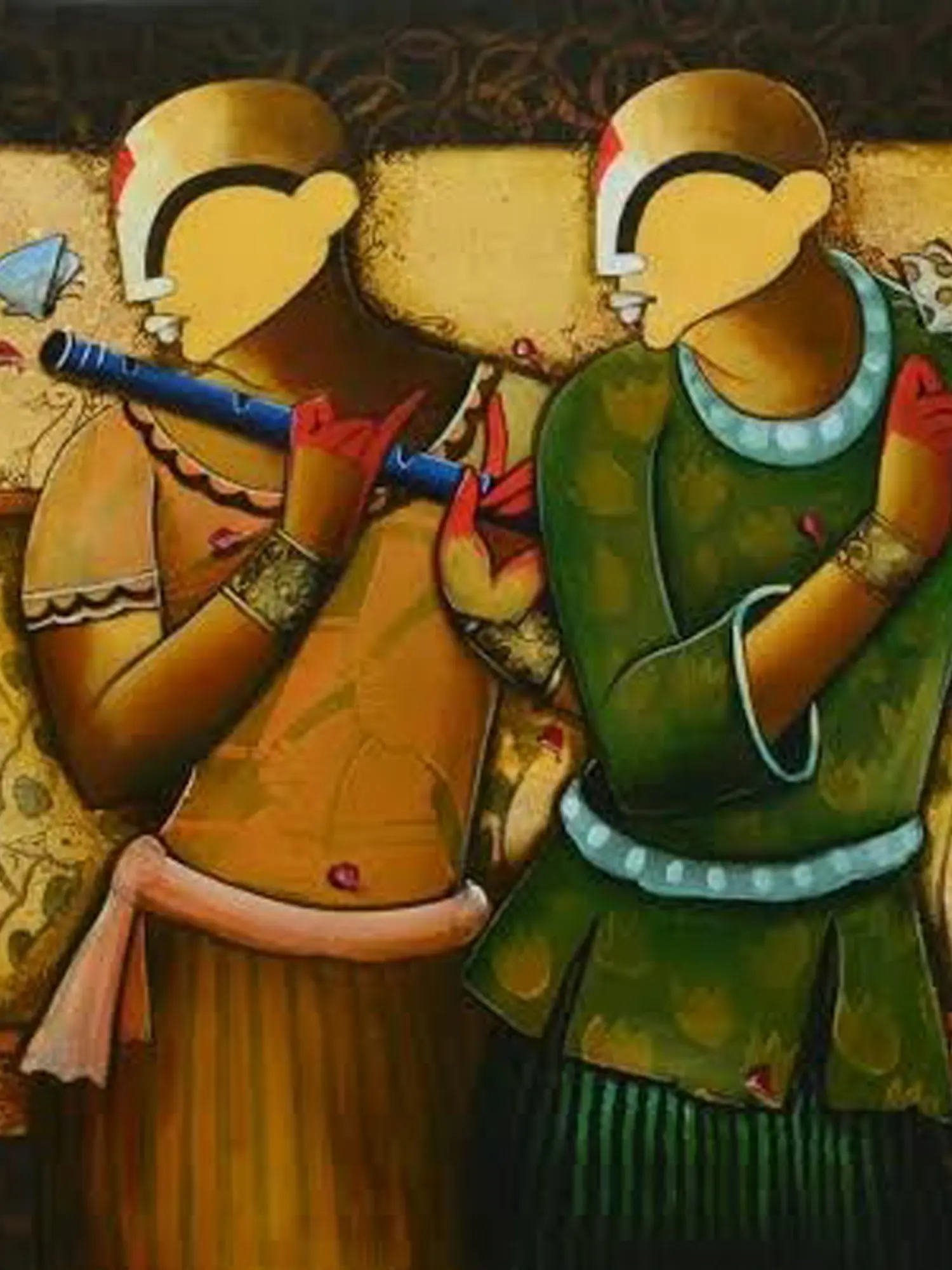 Embark on a journey through ethereal realms with this artwork - where the Nayika, adorned in resplendent hues, dances amidst melodies of celestial flute players. Each stroke of acrylic on canvas captures the essence of divine grace and earthly allure, inviting viewers into a realm where music and beauty intertwine. This piece echoes the philosophy of divine love and celestial harmony, where the Nayika symbolises the eternal seeker embracing the melodies of existence.