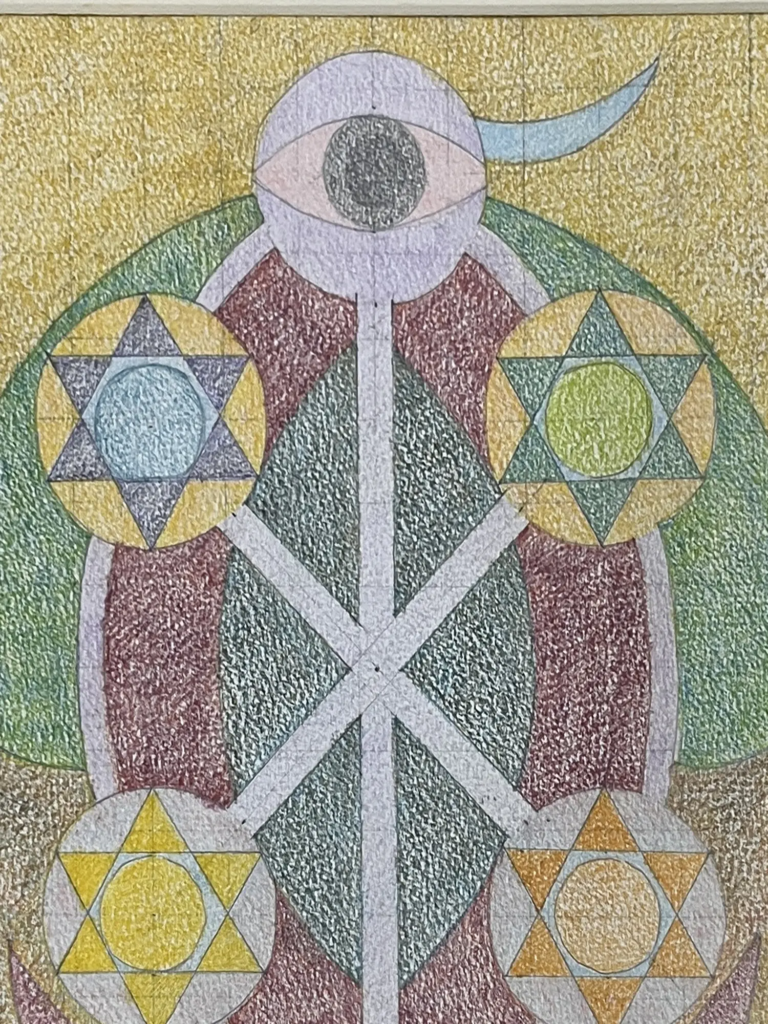 Incorporates sacred geometry with interconnected stars and circular elements, inviting contemplation.
