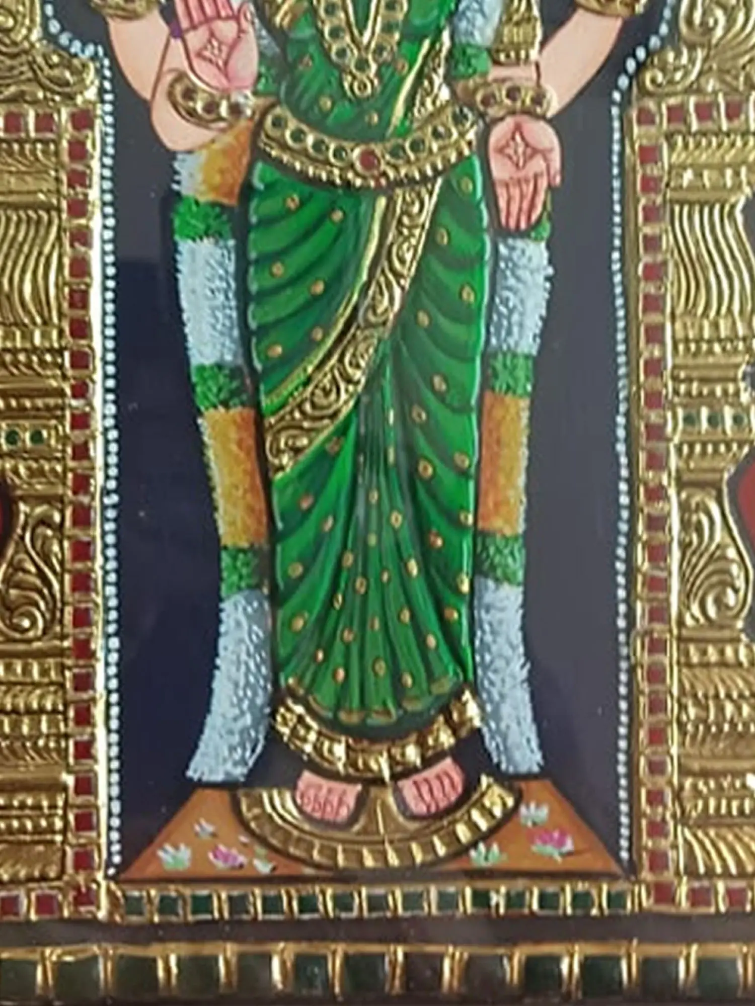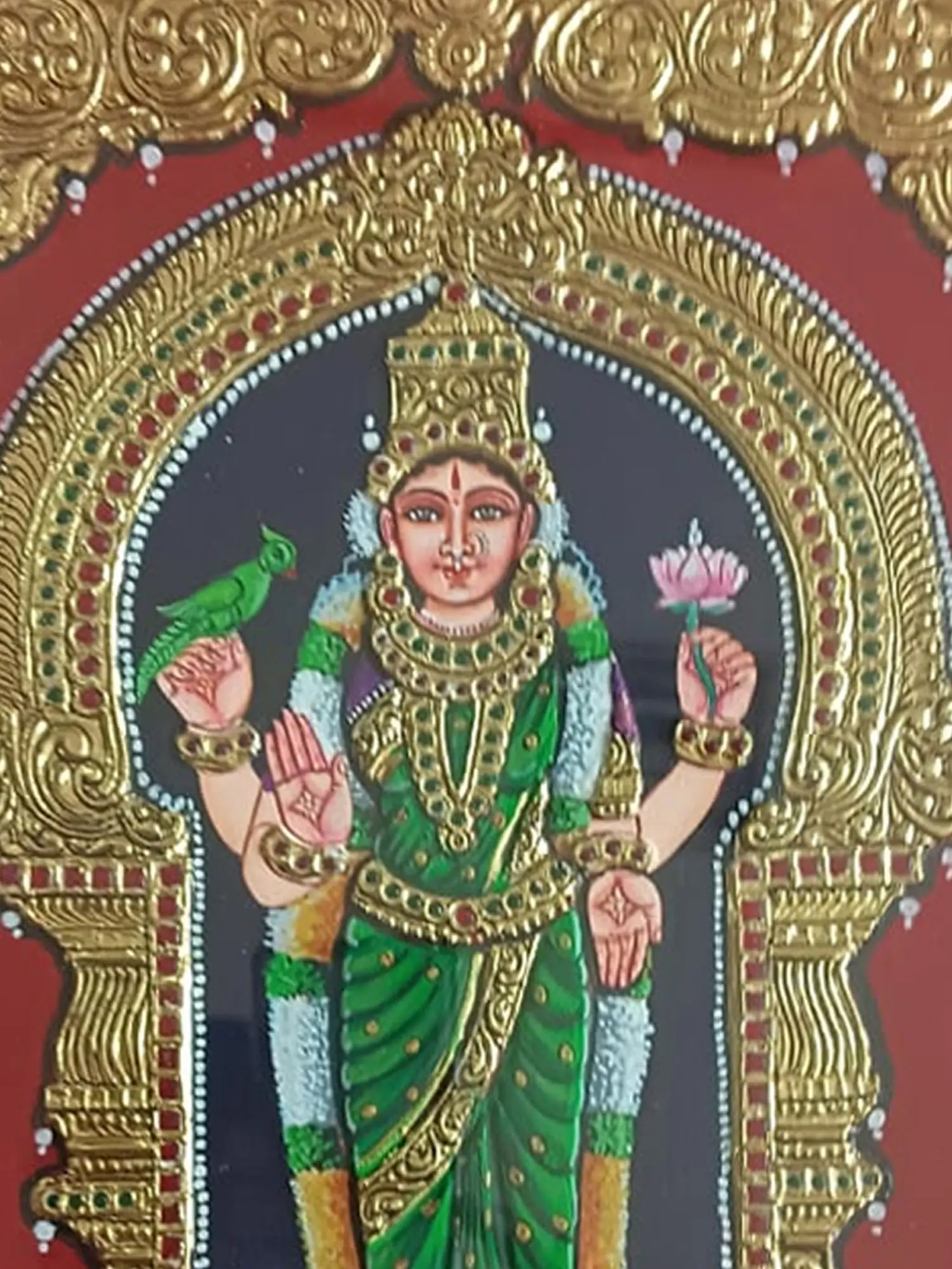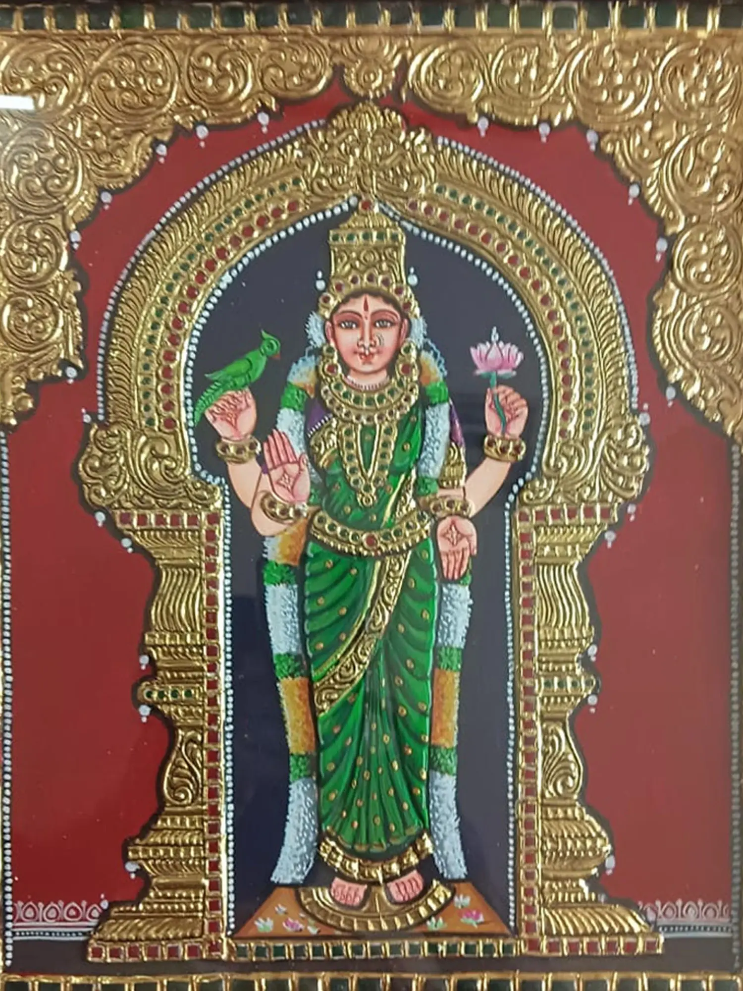 The ornate frame adds to the traditional grandeur, encapsulating the detailed artistry. This Tanjore Painting not only celebrates the auspicious presence of Goddess Meenakshi but also preserves the cultural richness of traditional art. The depiction of vibrant green hues and the symbolic parrot makes this artwork not only visually stunning but also a profound representation of the divine feminine in Hindu mythology.