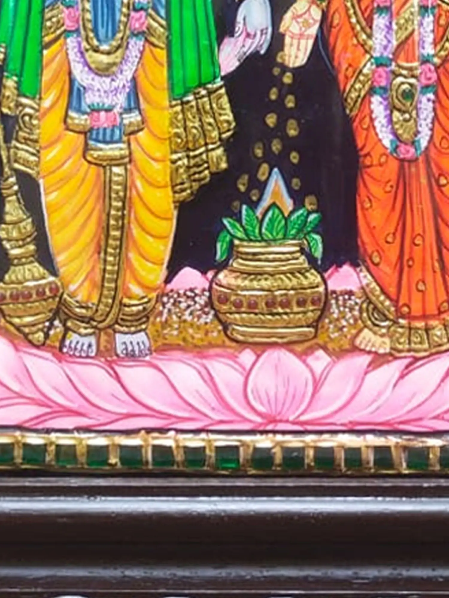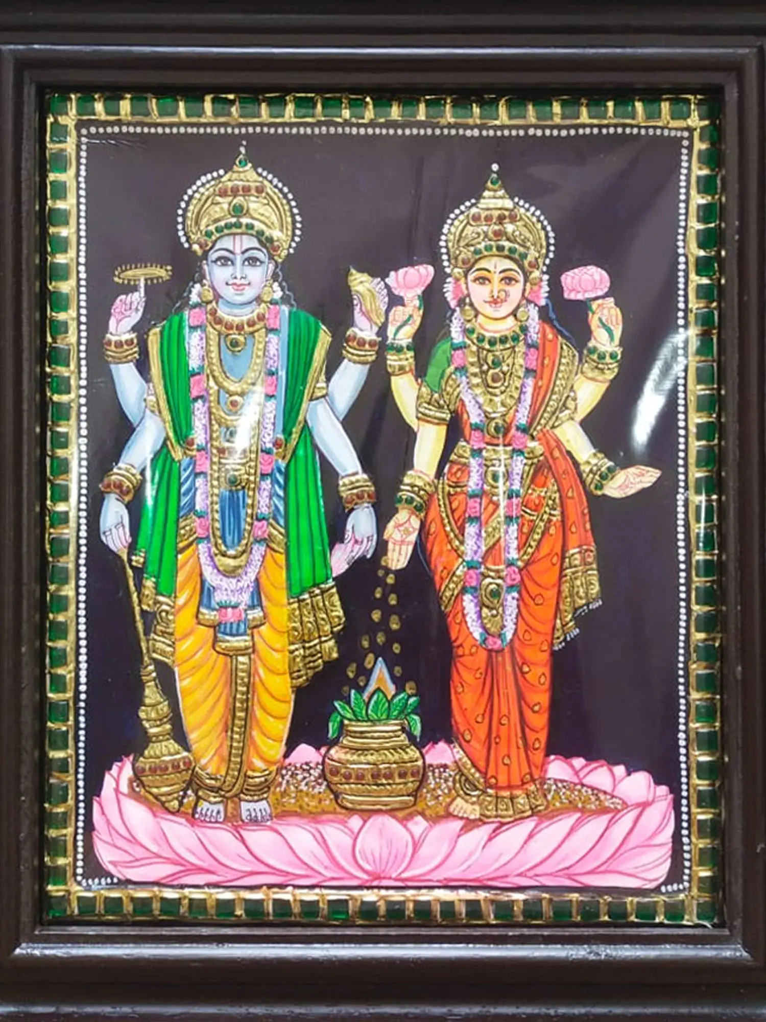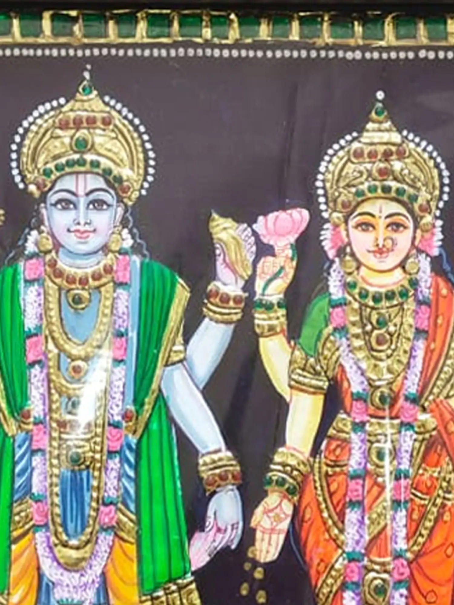 The framed artwork not only captures the divine union but also embodies the rich cultural and spiritual heritage. The use of traditional colors and intricate gold foil detailing makes this piece a testament to artistic precision, inviting viewers to witness the celestial aura of Lord Vishnu and Goddess Lakshmi in a traditional Tanjore masterpiece.