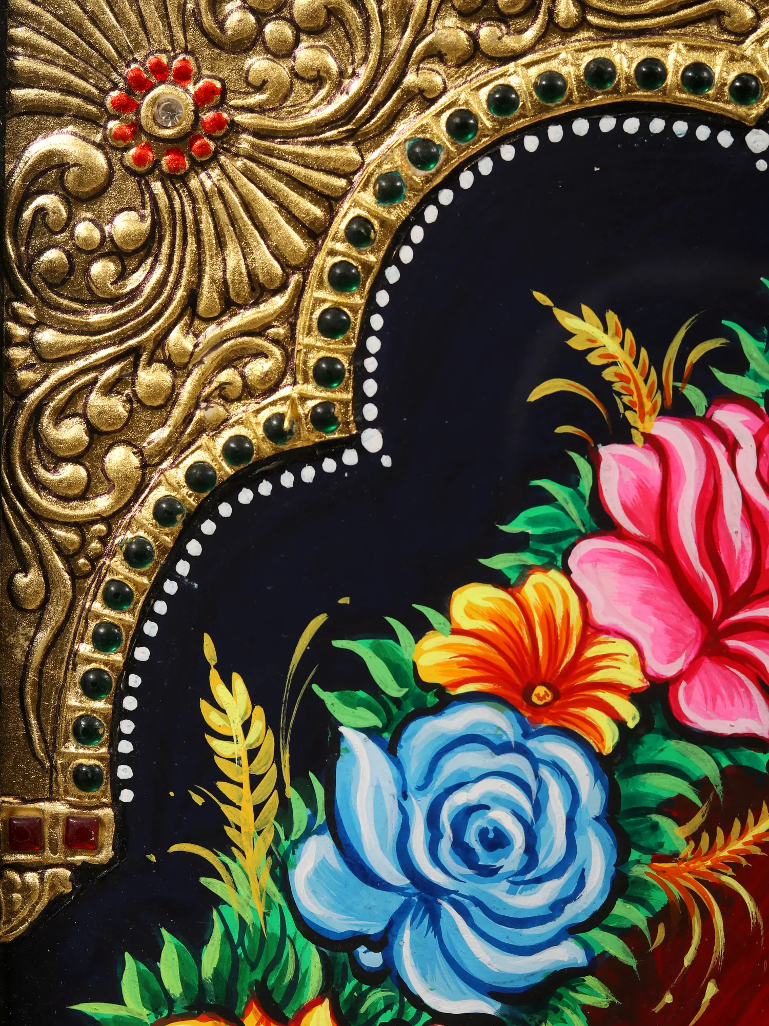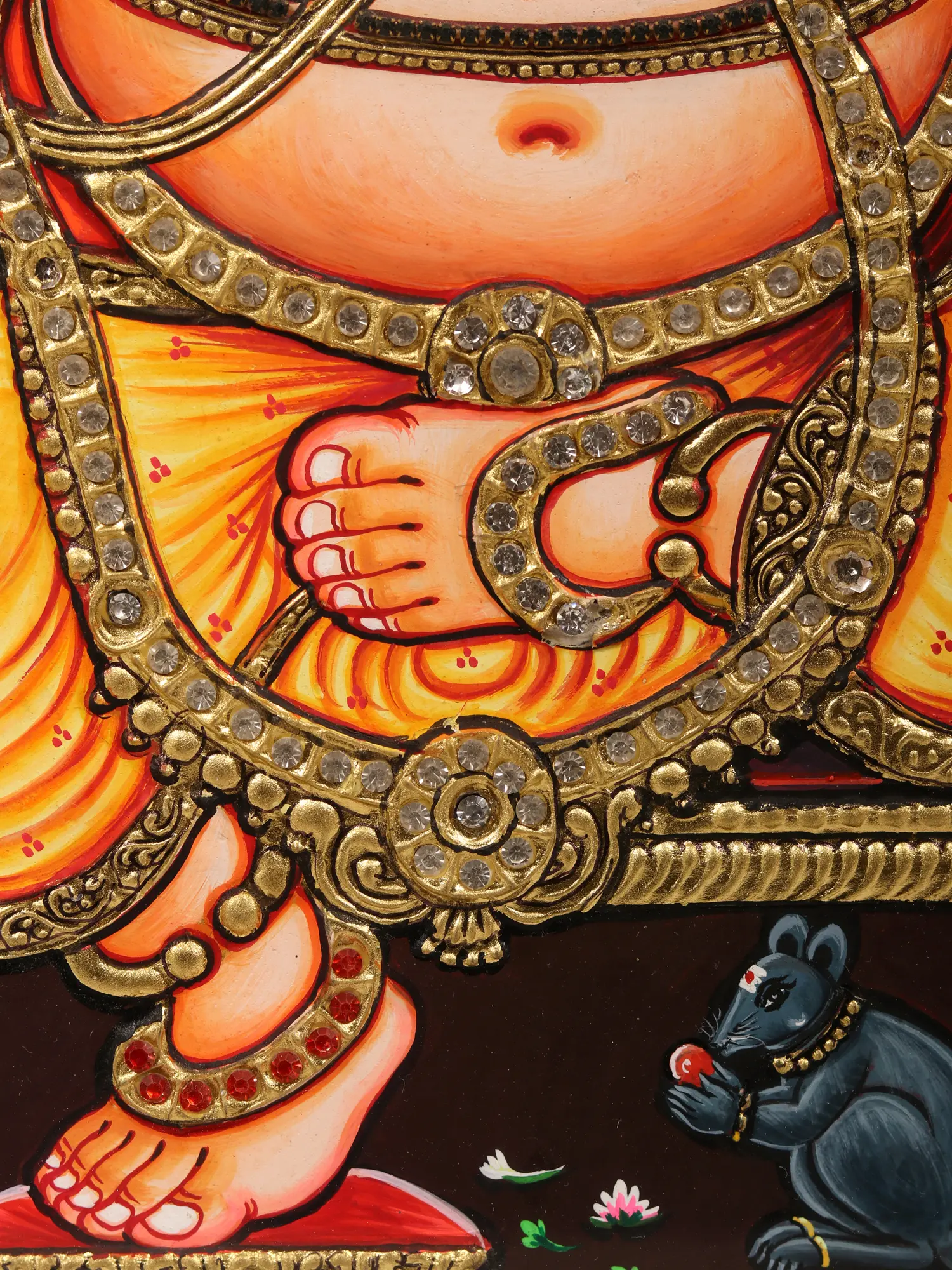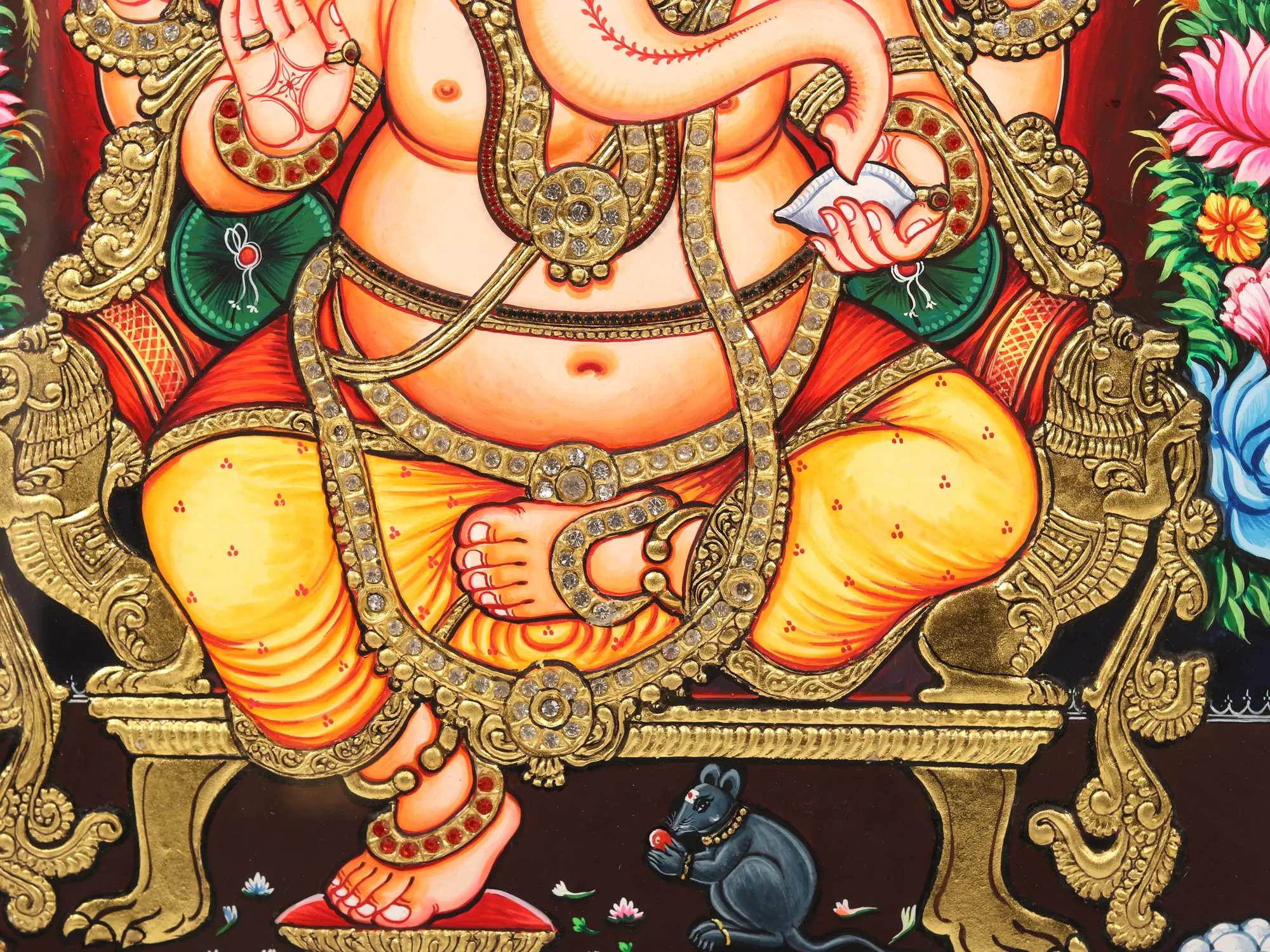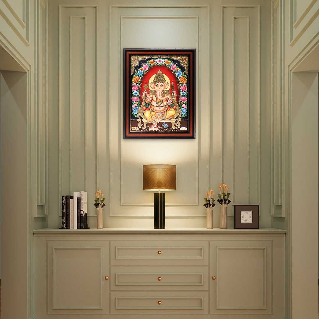 This Tanjore piece invites you to contemplate the convergence of worldly grandeur and spiritual transcendence. The ornate floral Prabhamandala serves as a divine backdrop, accentuating Lord Ganesha’s form seated atop a resplendent throne. It's a visual metaphor for the coexistence of material opulence and inner poise, encouraging us to seek the profound within the ostentatious.