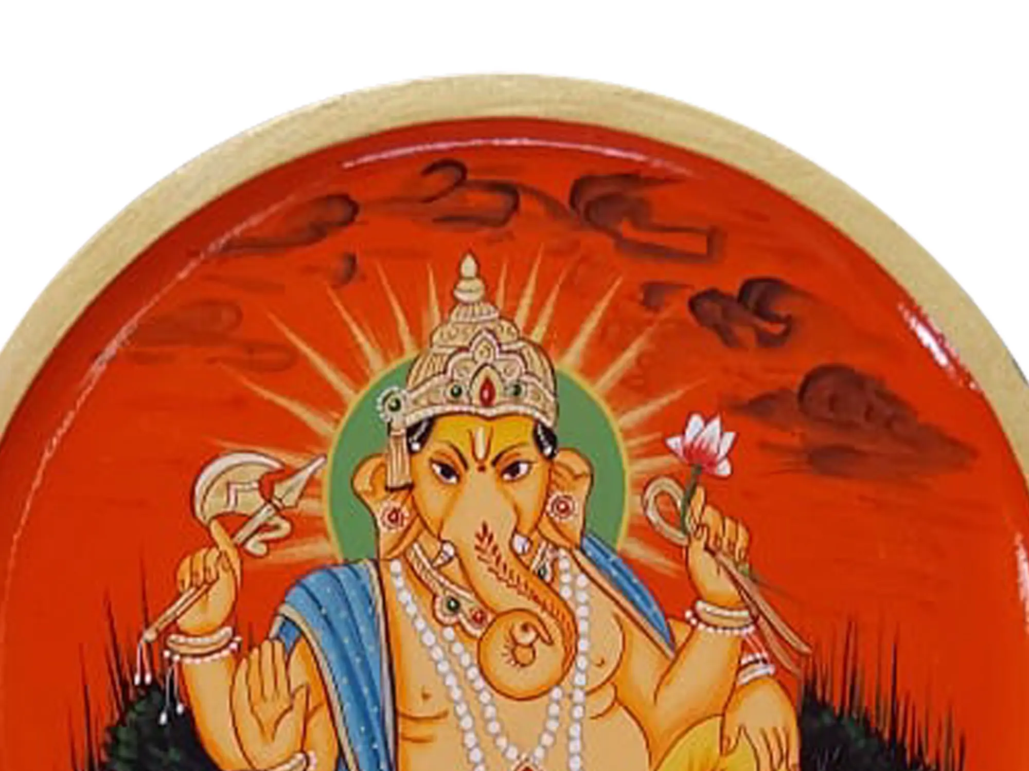 This depiction draws inspiration from the rich tapestry of Hindu mythology, celebrating Lord Ganesha as the elephant-headed god of wisdom, intellect, and new ventures. He is revered as the patron of arts and sciences and the deva of intellect and wisdom. The circular form itself, measuring ten inches in diameter, often symbolizes the cyclical nature of existence and the universe, echoing ancient cosmological understandings and bringing a timeless spiritual resonance to its presence.