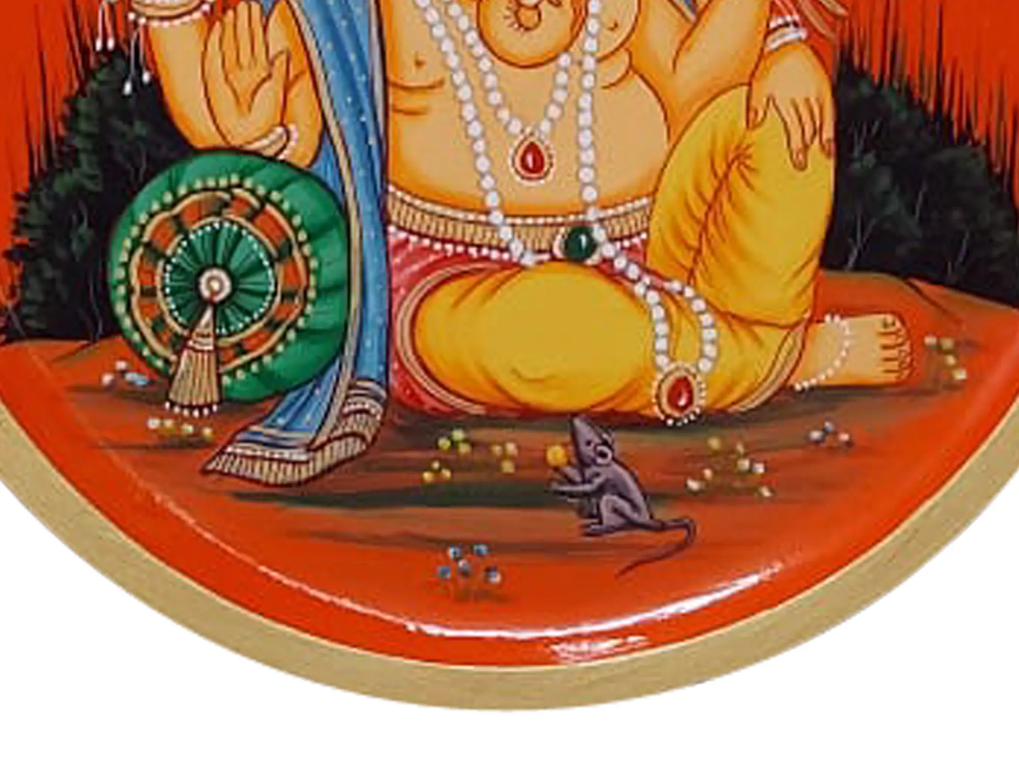 Observe the captivating depiction of the four-armed deity, seated serenely and radiating a gentle energy. The radiant sunburst behind him symbolizes his cosmic power and enlightenment. His serene expression, adorned with ornate jewelry and flowing silks in shades of blue and yellow, draws you into a world of devotion. Even the subtle presence of his vahana, the mouse, and the lotus flower he holds are rendered with an exquisite attention to detail, enhancing the overall richness and narrative of the composition.