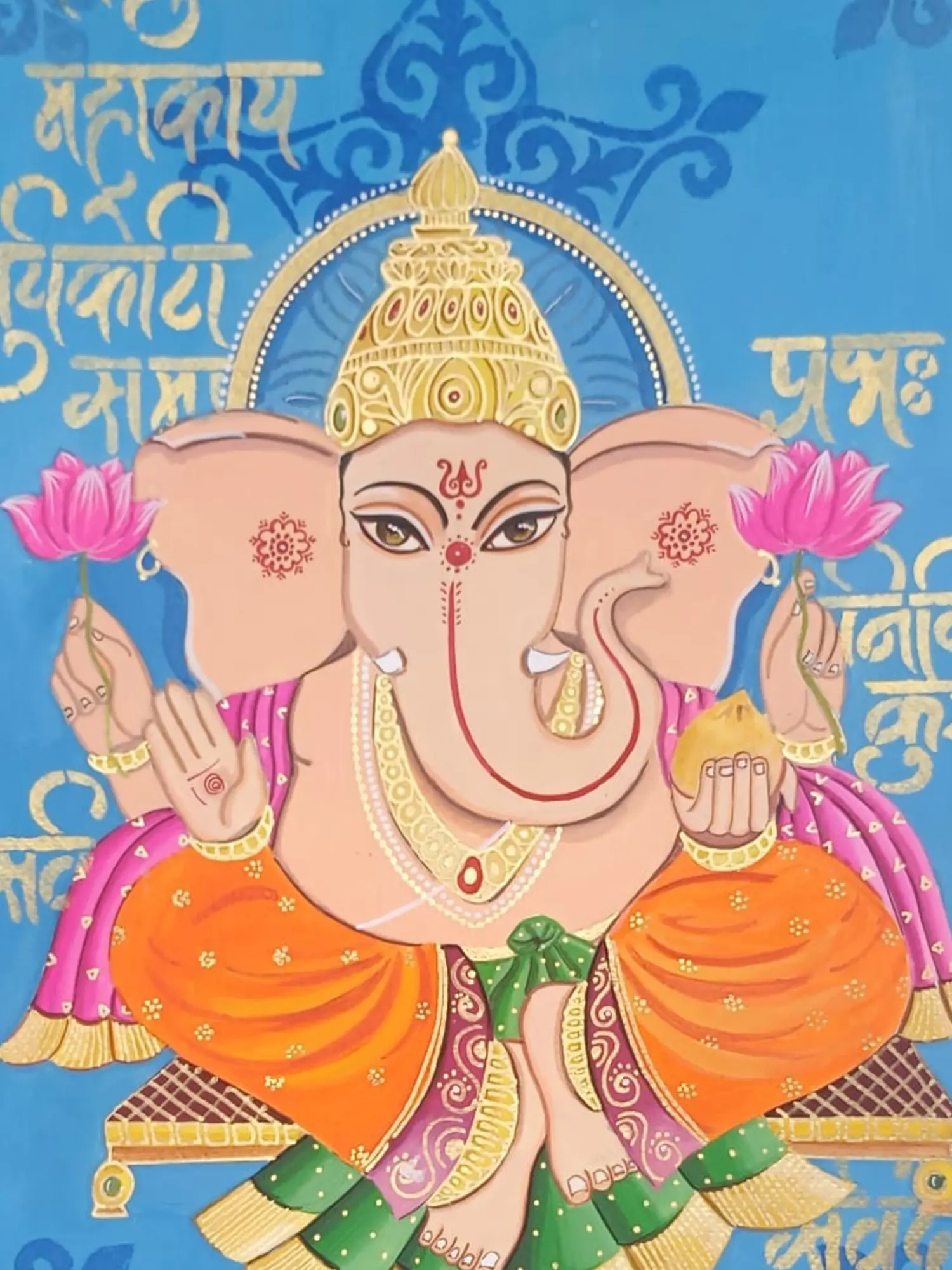 Observe the divine form rendered with striking clarity, from the gentle gaze of the deity to the delicate details of the lotus blossoms held in each hand. The rich gold accents, a hallmark of sacred art, gleam against the serene blue backdrop, while the vibrant orange and pink attire of the seated figure adds a touch of earthly splendor. The composition, measuring 16.5 inches in height and 11.8 inches in width, is both commanding and graceful, inviting contemplation.