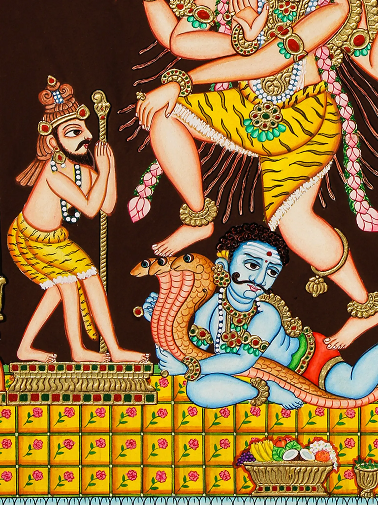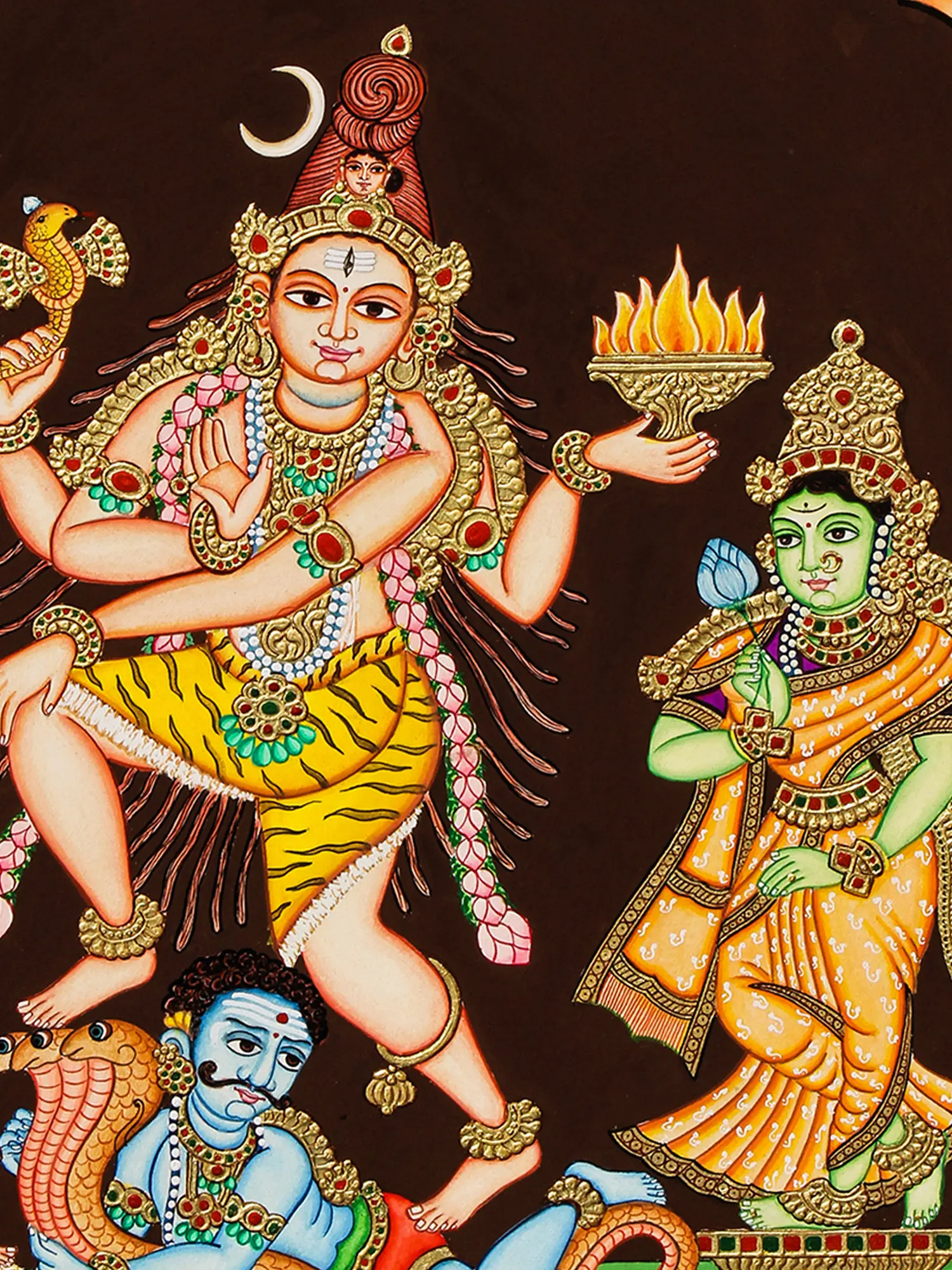 The painting depicts Markandeya in a dynamic, captivating posture – a dance reflecting his exceptional life and the many blessings bestowed upon him by Shiva. Markandeya, a rishi (sage) renowned for his unwavering devotion to Shiva, is believed to have attained immortality. His story is a testament to the power of faith and the blessings offered to true devotees. The four arms of the deity represent his profound connection with the divine, his control over the material world and his ability to traverse between the earthly and spiritual realms. The presence of other figures in the painting adds layers to this divine narrative, offering a glimpse into the rich tapestry of Hindu mythology.