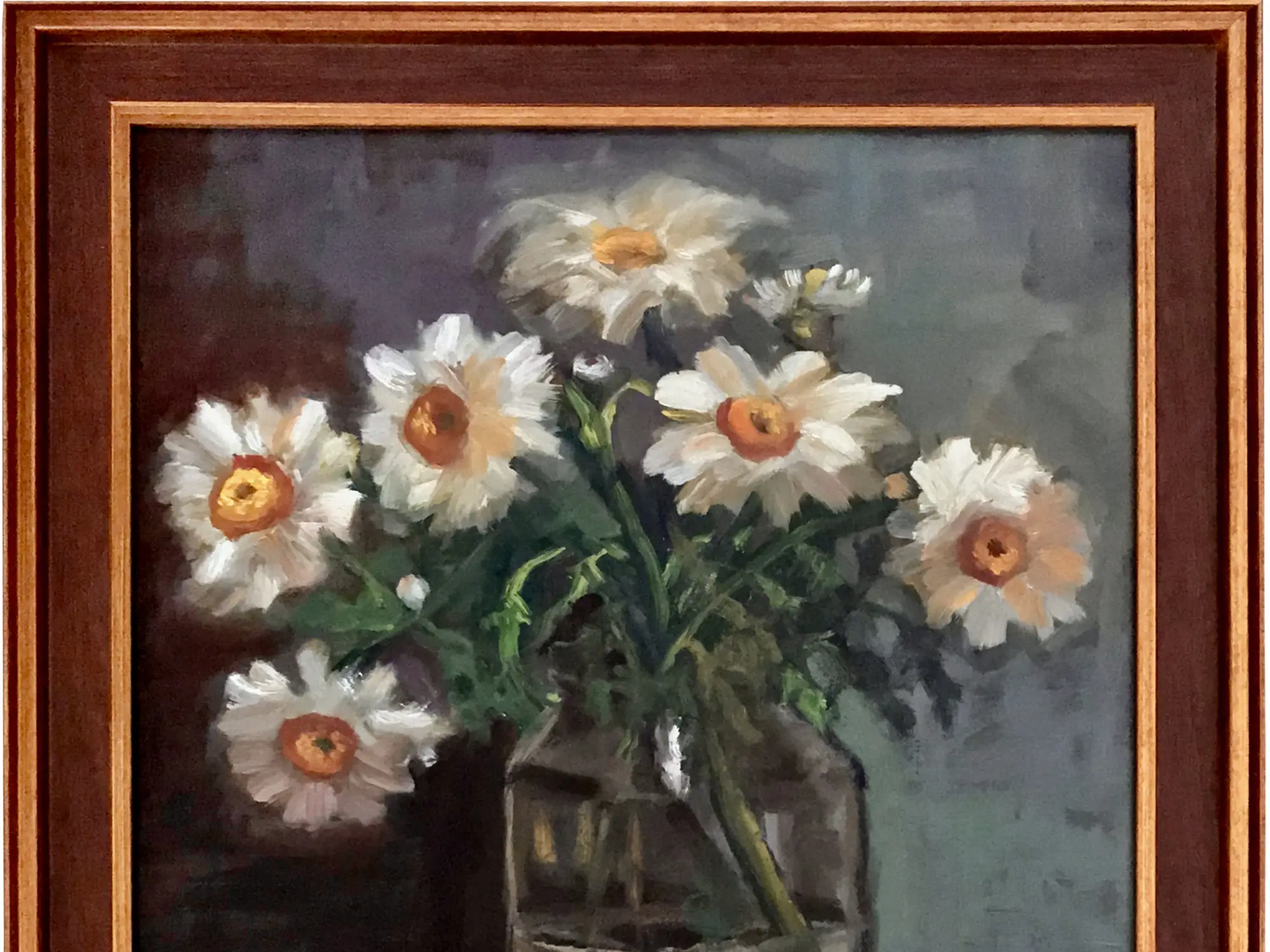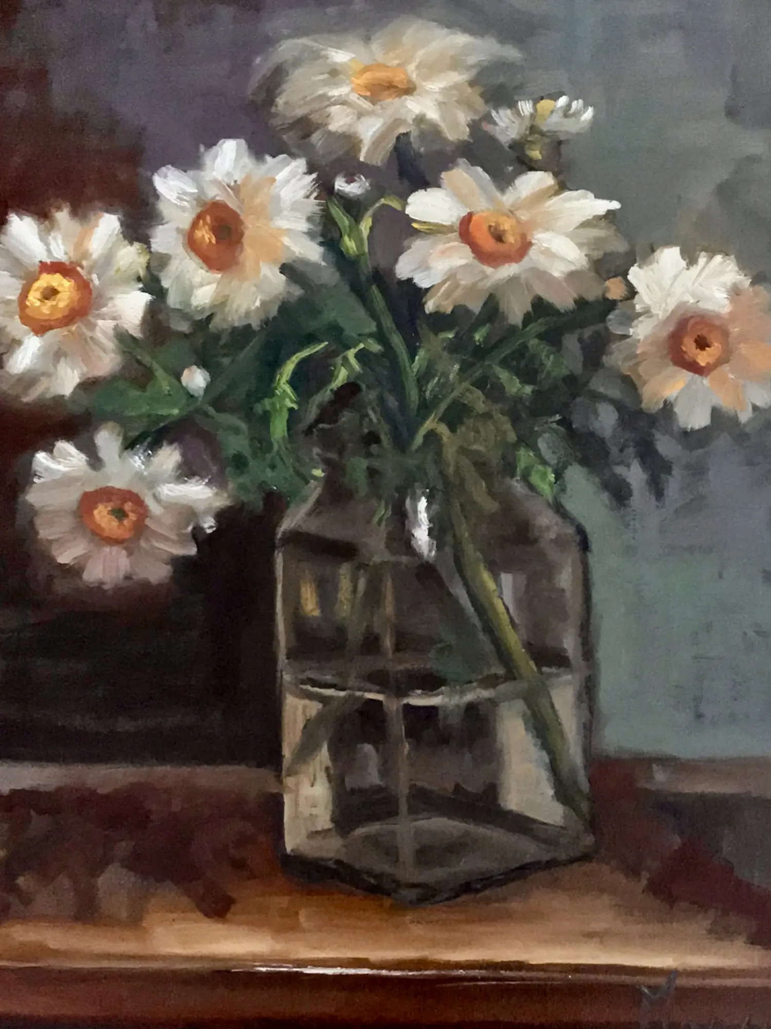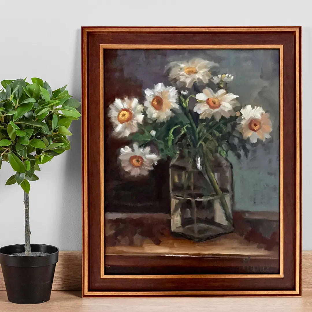 Daisies, often associated with purity, innocence, and new beginnings, lend a timeless and universally cherished symbolism to this piece. Their cheerful disposition has been celebrated across various cultures and artistic periods, making this representation a classic choice for those who appreciate enduring beauty.