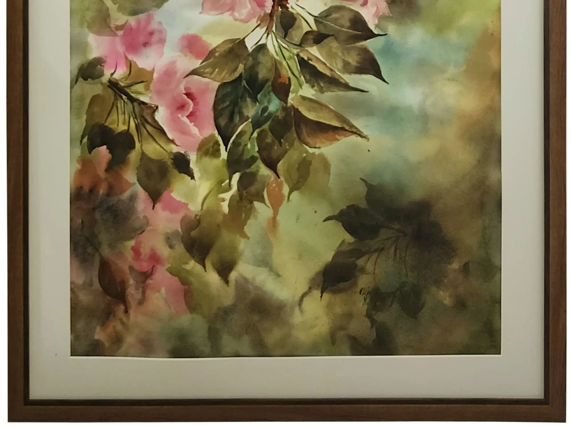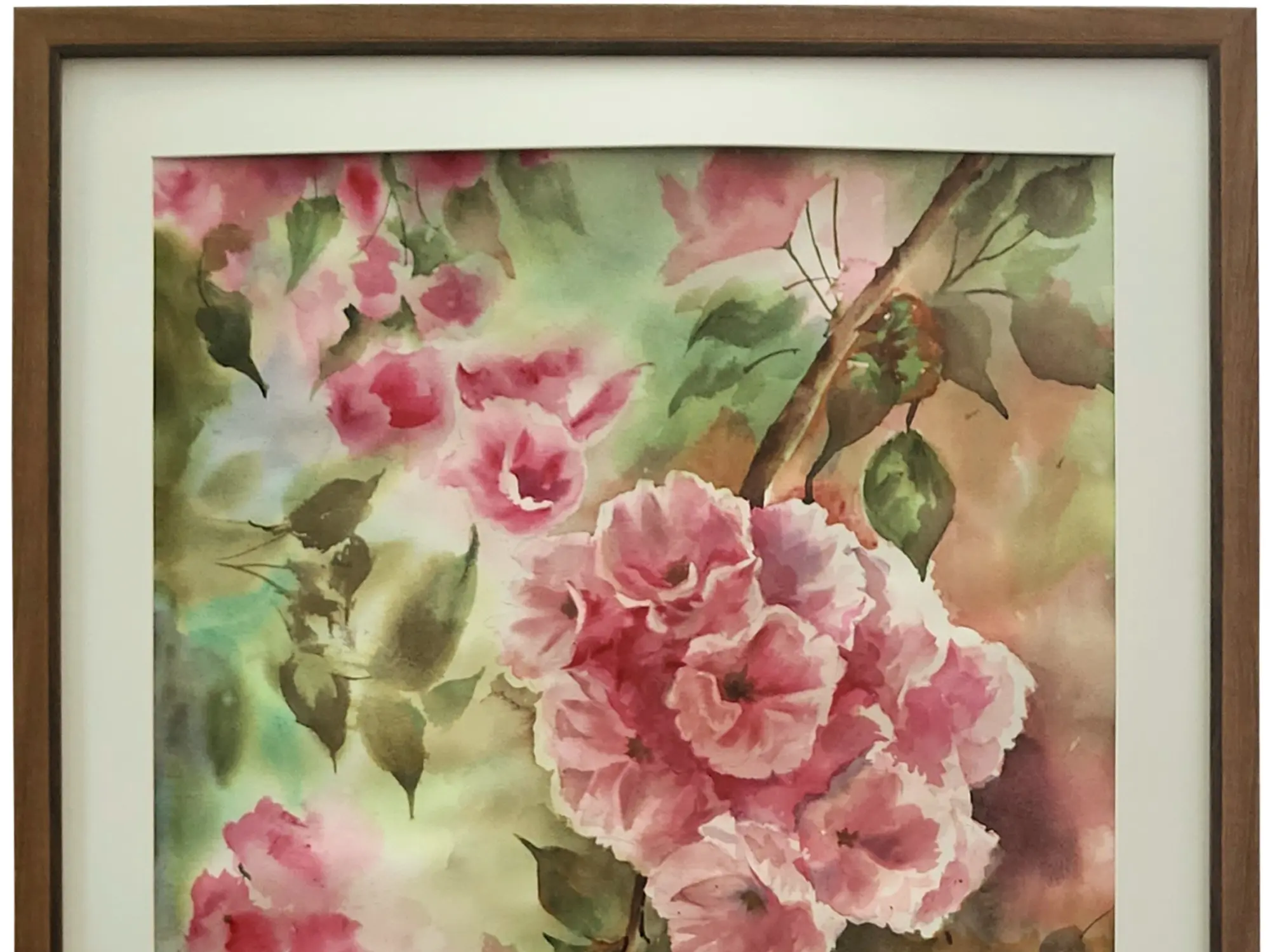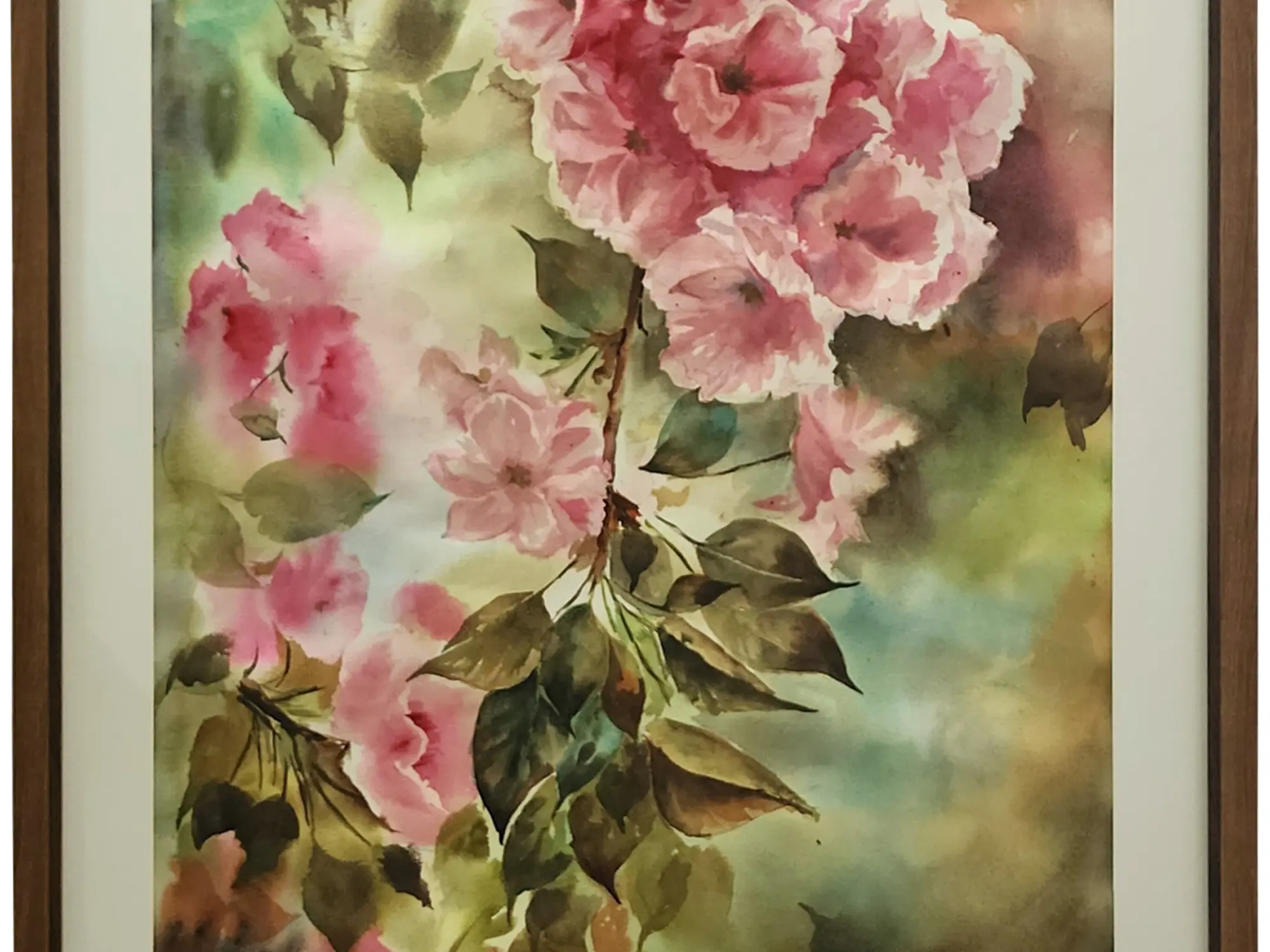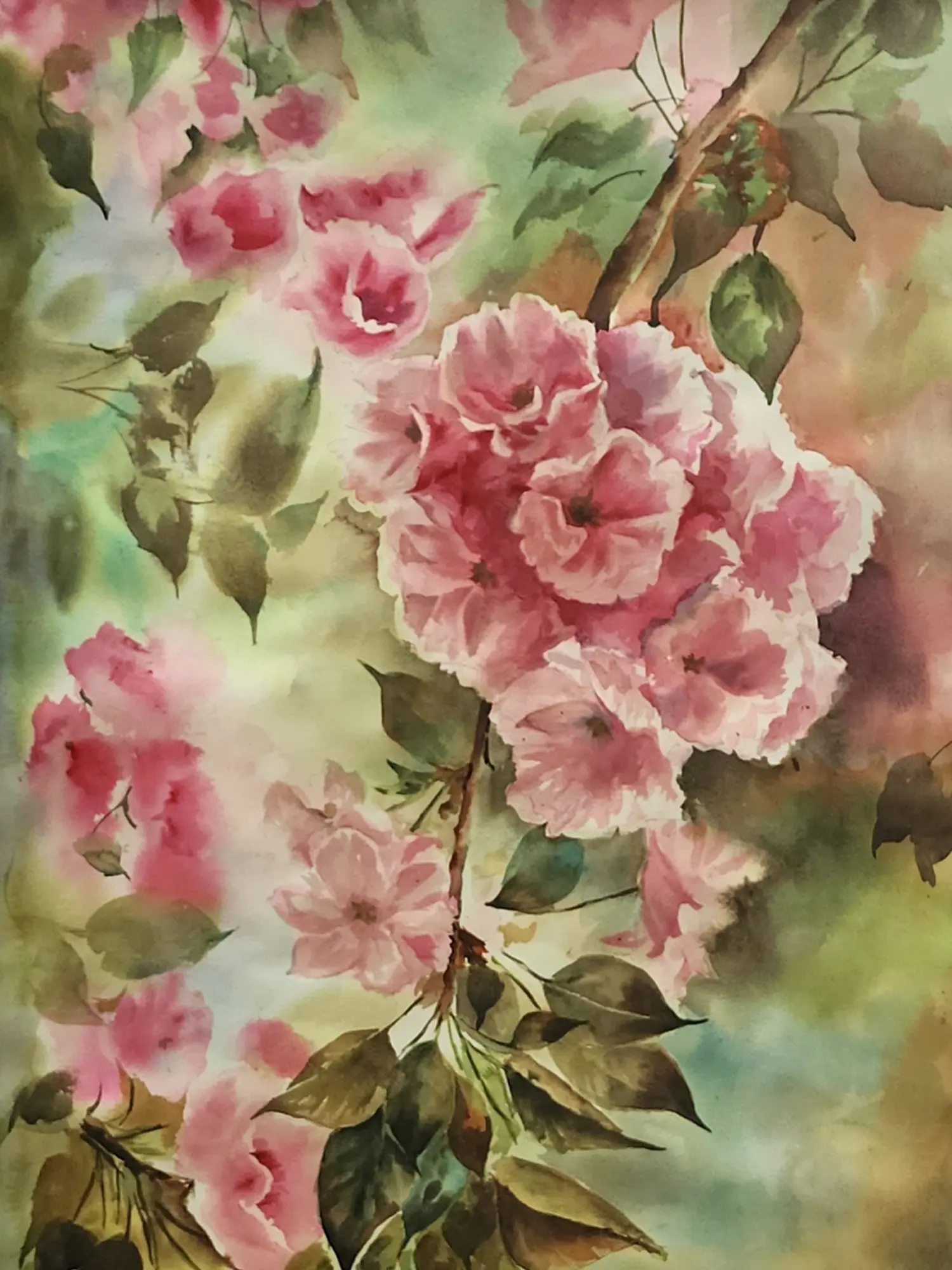 Observe how the vibrant pink blossoms cascade across the surface, their forms suggested with a remarkable lightness of touch. The artist skillfully employs varying degrees of opacity and transparency to give life to the petals and leaves, creating a rich depth of field. The interplay of soft greens and earthy browns in the background provides a beautiful contrast, allowing the subjects to truly stand out. The dimensions of 45 inches in height by 24 inches in width ensure it makes a significant yet elegant statement.