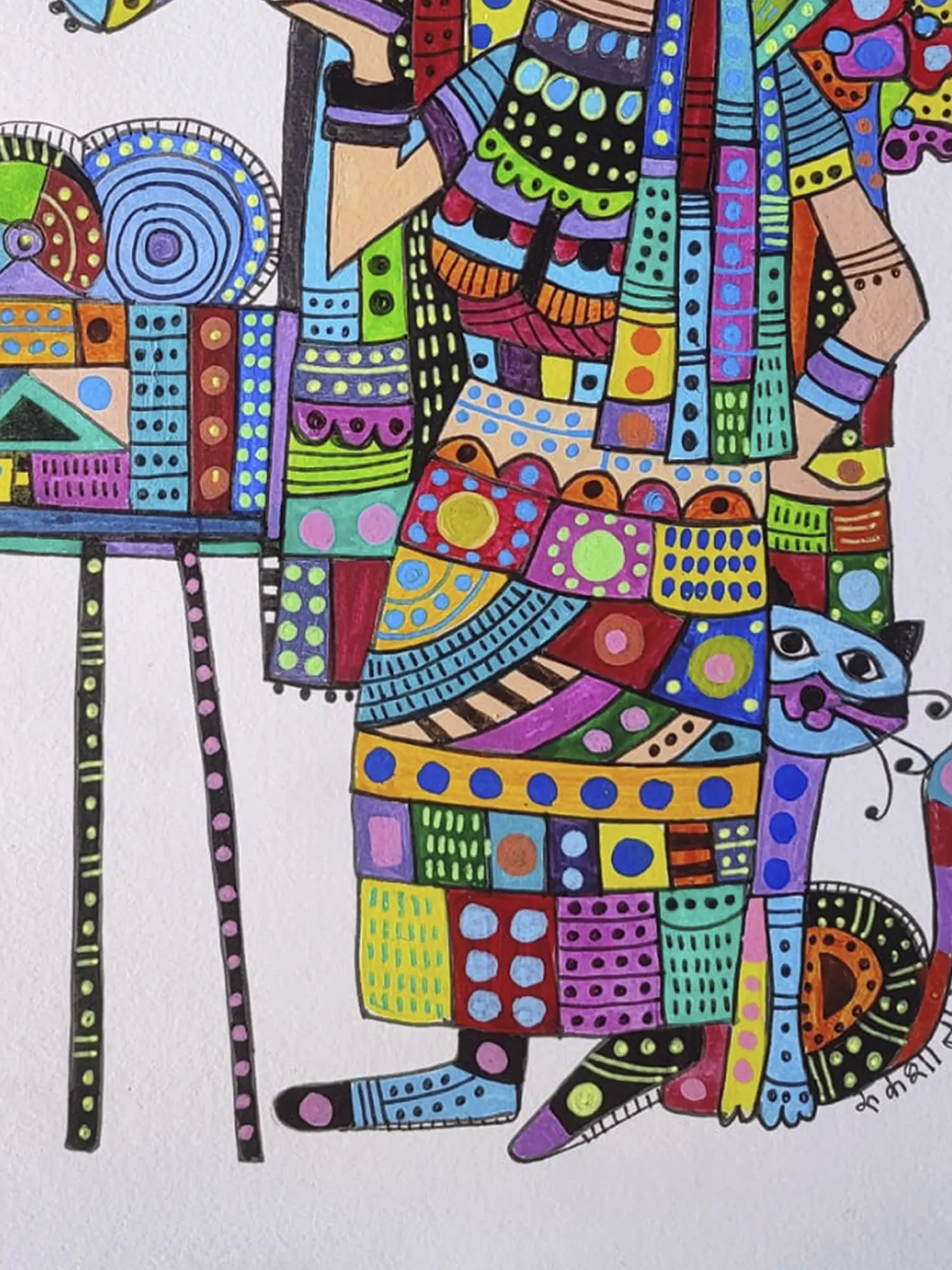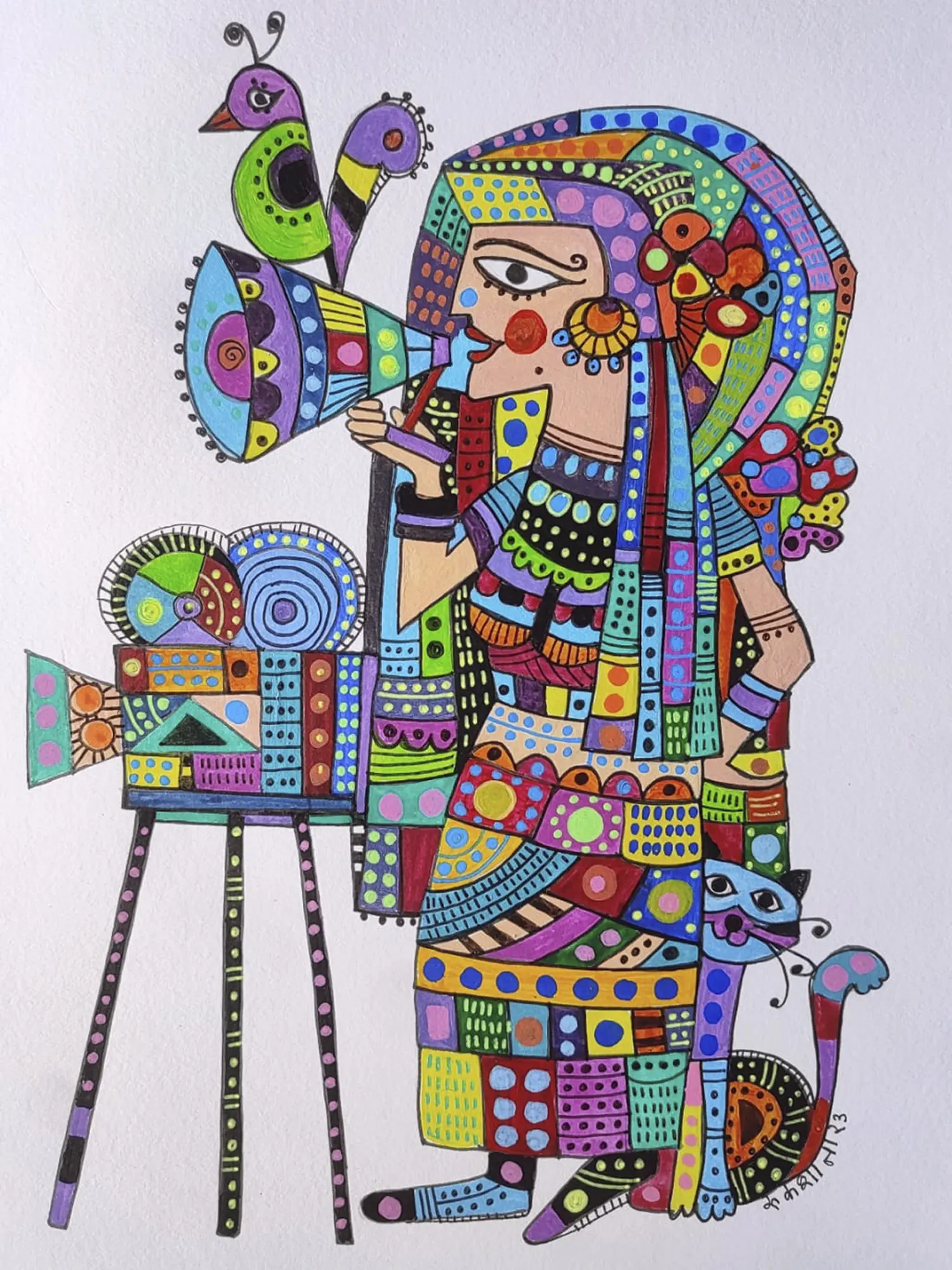 Observe the charming details that bring this scene to life: the retro cinematography device, adorned with playful geometric patterns, stands ready. Perched above, vibrant peacocks seem to whisper encouragement, their forms echoing the celebratory spirit of the subject. A contented feline companion rests nearby, adding a touch of domestic tranquility to the artistic endeavor. The interplay of bold lines and intricate patterns, rendered on paper measuring 11.69 inches in height and 8.27 inches in width, creates a dynamic and engaging visual experience.