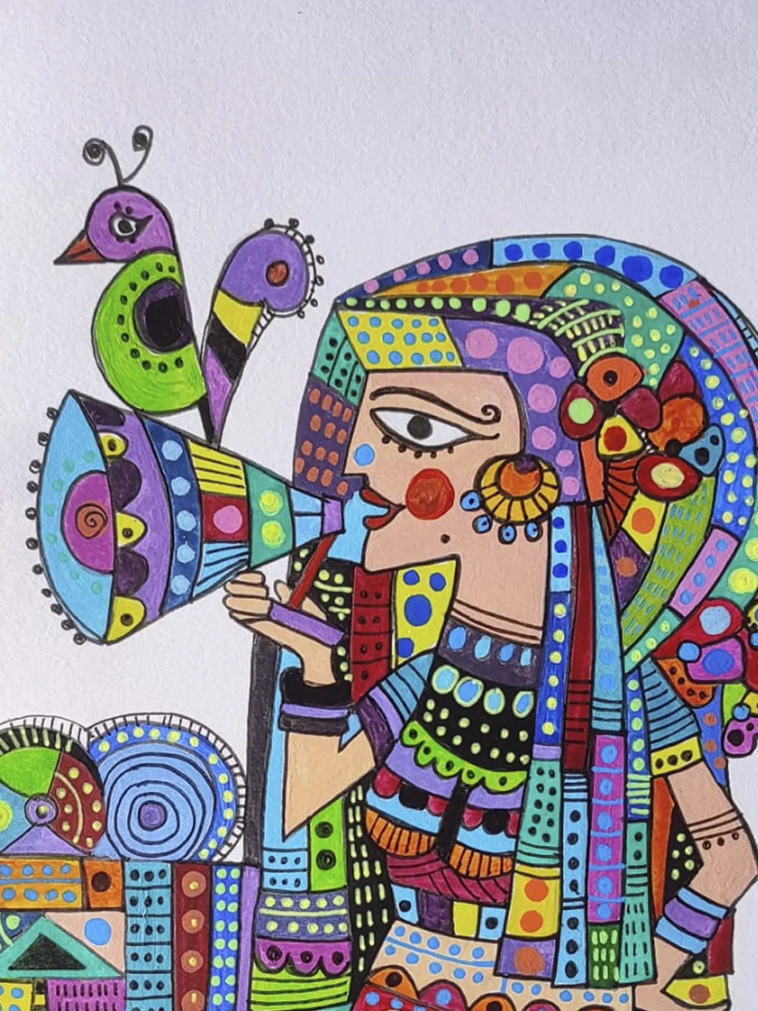 This exquisite piece is a testament to meticulous craftsmanship, born from the skilled hands of Rukshana Tabassum. Rich acrylics and precise ink lines are expertly layered onto fine paper, creating a visual tapestry that is both bold and delicate. Each stroke and hue is thoughtfully applied, revealing an arresting composition that speaks to a deep understanding of form and color, showcasing the artist's signature style.