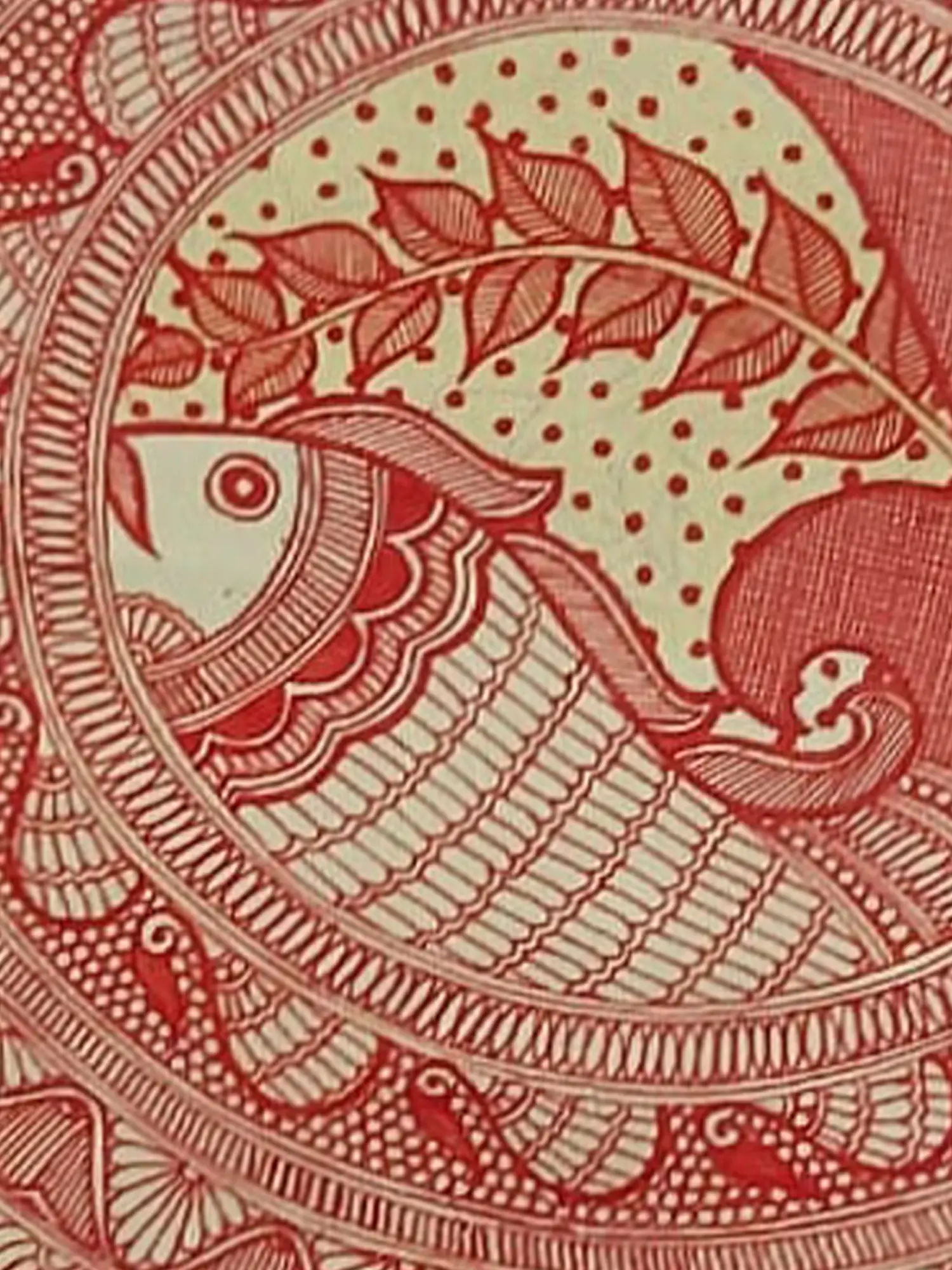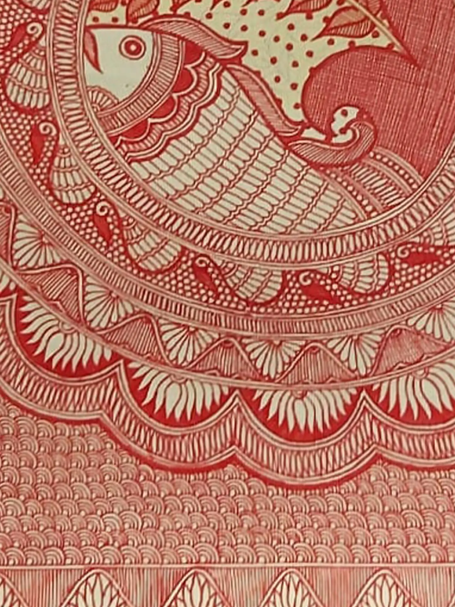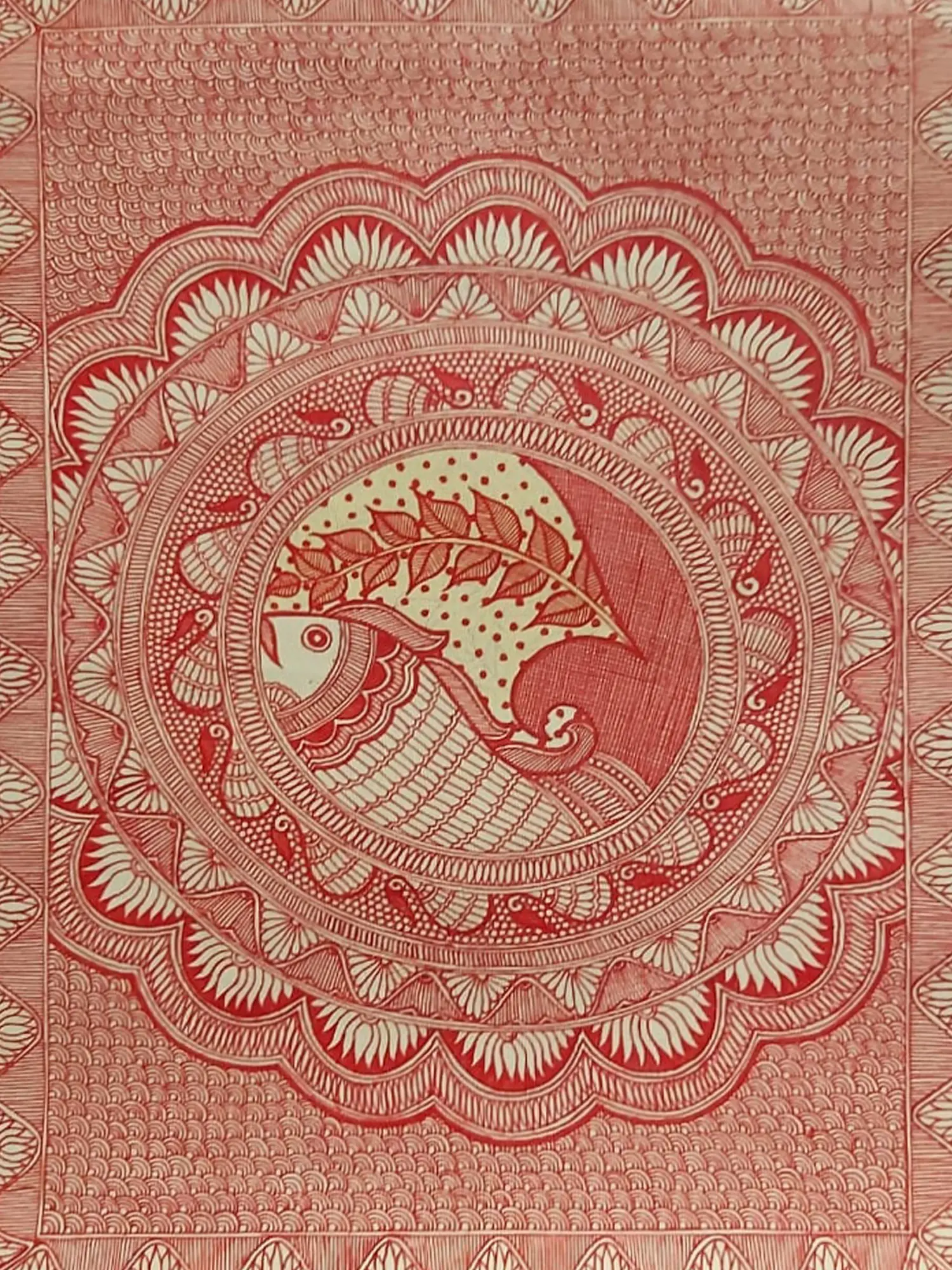 Dominated by a striking motif, the composition draws you into its intricate details and harmonious balance. The rich, natural pigments, primarily in a vibrant red and cream palette, create a visual depth that is both bold and elegant. Measuring 30 inches in height and 22 inches in width, its generous dimensions ensure it commands attention, becoming a focal point in any setting.