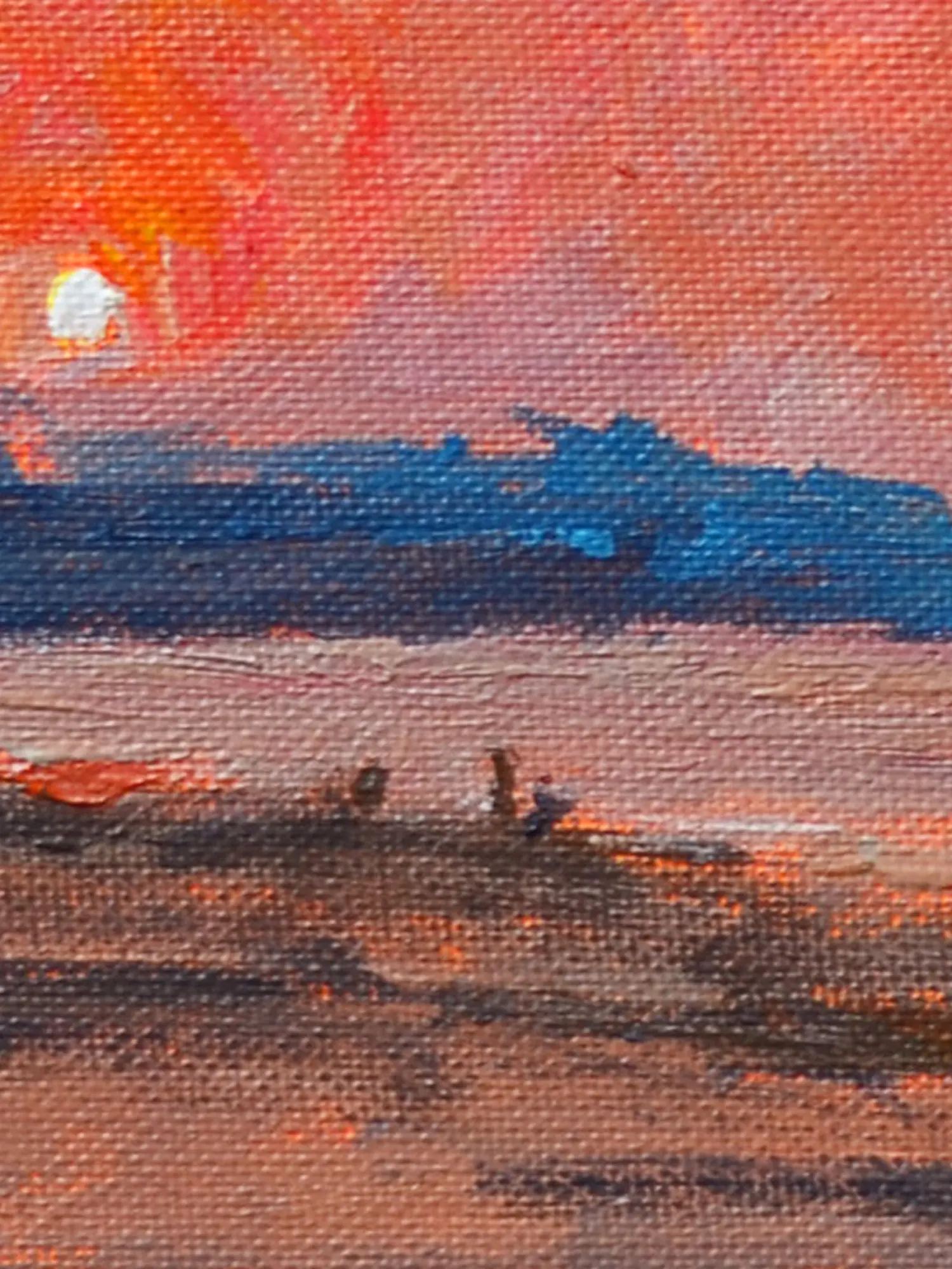 The canvas measures 9 inches in height and 11 inches in width, a perfect size to command attention without overwhelming your space. Observe how the artist masterfully employs a spectrum of warm oranges, fiery reds, and deep blues to depict the sun's descent. The subtle rendering of figures on the shore adds a human element, grounding the expansive sky and sea in relatable presence.