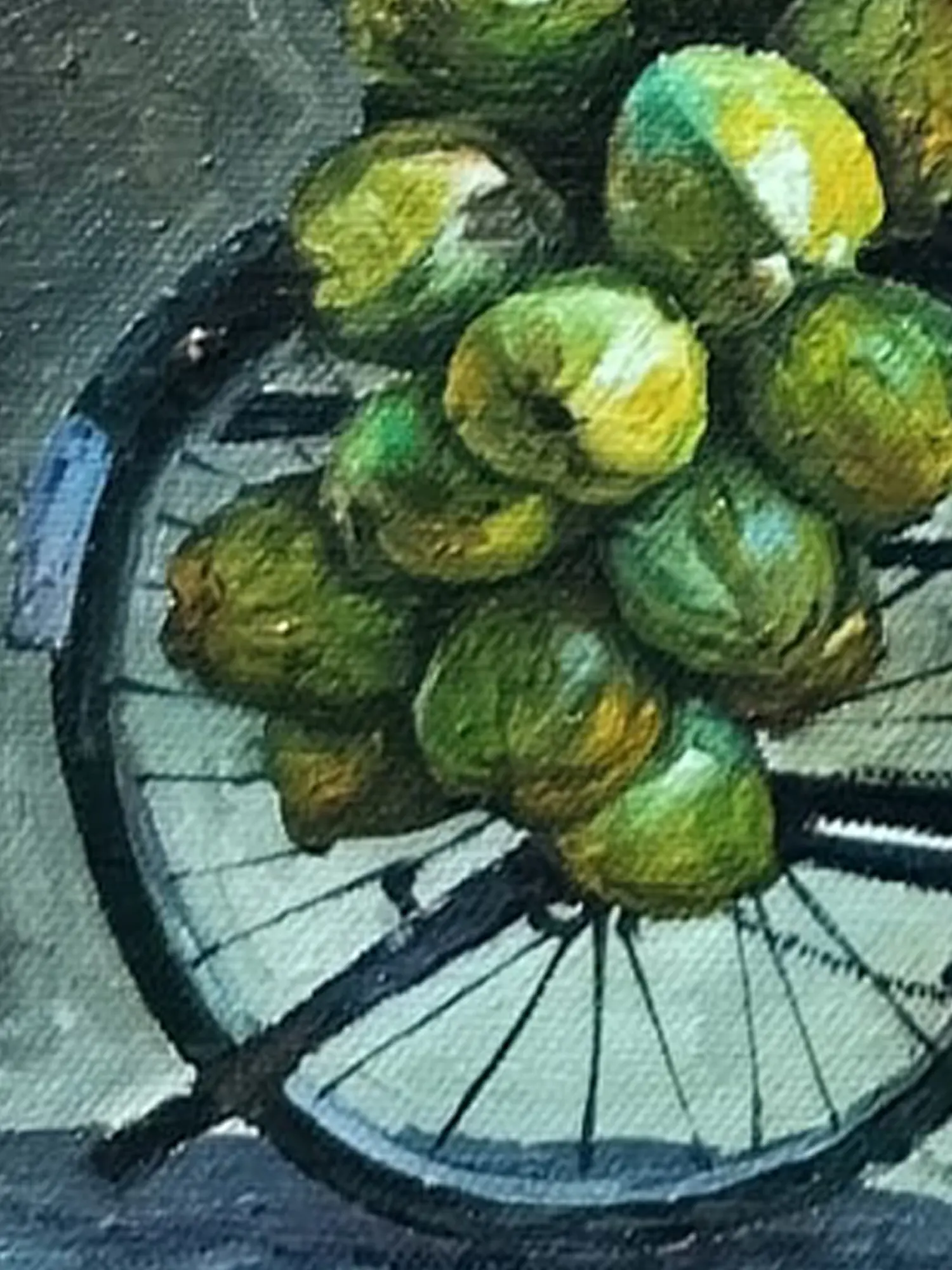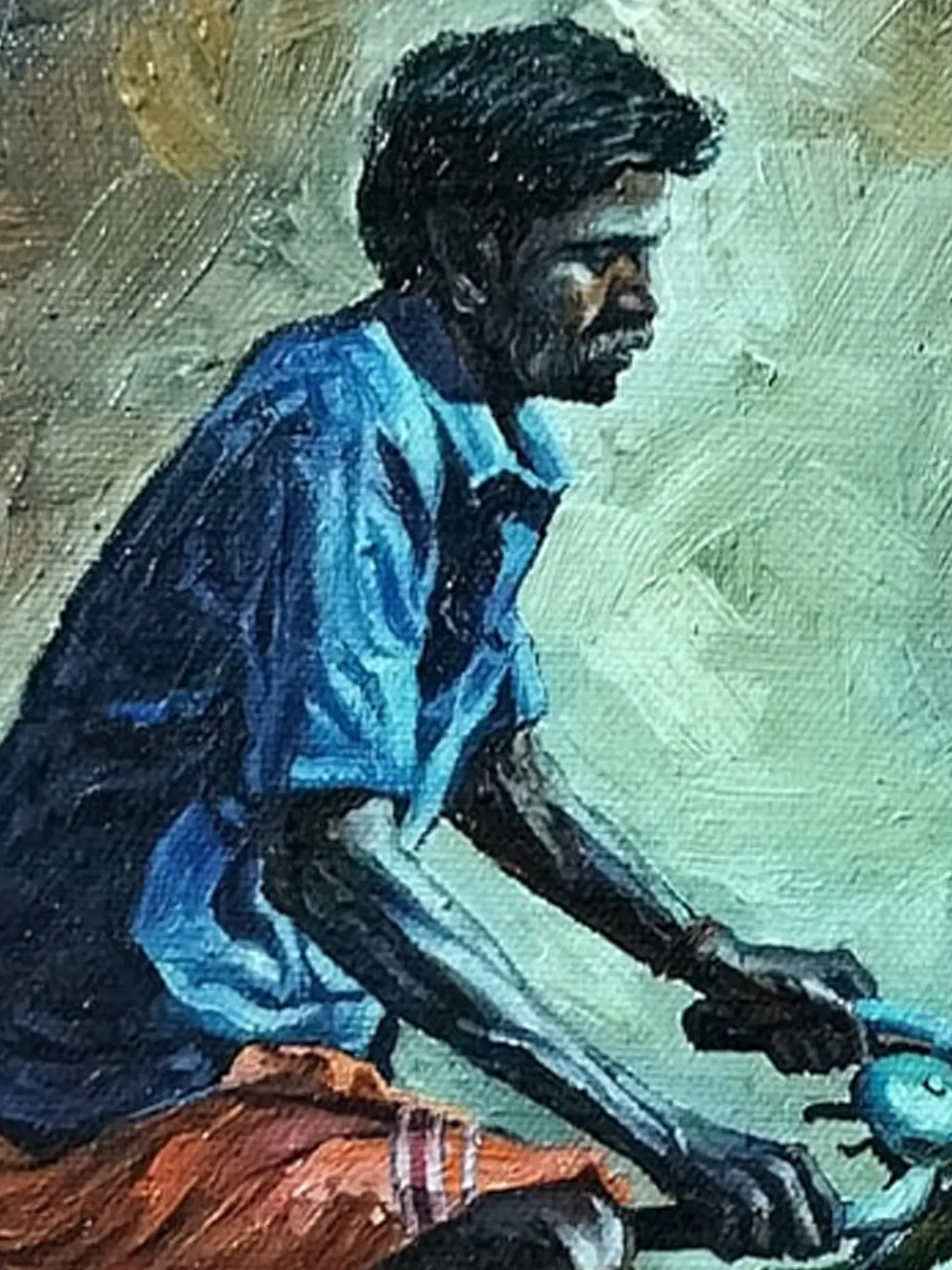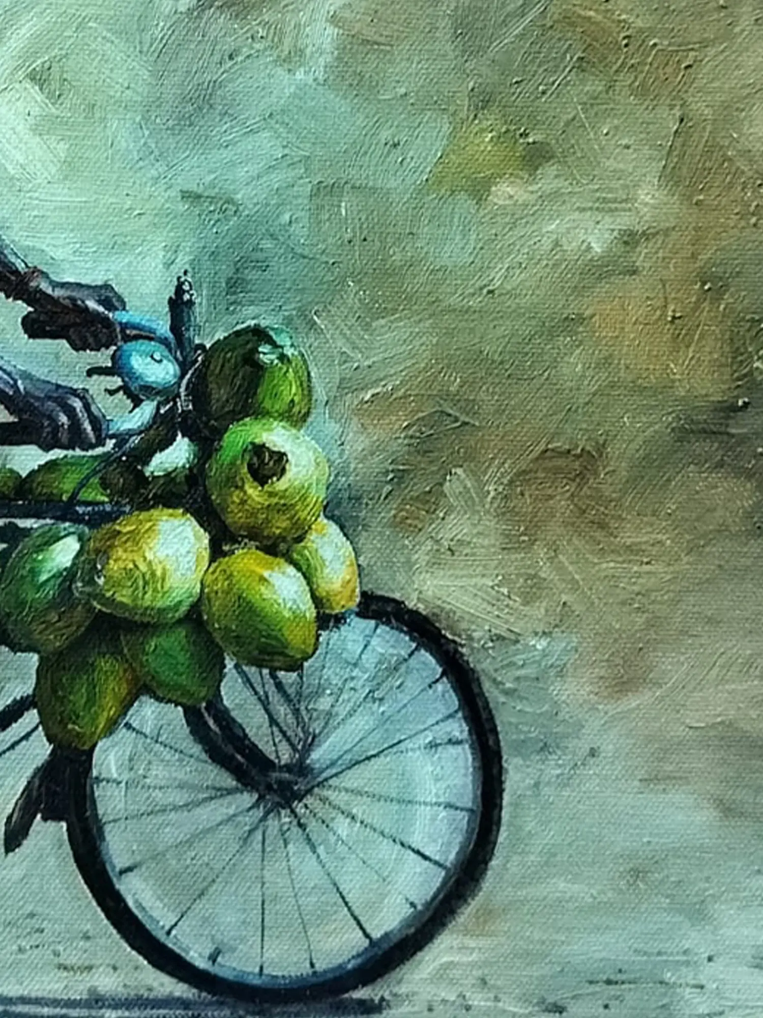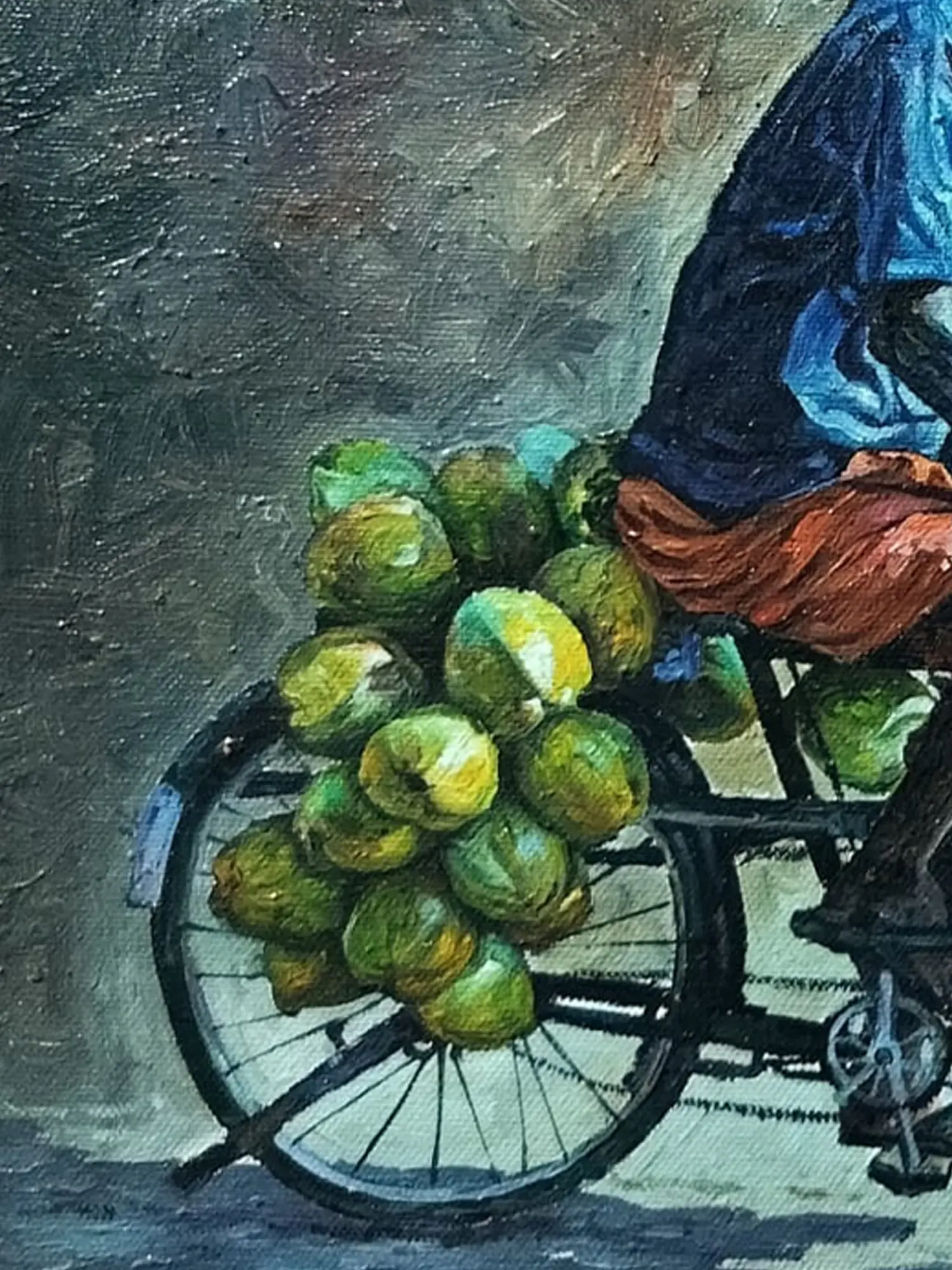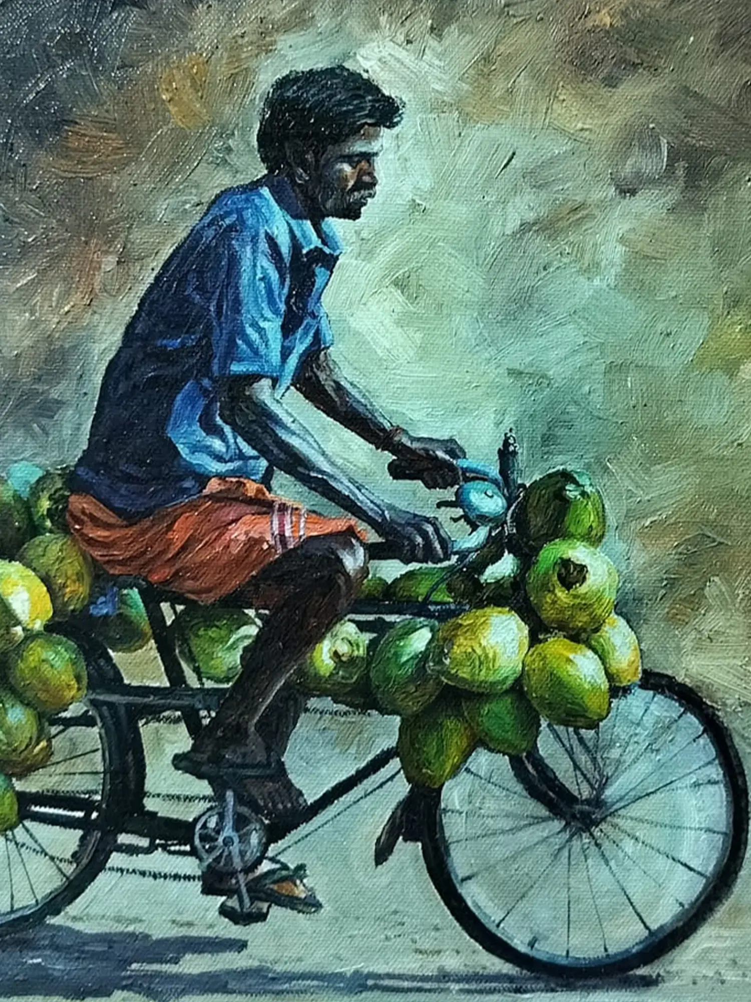 Capture the essence of everyday life with this charming watercolour portrayal on paper -, the coconut seller navigates the urban landscape with grace and resilience, riding his bicycle. This artwork celebrates the simplicity and beauty of human connection, inviting viewers to pause and appreciate the quiet moments of everyday existence that weave the tapestry of life.