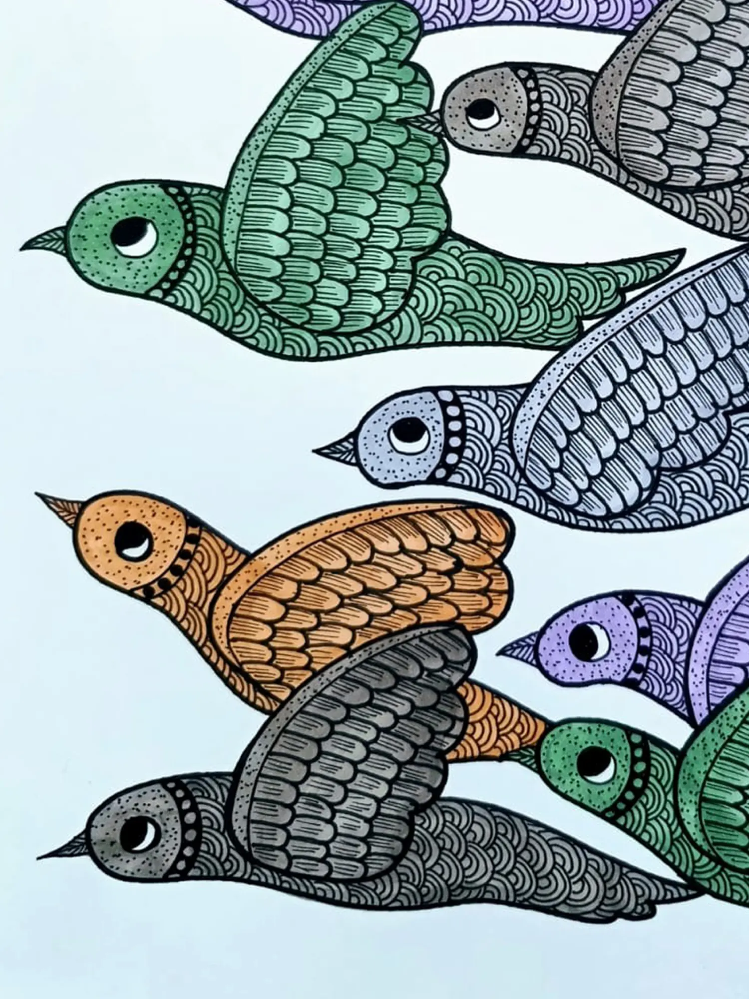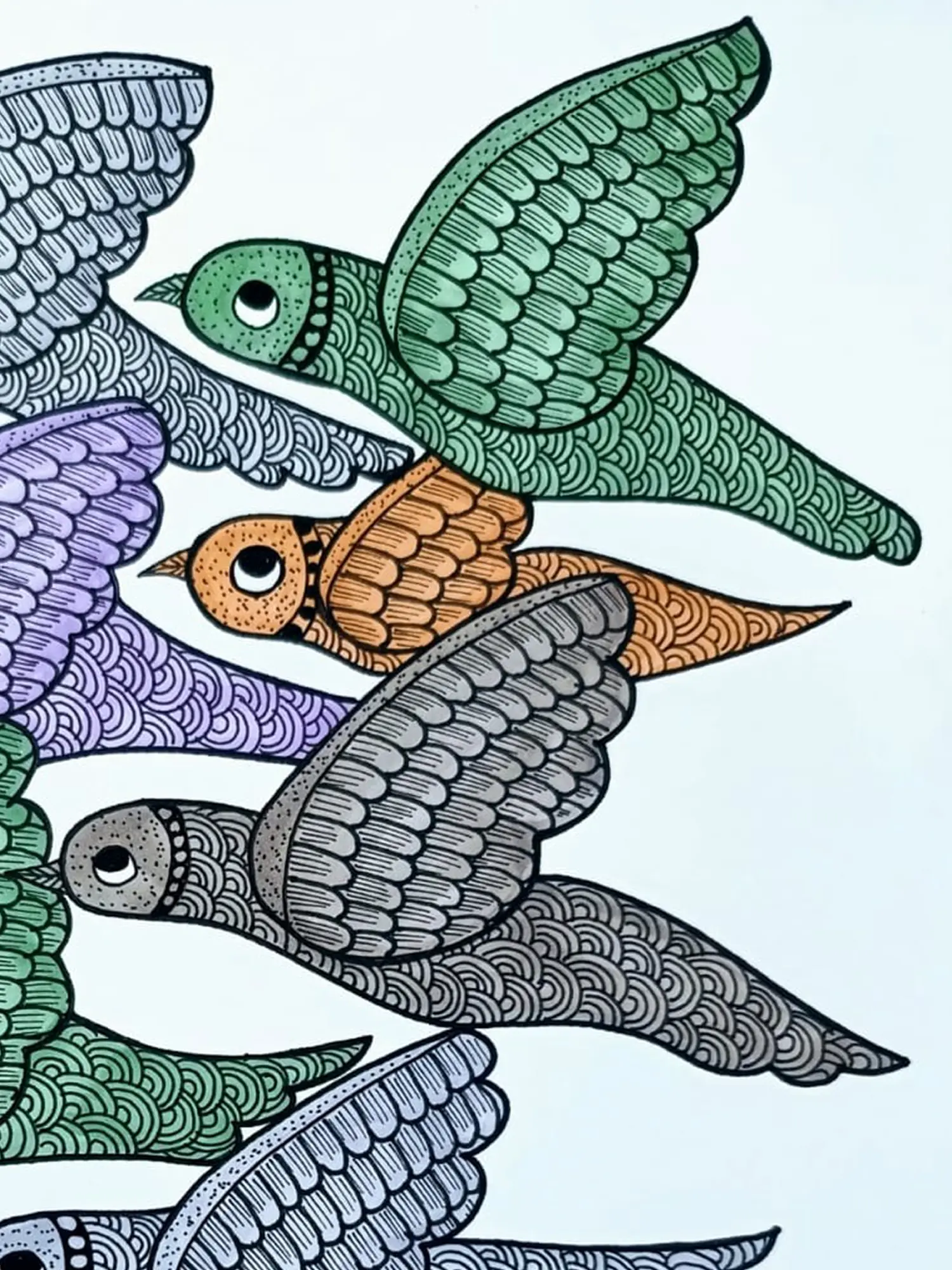 Ruchi skillfully intertwines new-age techniques with traditional Gond art in her masterpiece "Colorful Birds." Implementing Alcohol Markers and Fineliners, she brings vibrant life to the canvas while adhering to the sacred Gond tradition where birds symbolize freedom. Gond art, known for its mythical motifs and intricate patterns, finds a contemporary twist as the artist introduces modern mediums.