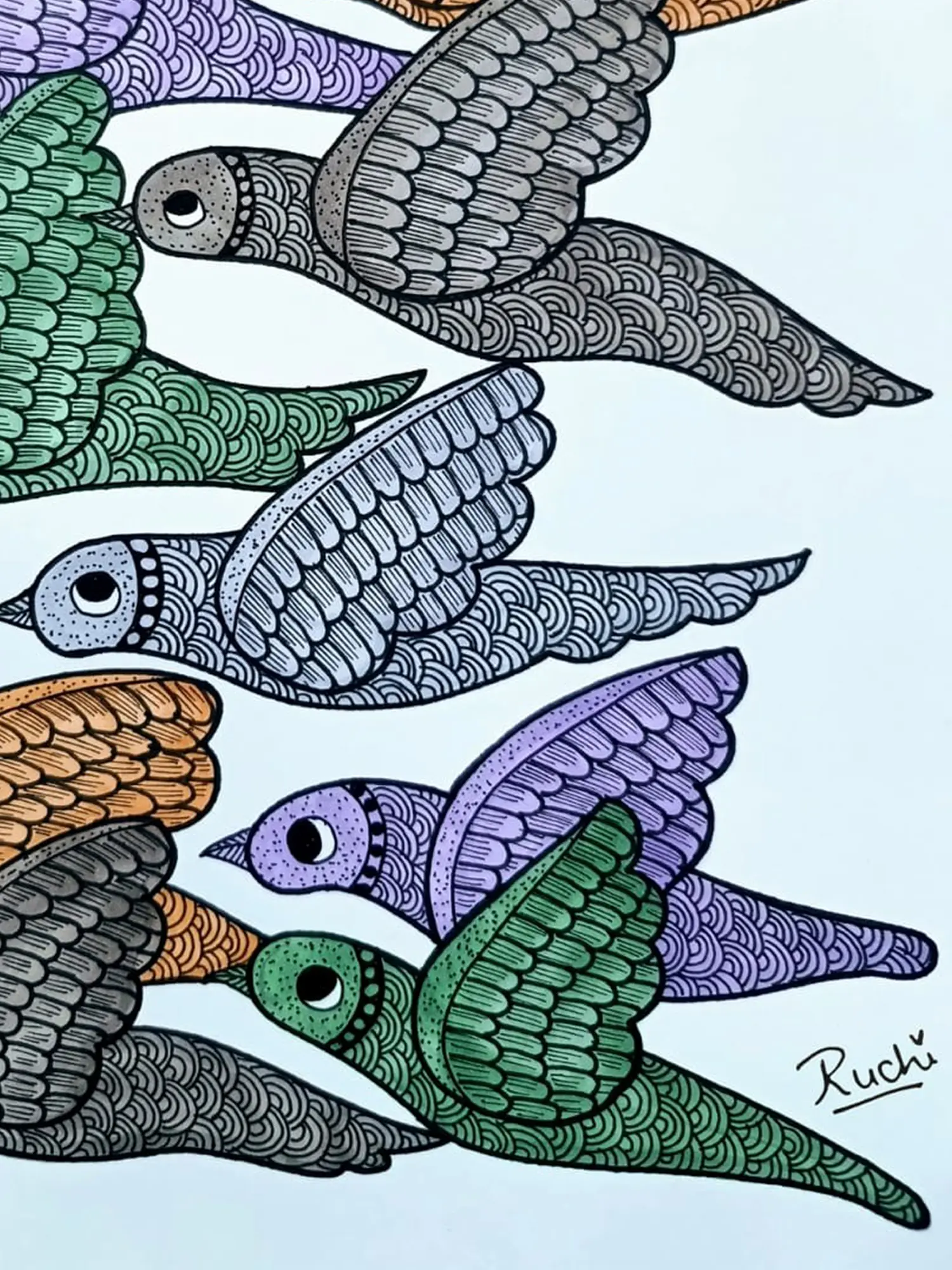 The Colorful Birds piece not only celebrates the harmonious relationship between humans and animals but also showcases the versatility of this ancient art form. The vivid color palette, intricate detailing, and symbolic representation make Ruchi's creation a captivating blend of tradition and innovation.
