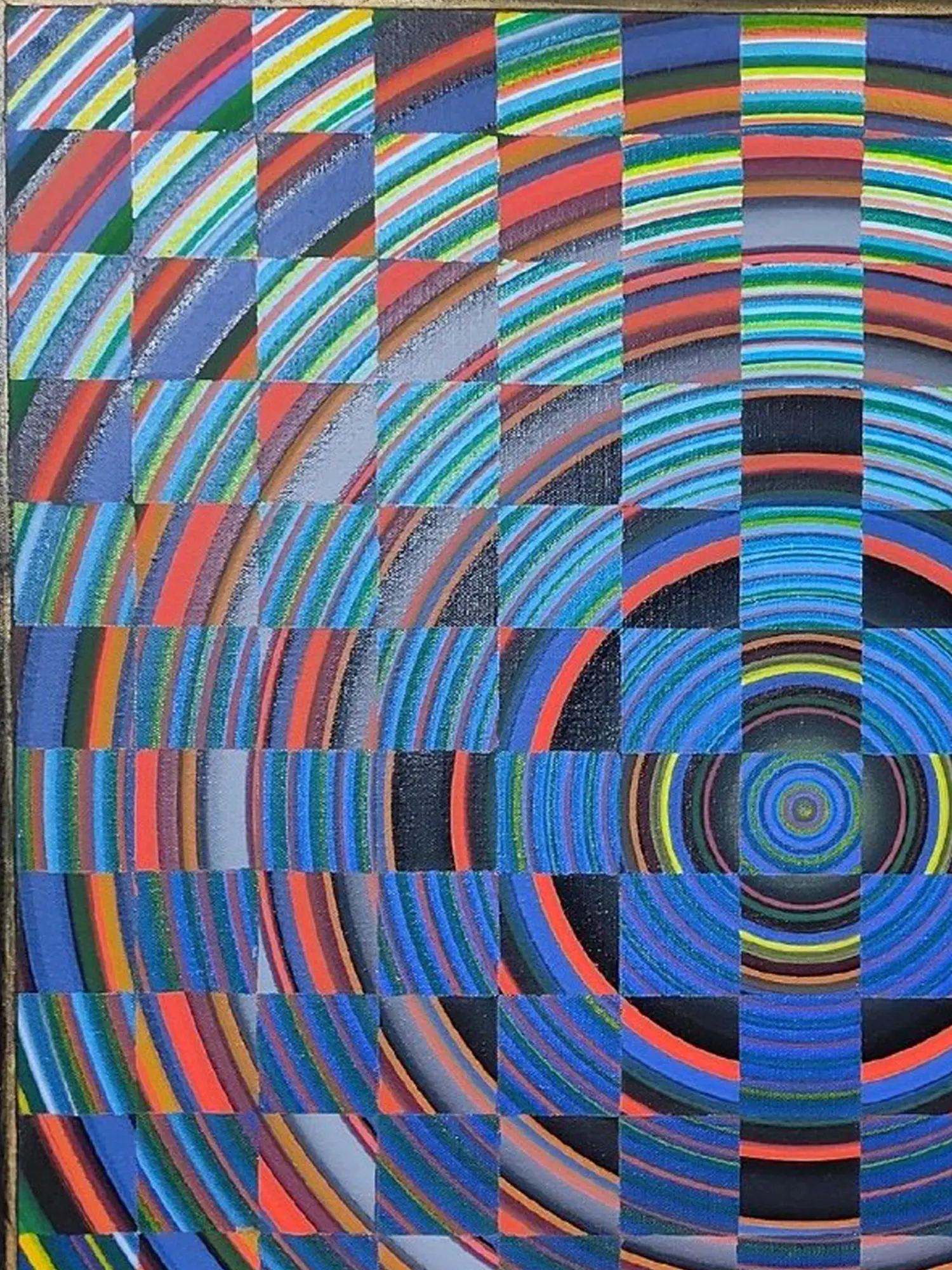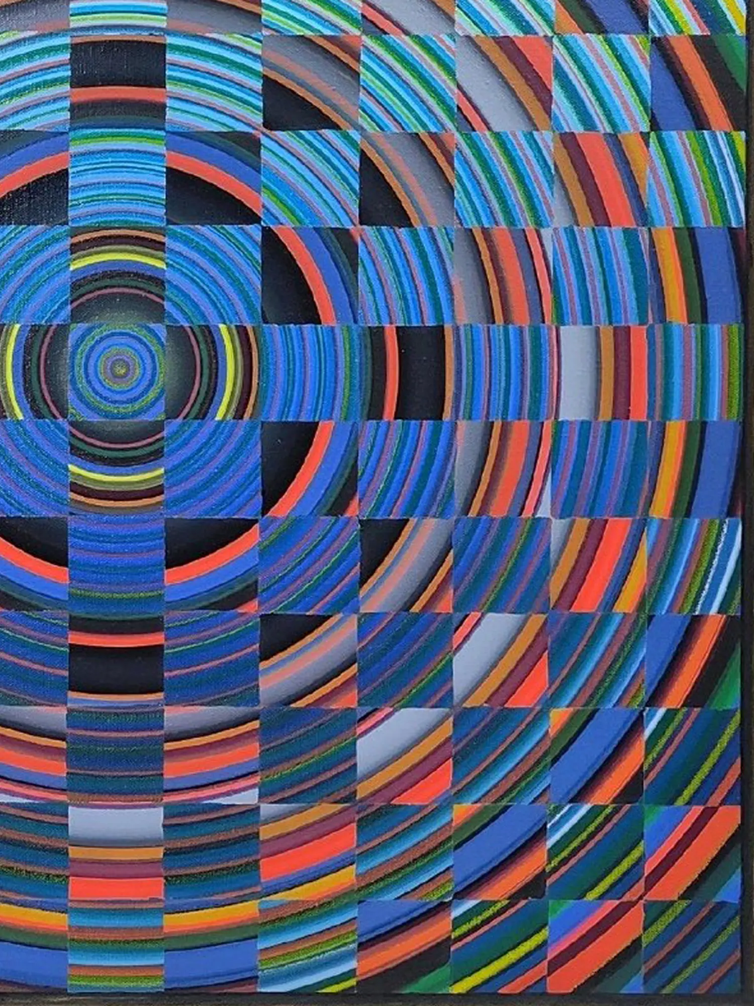 Prepare to be captivated by this vibrant and intricate abstract artwork, a mesmerizing creation rendered in acrylic on canvas. The painting presents a complex interplay of color and form, inviting viewers into a world where logic bends and the imagination soars. The composition revolves around a concentric checkerboard design, creating an optical illusion that dances before the eyes. The carefully chosen palette blends cool blues and grays with bursts of fiery reds and oranges, generating a sense of dynamic tension and visual harmony. Each square within the checkerboard contains a segment of an arcing line, contributing to the overall circular motion that emanates from the painting's core. This technique gives the artwork a sense of depth and dimensionality, drawing the viewer deeper into its intricate layers. The artist's masterful use of color and line work creates a stimulating visual experience, evoking feelings of energy and creativity.