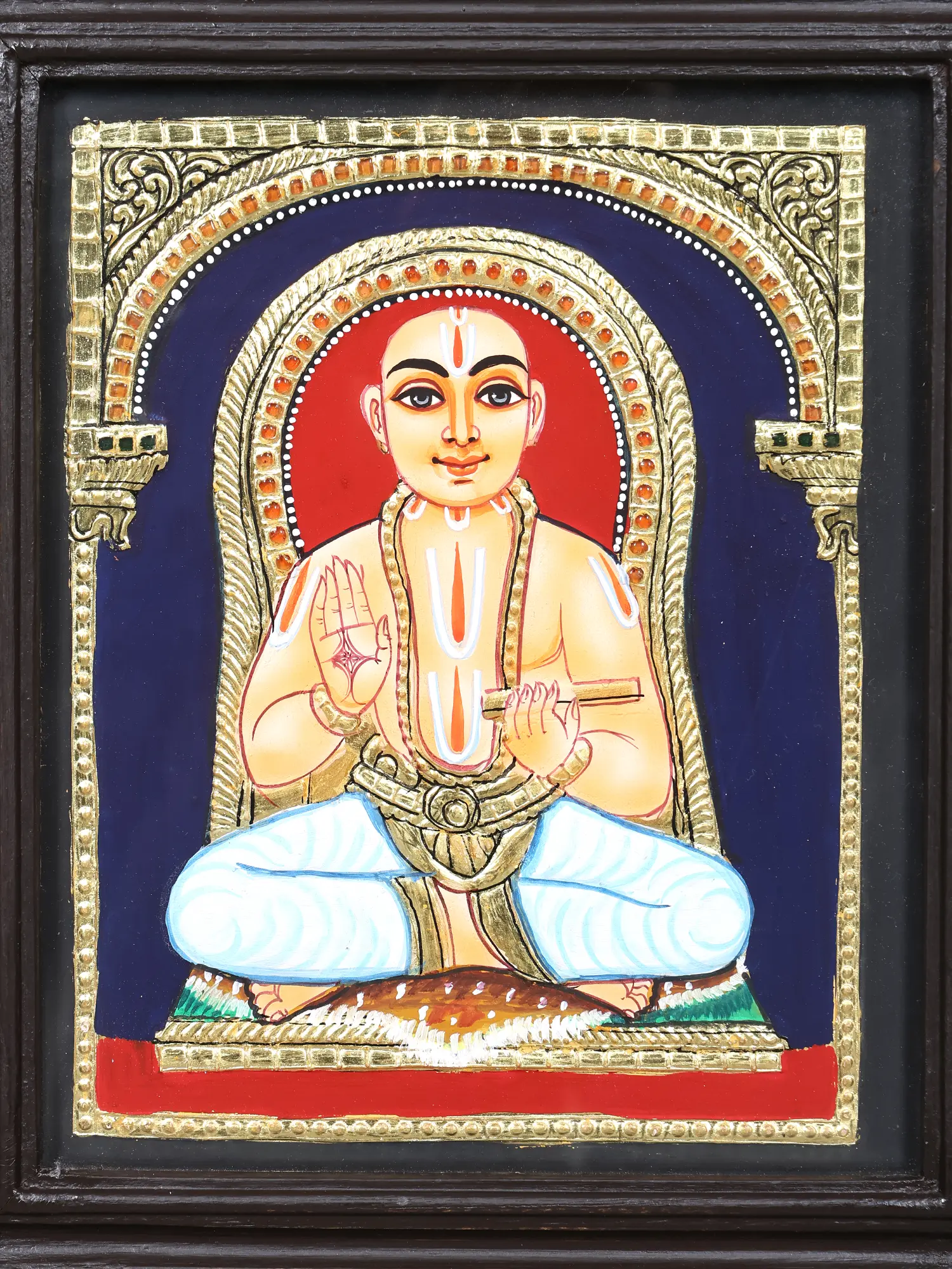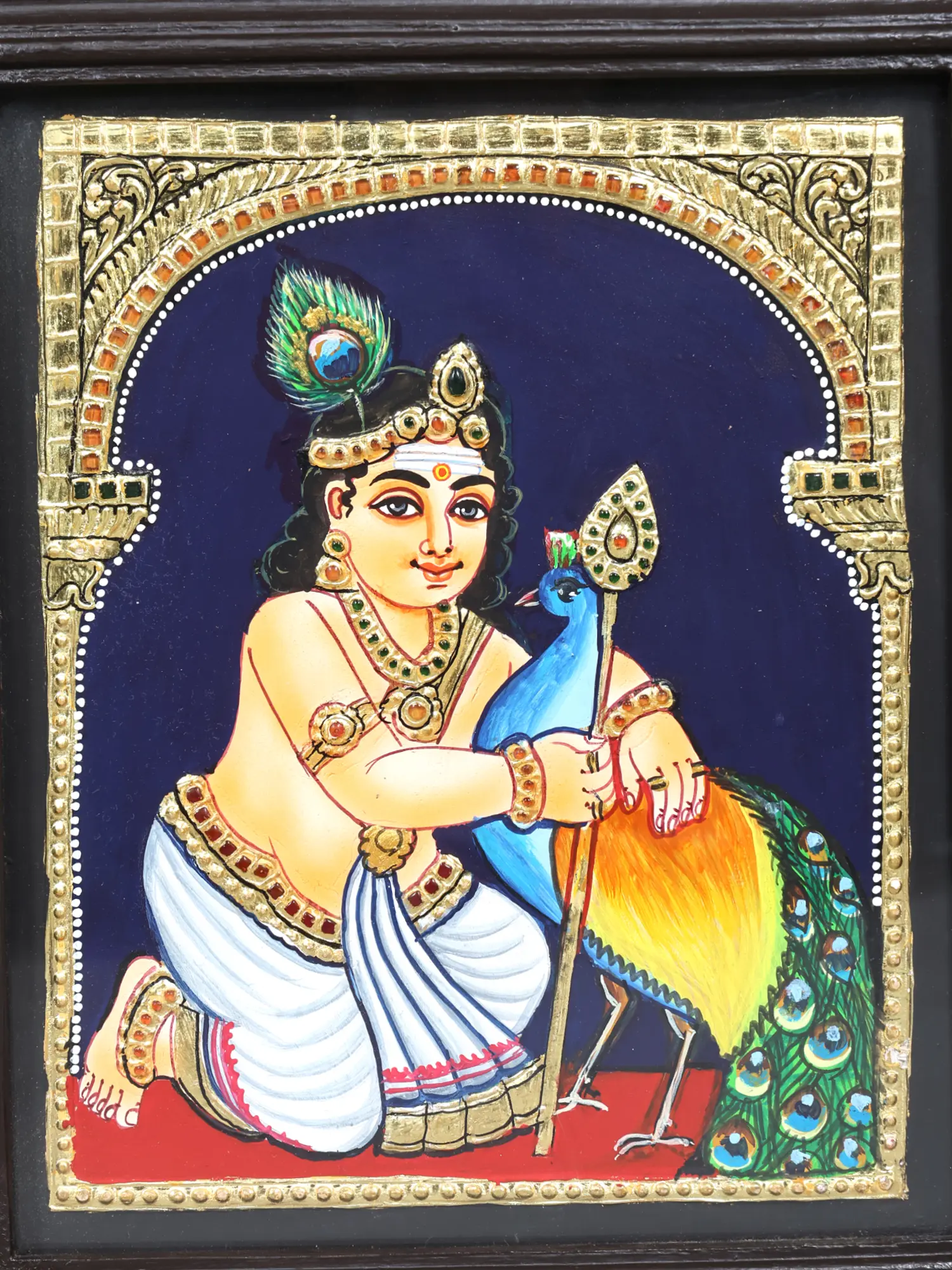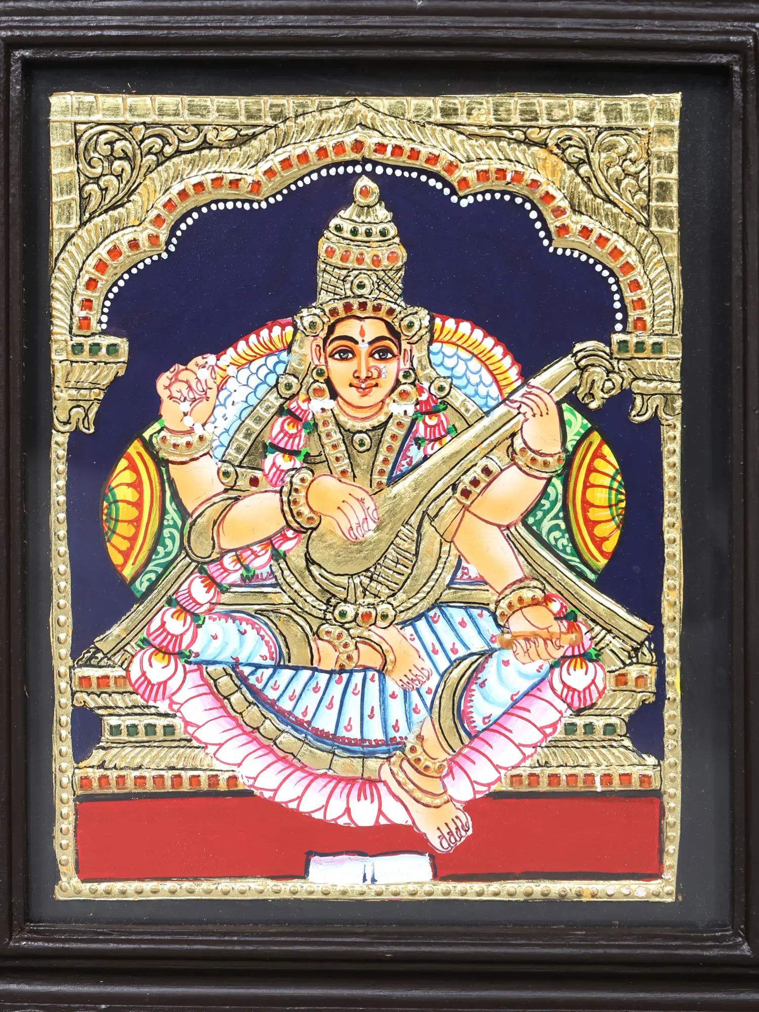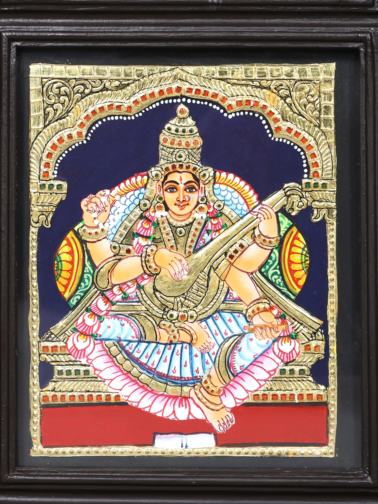 Each panel within this framed masterpiece is a testament to the centuries-old Tanjore painting tradition, a revered art form originating from the southern Indian region of Thanjavur. Skilled artisans meticulously apply traditional natural colors and embellish each figure with genuine 24-karat gold leaf, imbuing the artwork with a luminous, ethereal glow. The careful layering of pigments and the precise application of gold work showcase an unparalleled dedication to heritage and the pursuit of divine representation.