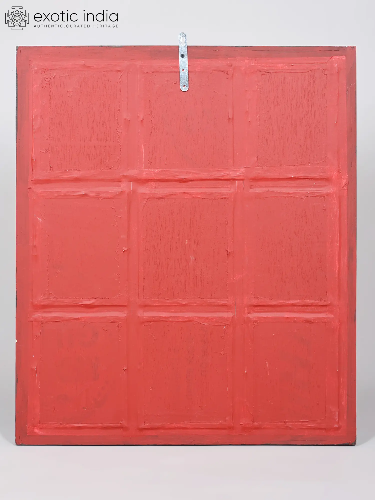 This striking composition, measuring 32 inches in height and 27.5 inches in width with a depth of 1.5 inches, presents nine distinct devotional vignettes. The vibrant depictions of deities are set against rich, deep blue backdrops, dramatically highlighted by arched gateways adorned with intricate gold detailing. The use of traditional colors, from the vermillion reds to the jewel-toned greens and blues, accentuates the divine forms, while the lustrous 24-karat gold work elevates the spiritual aura of each panel, capturing the divine essence with breathtaking clarity.