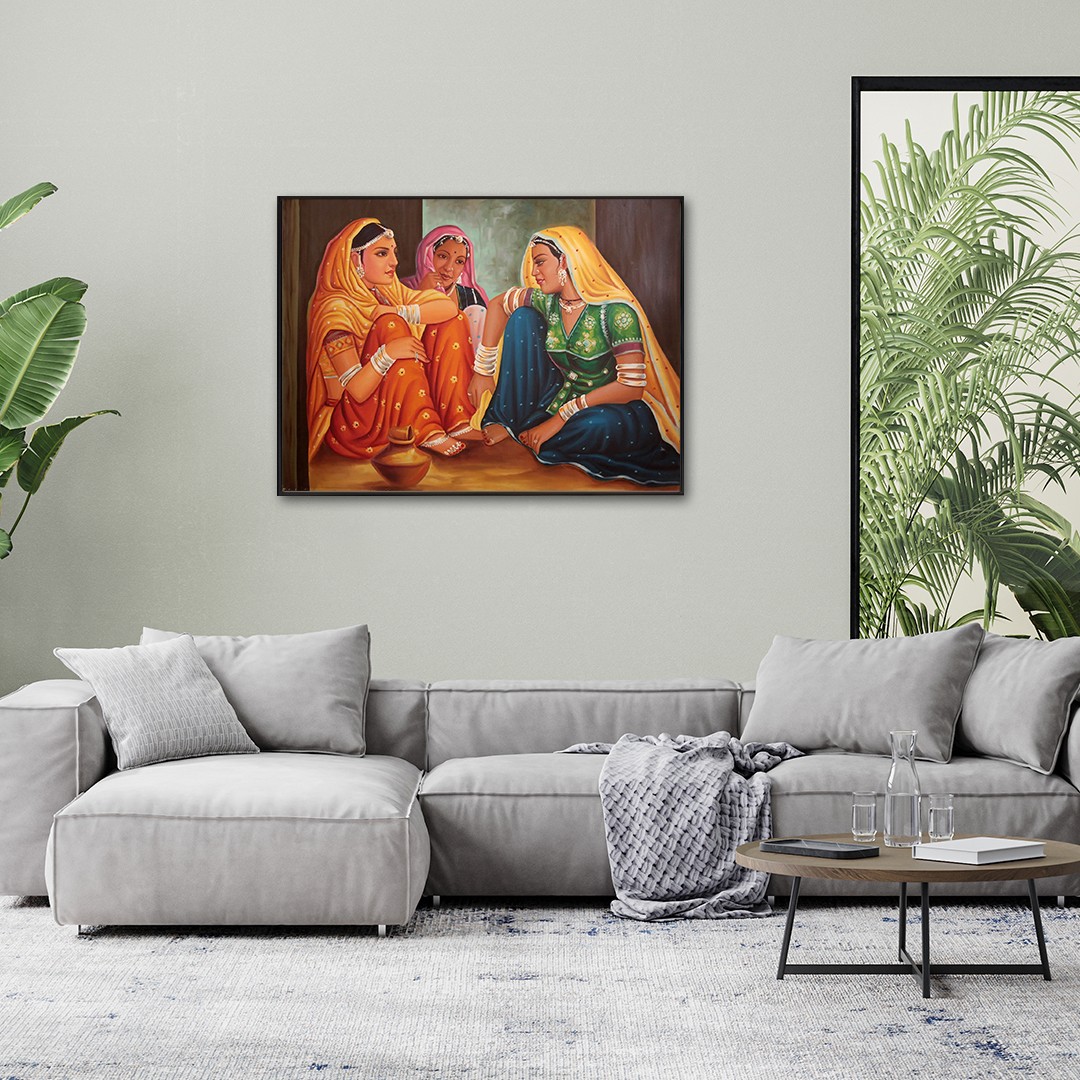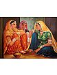 This painting portrays three rural women, clad in characteristic Rajasthani costumes – lehengas, odhanis and blouses, and conventional ornaments – broad bangles made of camel bones, pendants on the foreheads, amulets around the necks, rings on fingers of feet denoting their marital status etc., seated on ground with some grave concern on their faces. The woman with fairer complexion on the right, the youngest of them all and more brilliantly costumed, seems to have recently returned from her in-laws’ house and is sharing with the other two, one in the centre perhaps her mother, some problem she is facing there. A delicate matter, none of them, though their concern is quite grave, speaks a word and keeps pondering over it. The artist has executed all figures with rare skill imparting to them great beauty, however the glow of the youth on the face and the entire figure of the youngest is exceptional. He has used varying levels of skin colour for defining their age variations. A healthy build, large thoughtful eyes, ease in postures and Rajasthan’s grace, especially as it reflects in veiling their heads alike define all figures.