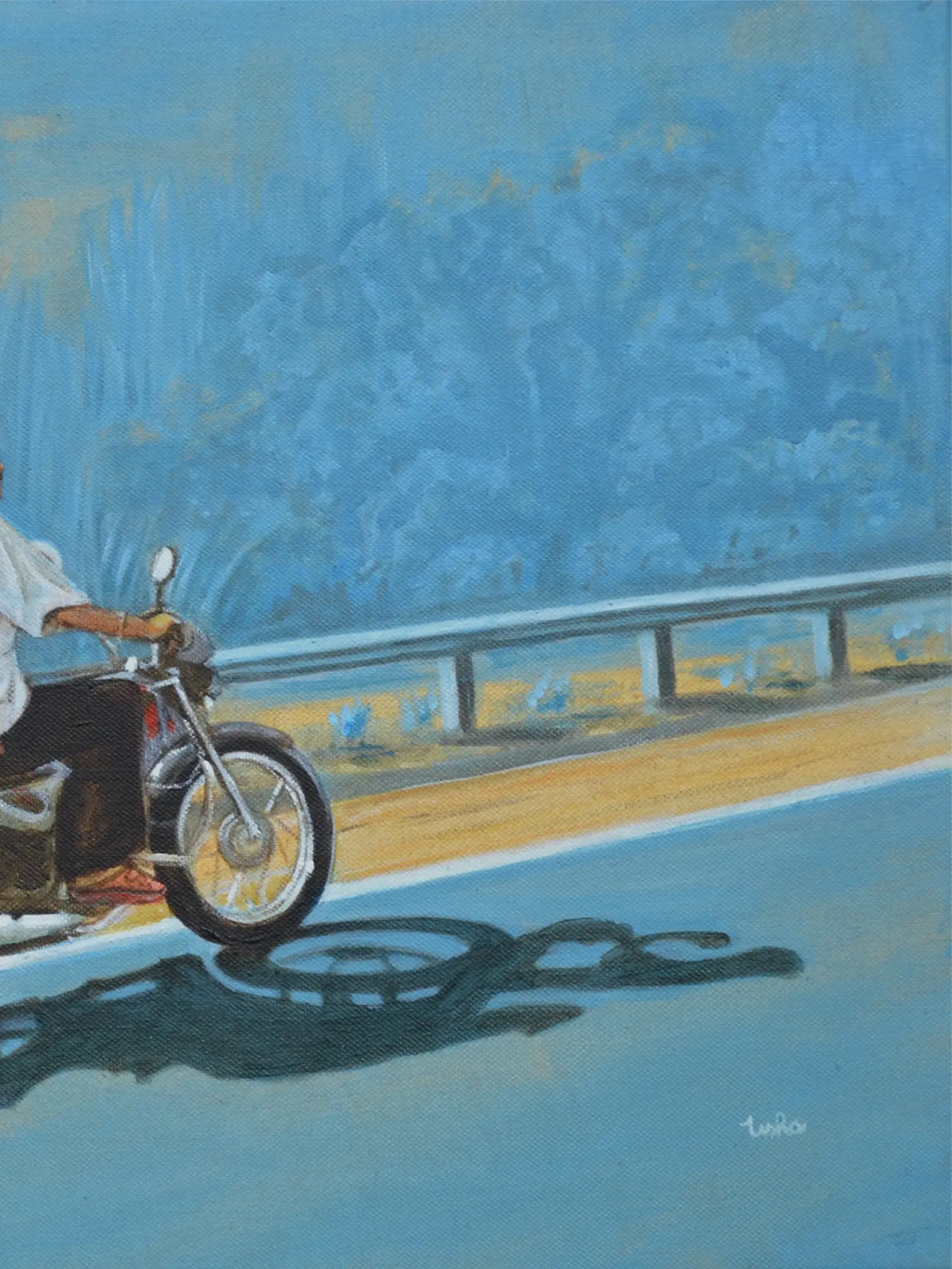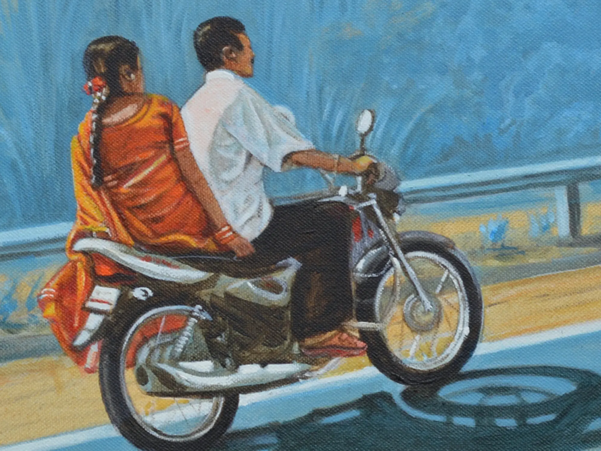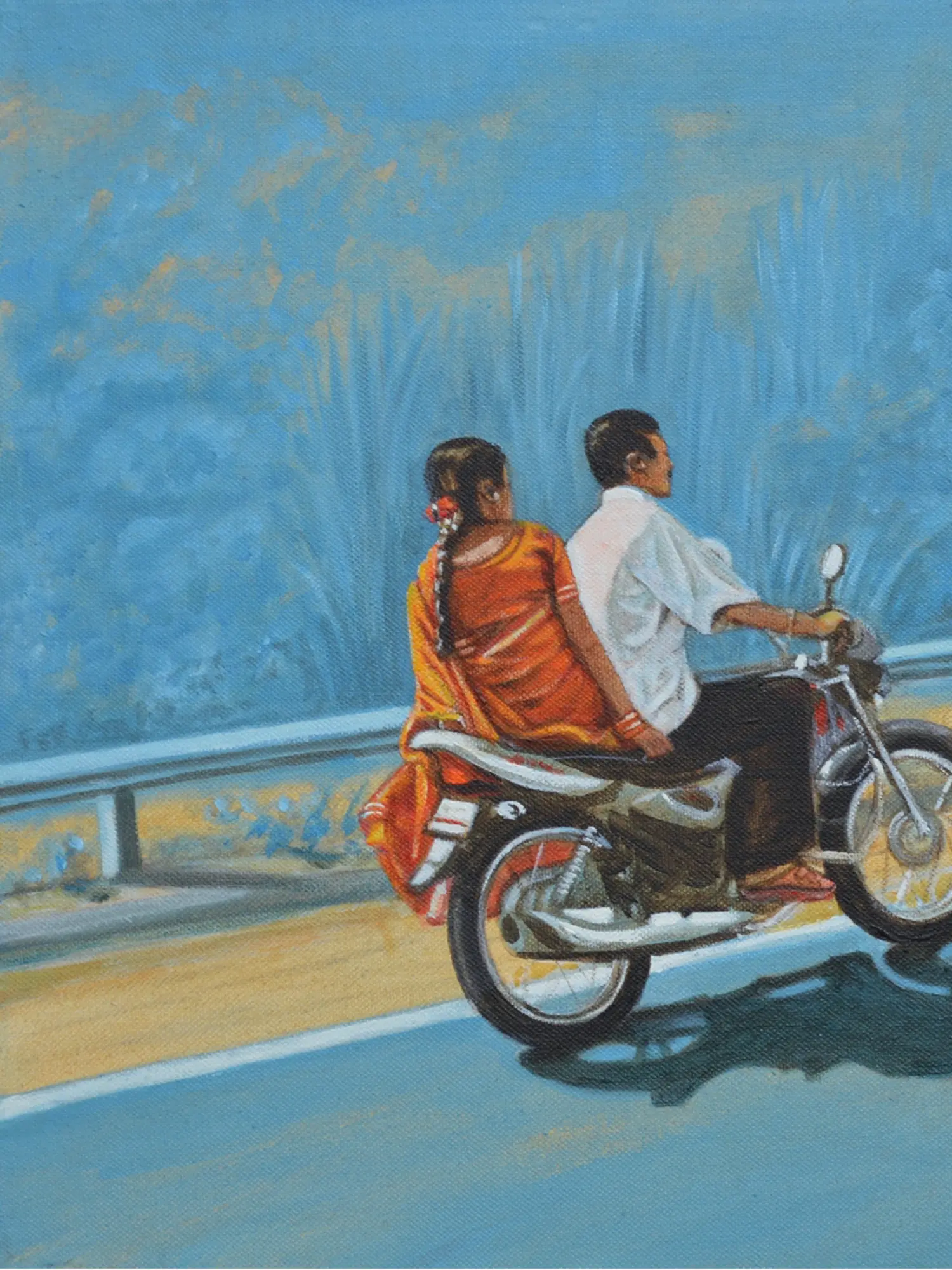 Couple Ride On Bike - Long Drive - Acrylic Painting | Acrylic On Canvas | By Usha Shantharam
