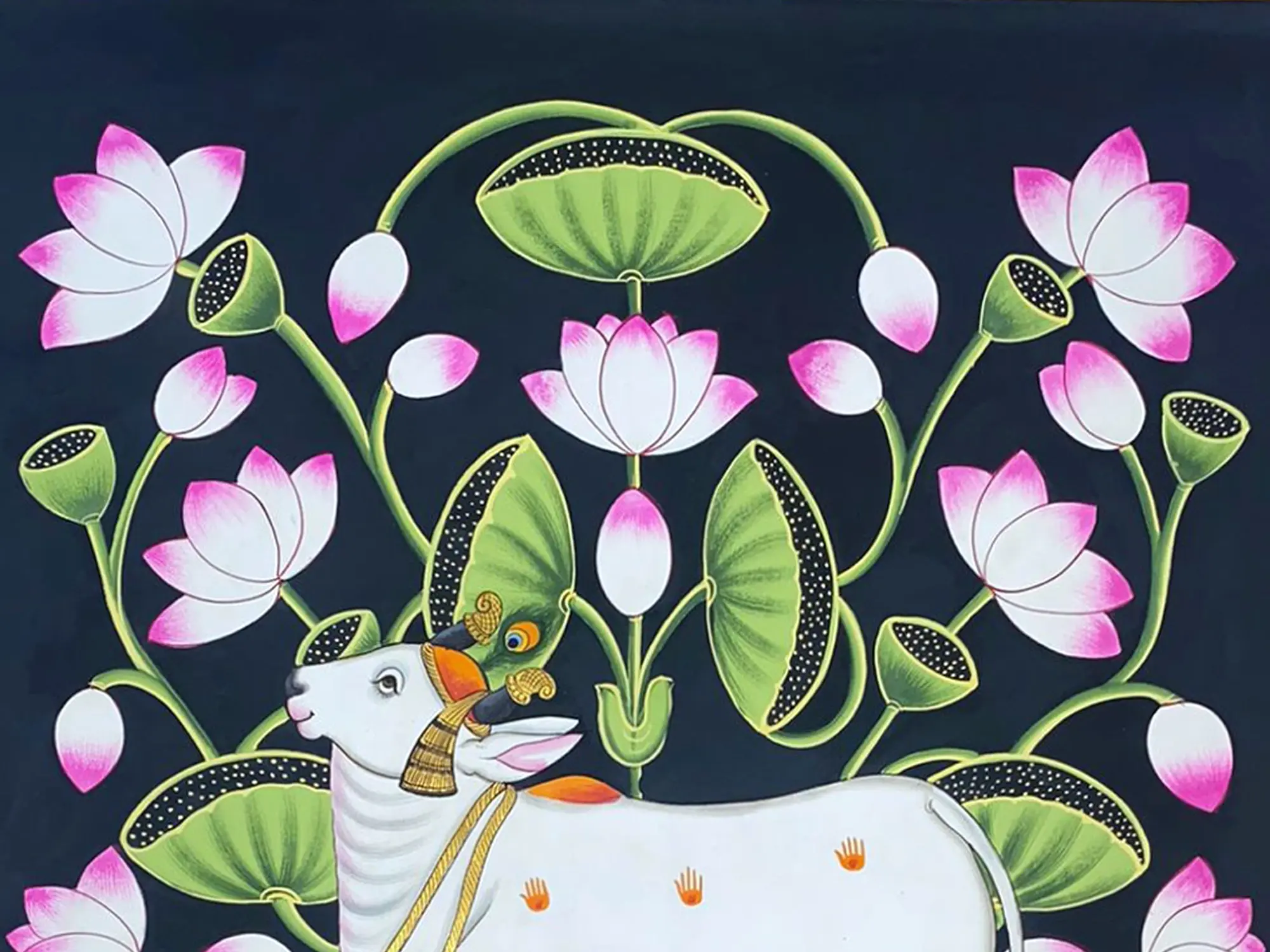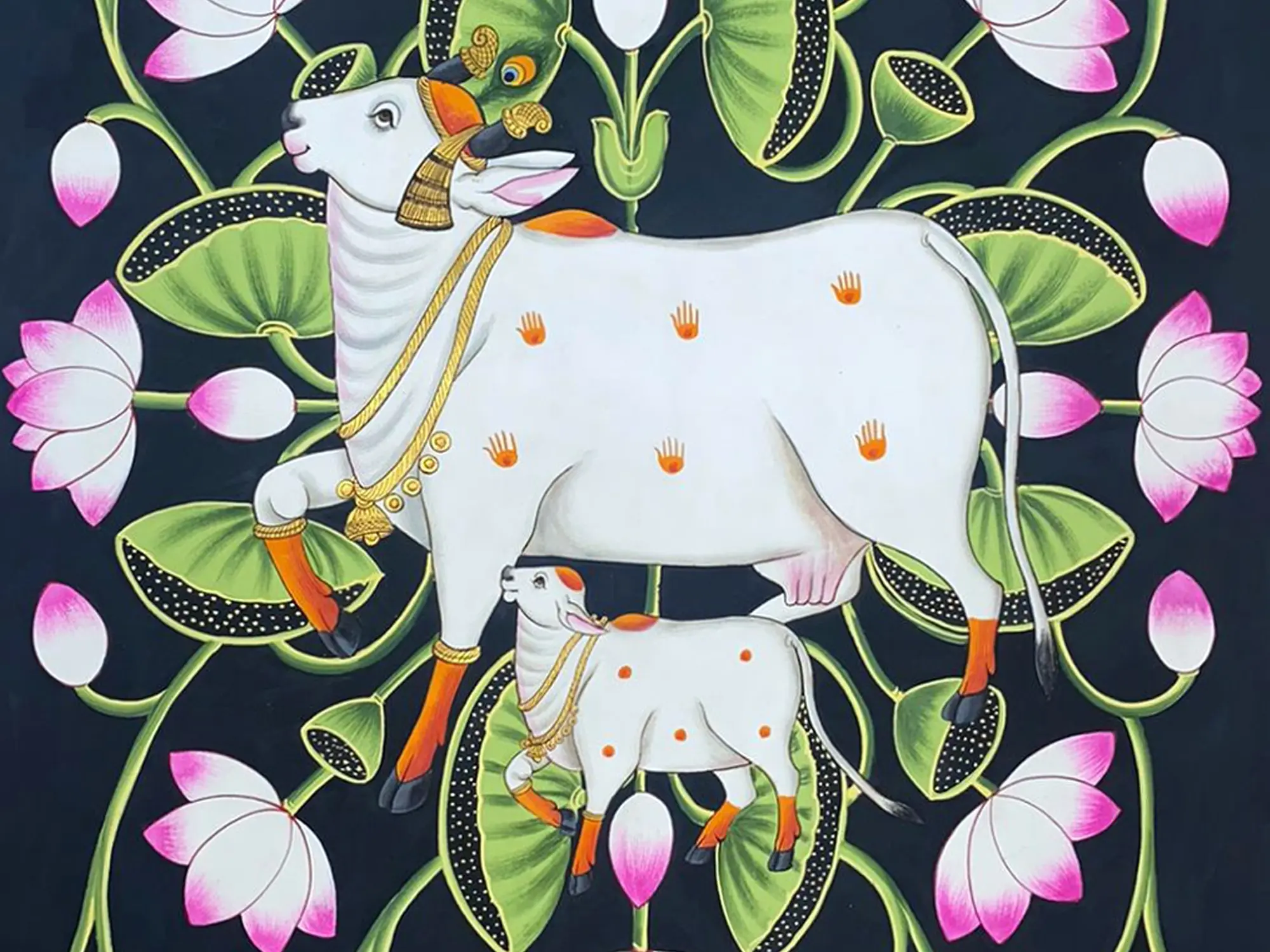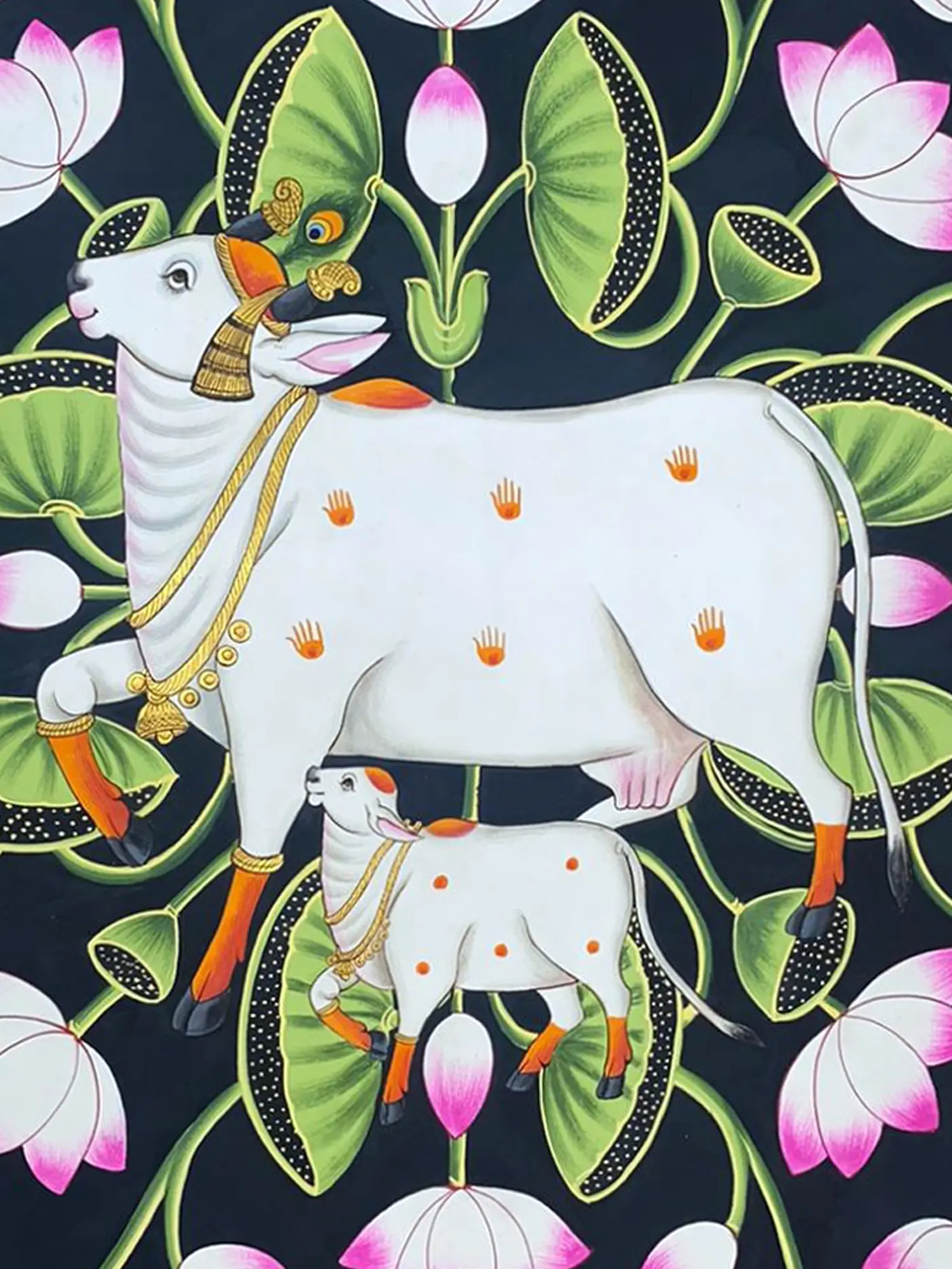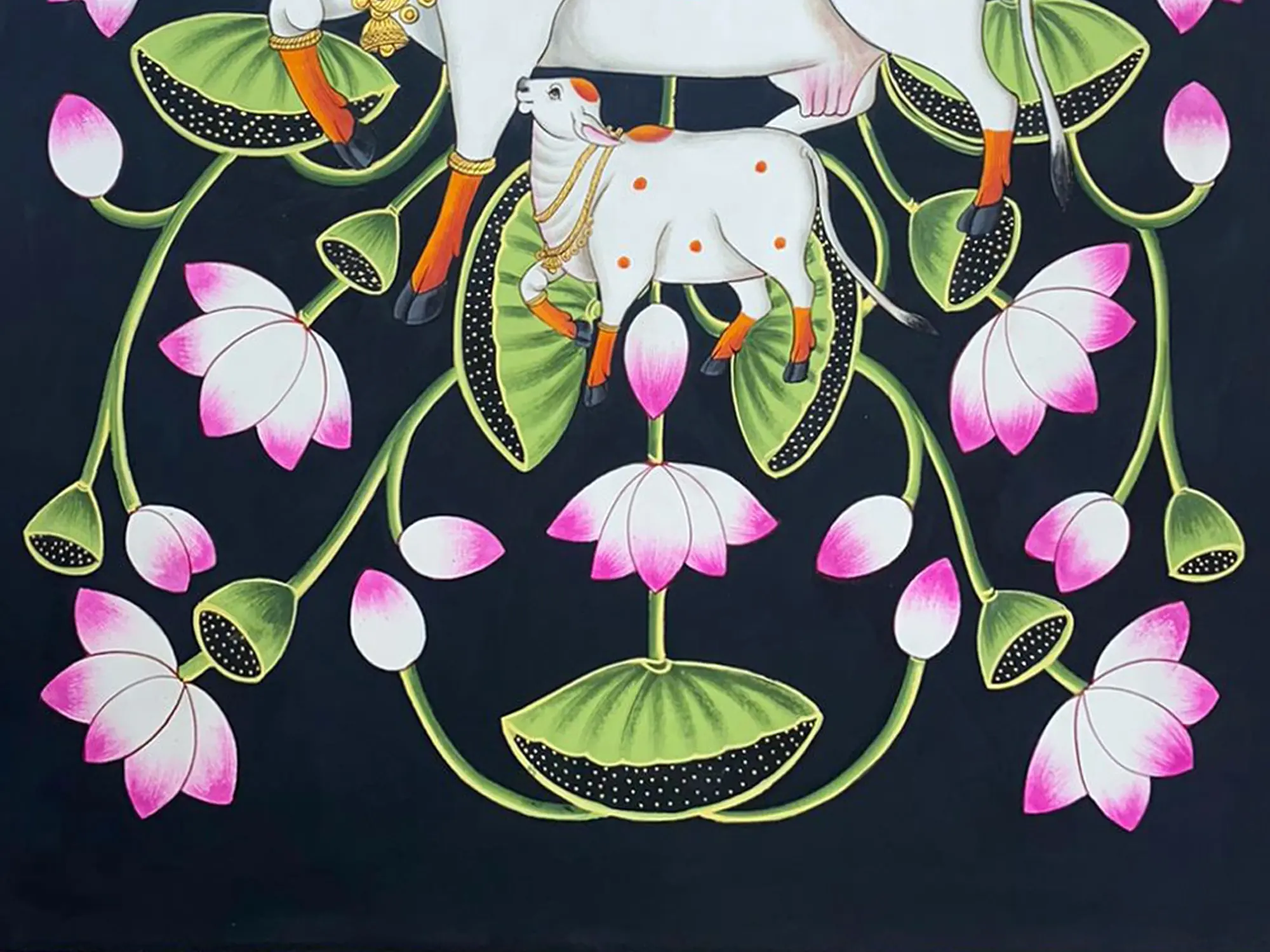 This art form draws deeply from the rich tapestry of Hindu mythology and culture, where cows are revered as sacred beings, symbols of maternal nurturing, abundance, and the divine feminine. The presence of lotuses further elevates the spiritual significance, representing enlightenment and divine beauty. Viewing this piece connects you to a lineage of devotion and artistic expression that has been cherished for centuries.
