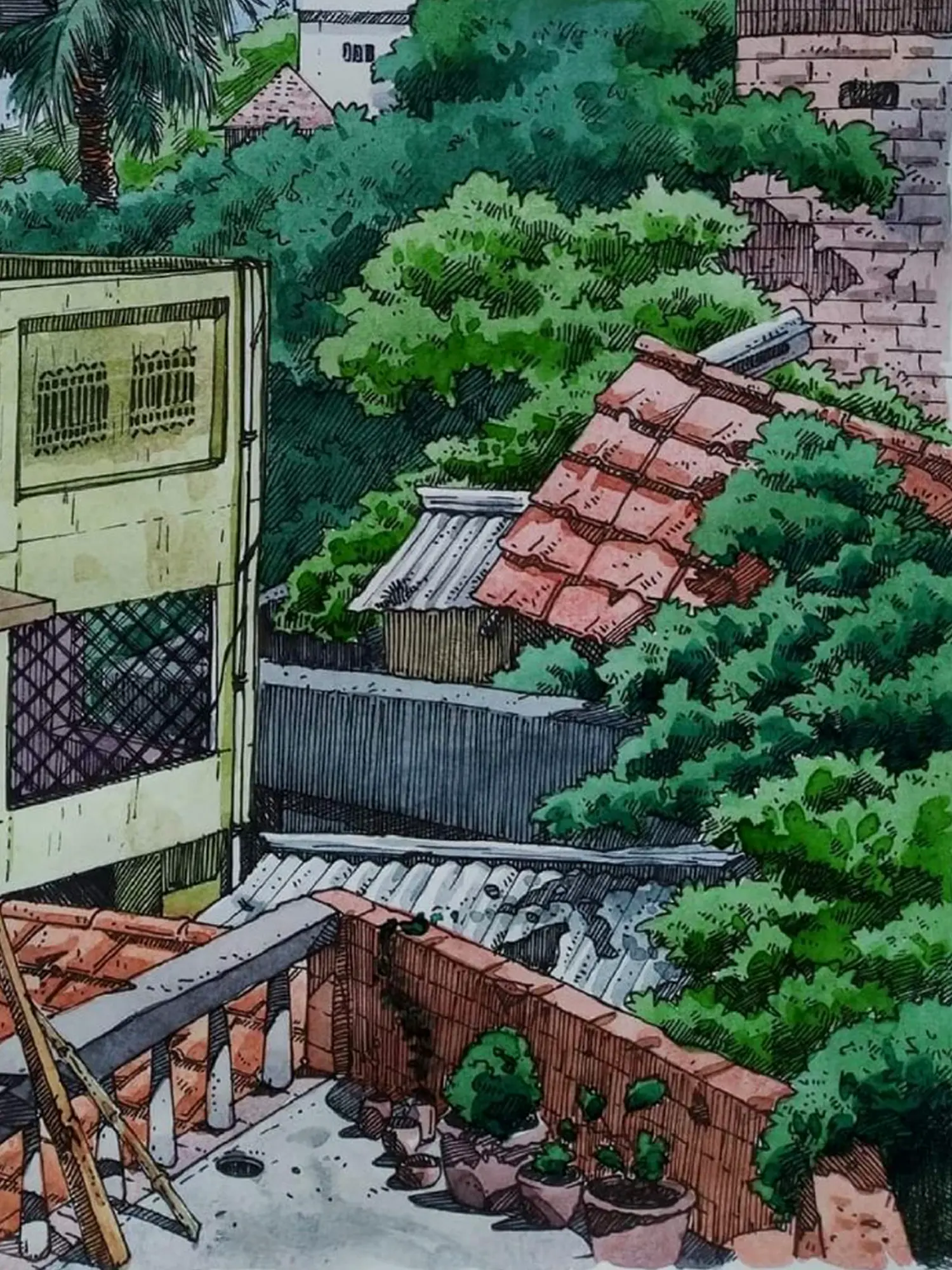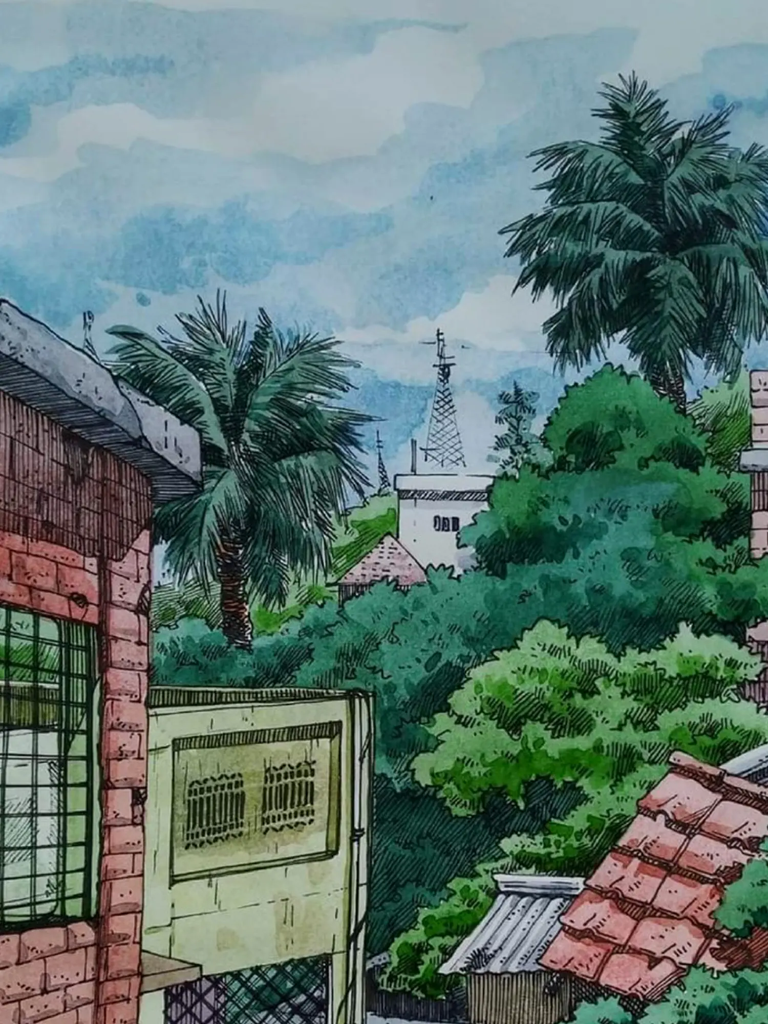 Shubham Sarkar's watercolor on paper painting evokes a nostalgic embrace of cozy mornings in the hometown. The portrayal of closely clustered homes with tiled roofs, surrounded by vibrant trees, captures the essence of a familiar and cherished place. The anime-inspired style infuses the scene with bright colors, amplifying the warmth of recollections.