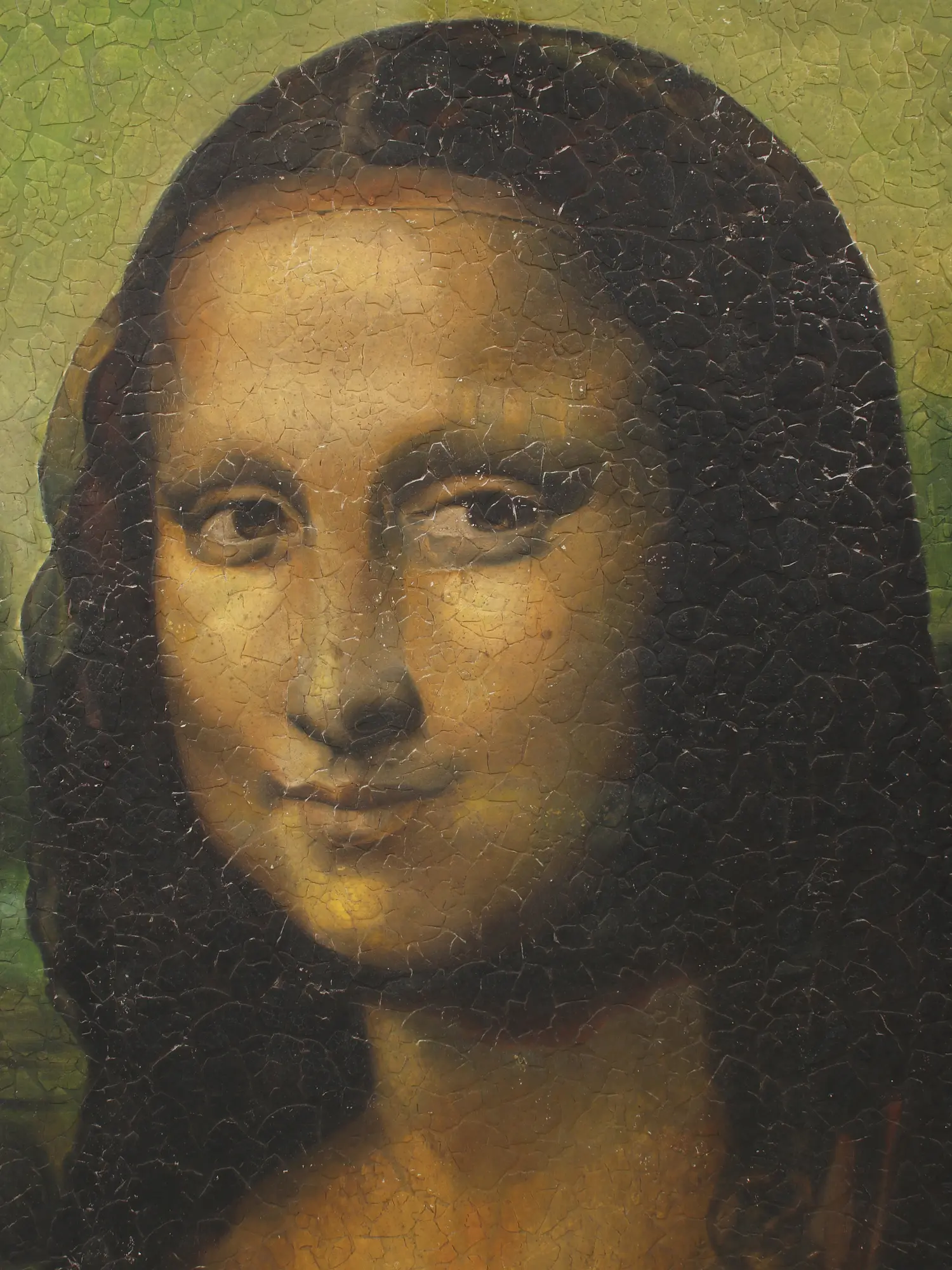 The sharp jawline and darker skin color add a touch of individuality, yet the careful use of colors preserves the essence of the original, giving the painting an authentic aura. In this way, replicas like the "Crackled Mona Lisa" offer both a nod to art history and a chance for collectors to have a piece of this iconic masterpiece in their own spaces. Her concentrated glance at you confirms that you must get her and place her on the best wall in your home.