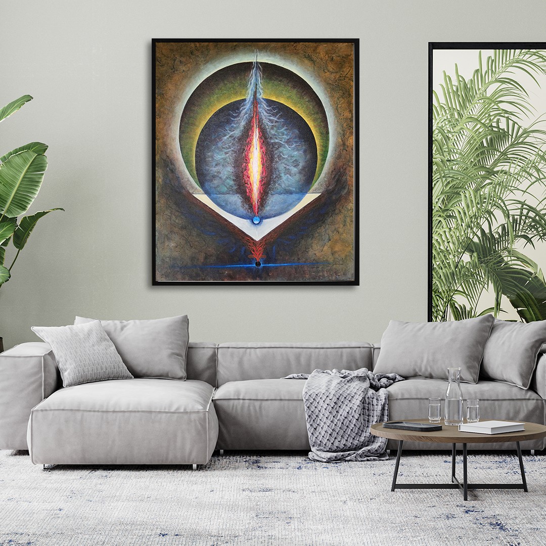 The circular forms within the artwork subtly echo the cyclical nature of creation and destruction, a concept central to many ancient mythologies. Think of the Ouroboros, the serpent eating its own tail, a symbol of infinity and eternal recurrence, perfectly mirrored in the artwork’s dynamic energy. From the ancient Egyptian myth of creation where Atum, the self-created god, arose from the primordial waters, to the Hindu concept of Brahman, the ultimate reality from which all beings emanate, the painting resonates with a timeless narrative of origins. The central, fiery column could be interpreted as the world tree, a common motif in Norse and Slavic mythology connecting all realms of existence – a powerful visual metaphor for interconnectedness. The artist uses color not merely as decoration, but as a potent symbolic language, echoing the rich tapestry of beliefs and stories passed down through countless generations. The subtle use of blues and greens evokes the vastness of space, while the warm tones at the centre convey the heart of creation, an energy source that drives all existence.