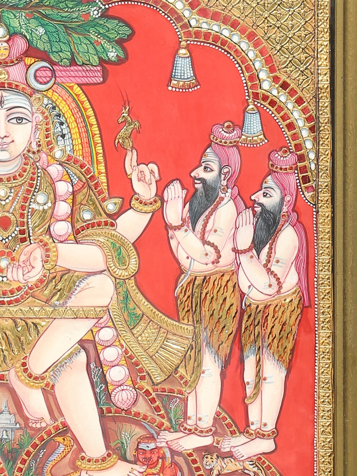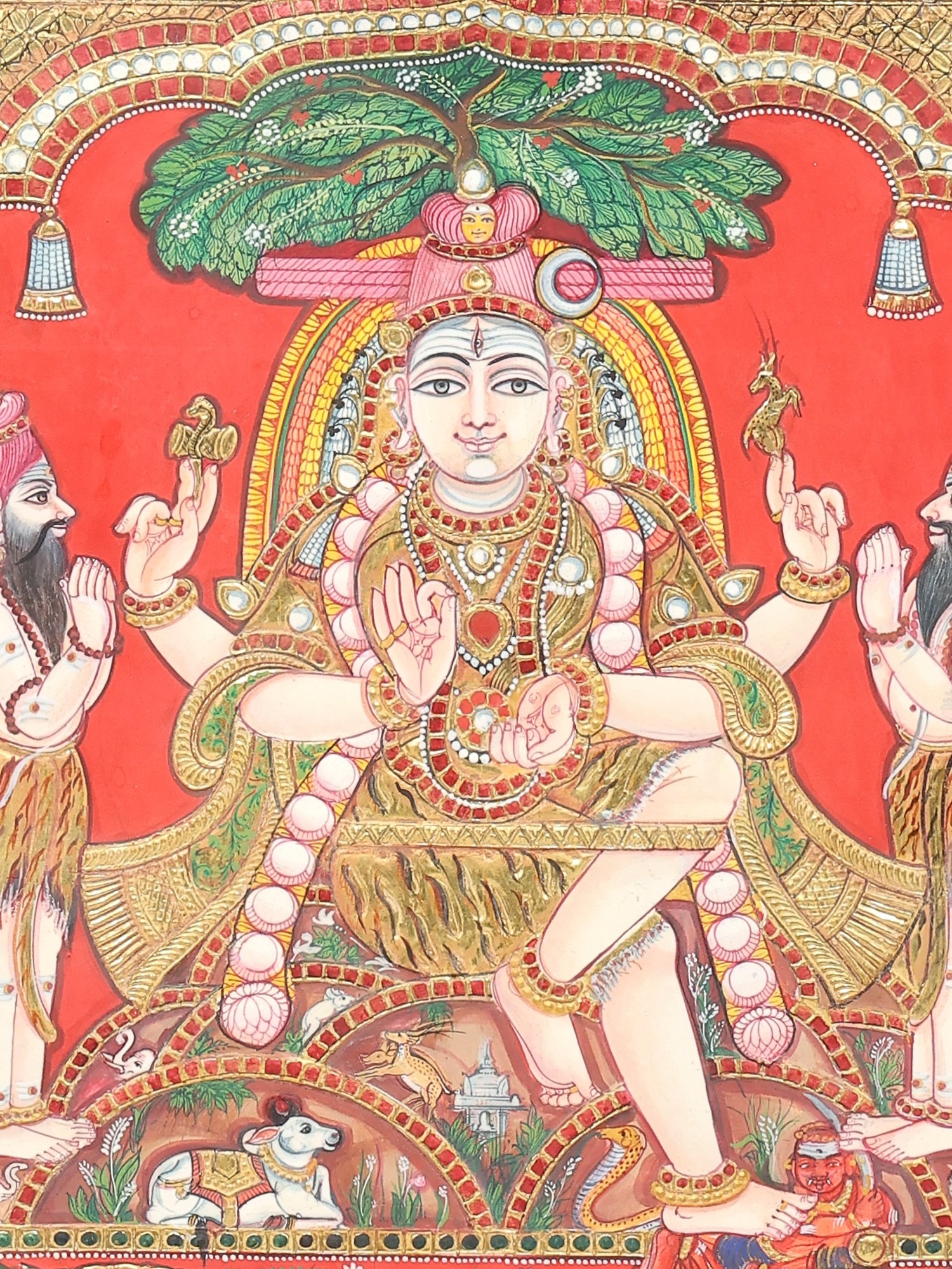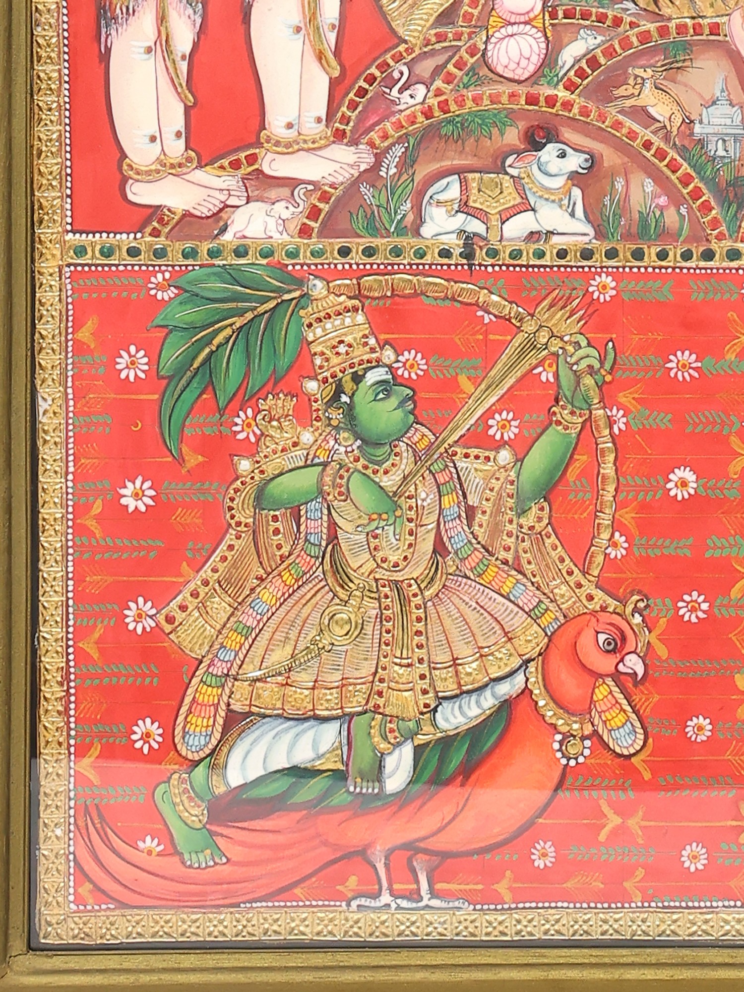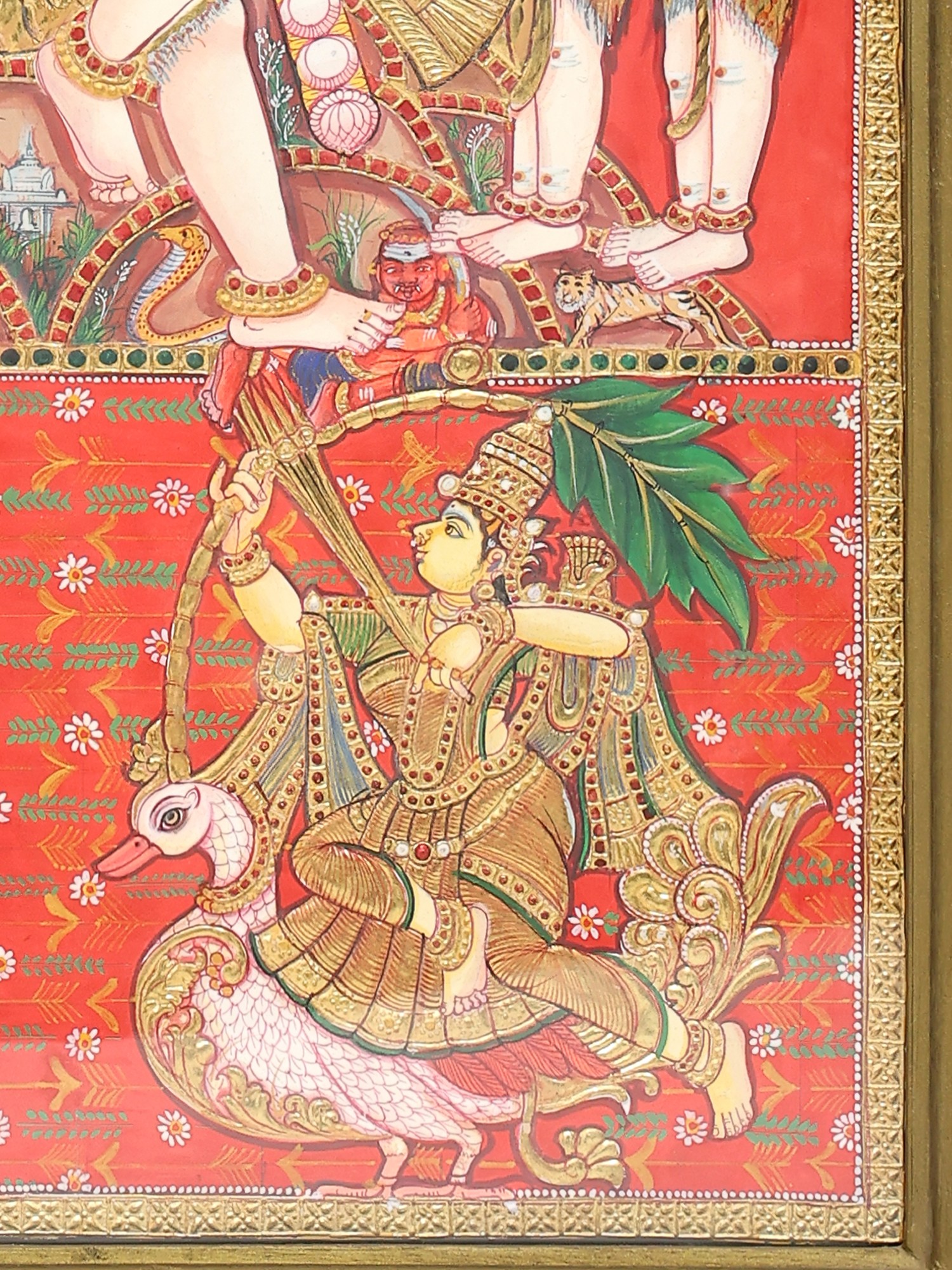 Shiva Parvati with Karttikeya | Tanjore Painting | With Vintage Teakwood Frame