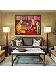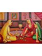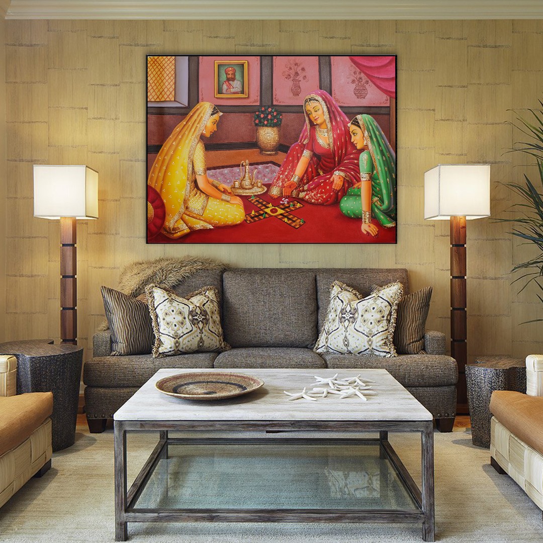 In the comfort of their home, the three damsels are engrossed in the board game positioned between them. With their henna tainted palms, they roll the cowries used as dices in the game. There is a custom to place a bet on a game of Chaupar in India. We know nothing about what is betted in the game played by these three damsels, all we know is that this oil painting of women playing Chaupar will aesthetically enrich your space. We can bet on that!