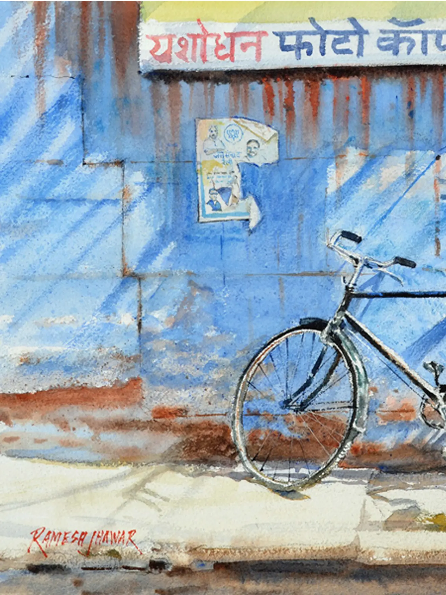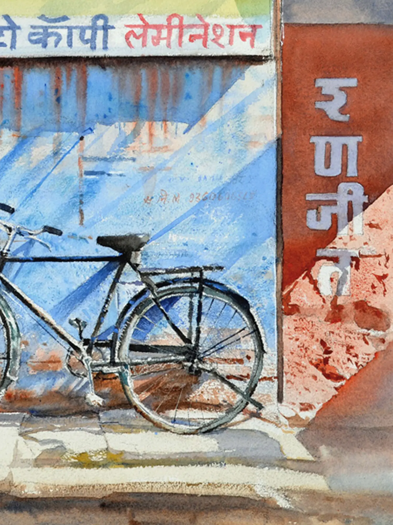 This artwork resonates with the soul of India, capturing a scene that feels both specific and universal. It speaks to the timeless rhythm of life, where simple objects become carriers of stories and memories. The implied signage in the local script adds an authentic layer, hinting at the bustling commerce and daily life that unfolds in such settings.