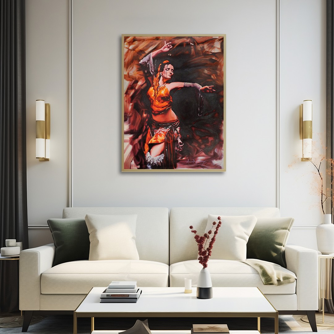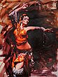 This contemporary painting by a Delhi-based artist Anup Gomay, rendered in oil on canvas measuring 3ft by 4 feet, portrays a dancer performing all alone, fully enthused and as in ecstasy. Anup Gomay usually prefers a background in deep tones of colours and abstract forms, though unlike the contemporary abstract artists who render such forms for the sake of such forms itself or for emphasizing abstractness in Anup Gomay’s paintings such forms are often symbolic and convey some meaning or at least add thrust to the painting’s central theme. Here the disorderly background with irregular strokes of brush – deep tan, maroon, red, grey and in between patches of white, as well as the dancer’s disordered costume – the sash around her waist, skirt, the dancers’ decorative furs on legs, upper shortie – collected around breasts, sash tied around her knotted hair … all symbolize the burst of energy that the kind of dance she is performing generates. The arms’ resplendent decorative covering, the legs’ fur-fittings and the short skirt – typical of European folk dancers widely used by Helen like hot dance performers in early Indian films attribute to her figure in the painting great ethnicity, medievalism and flavour.