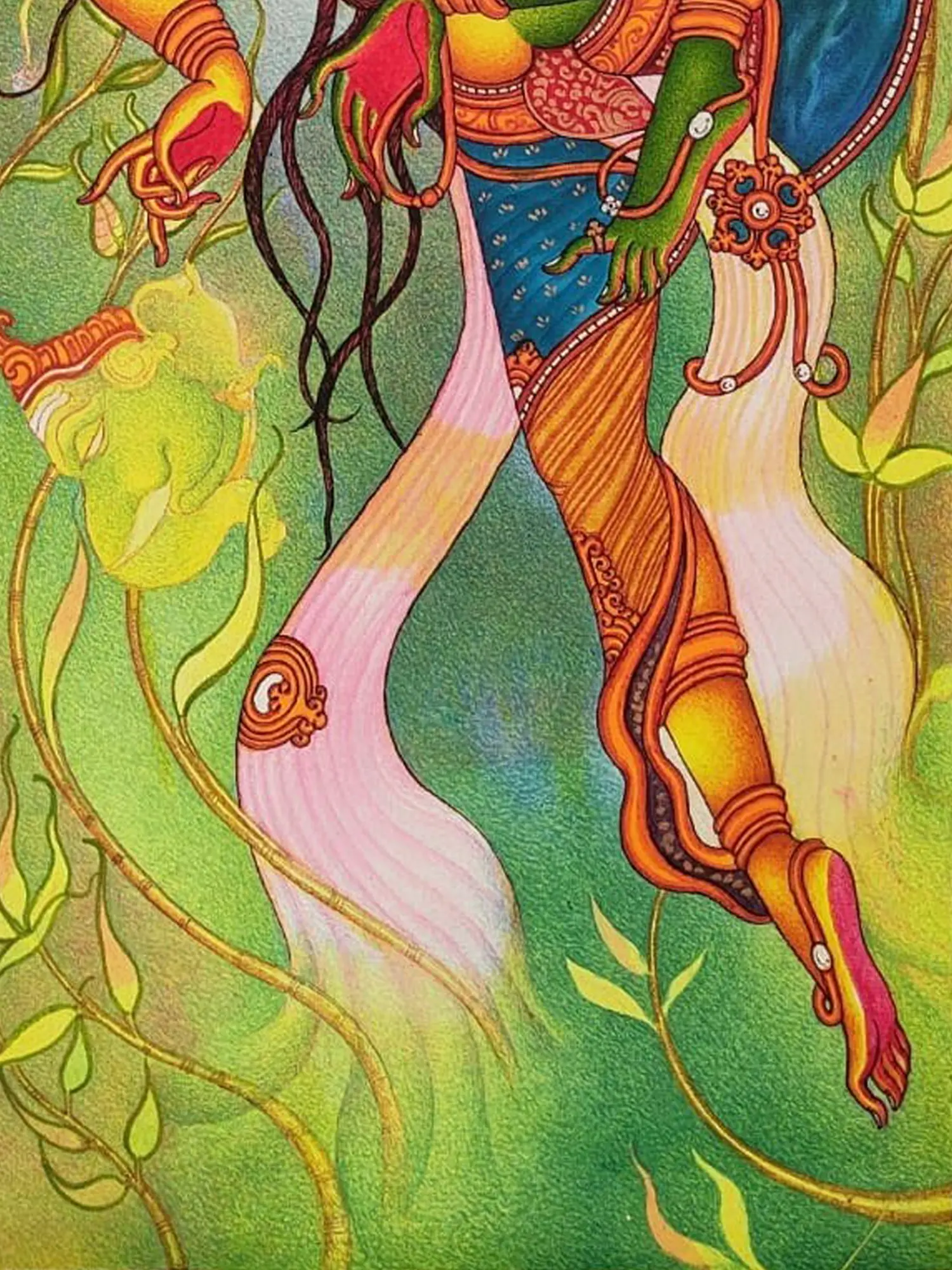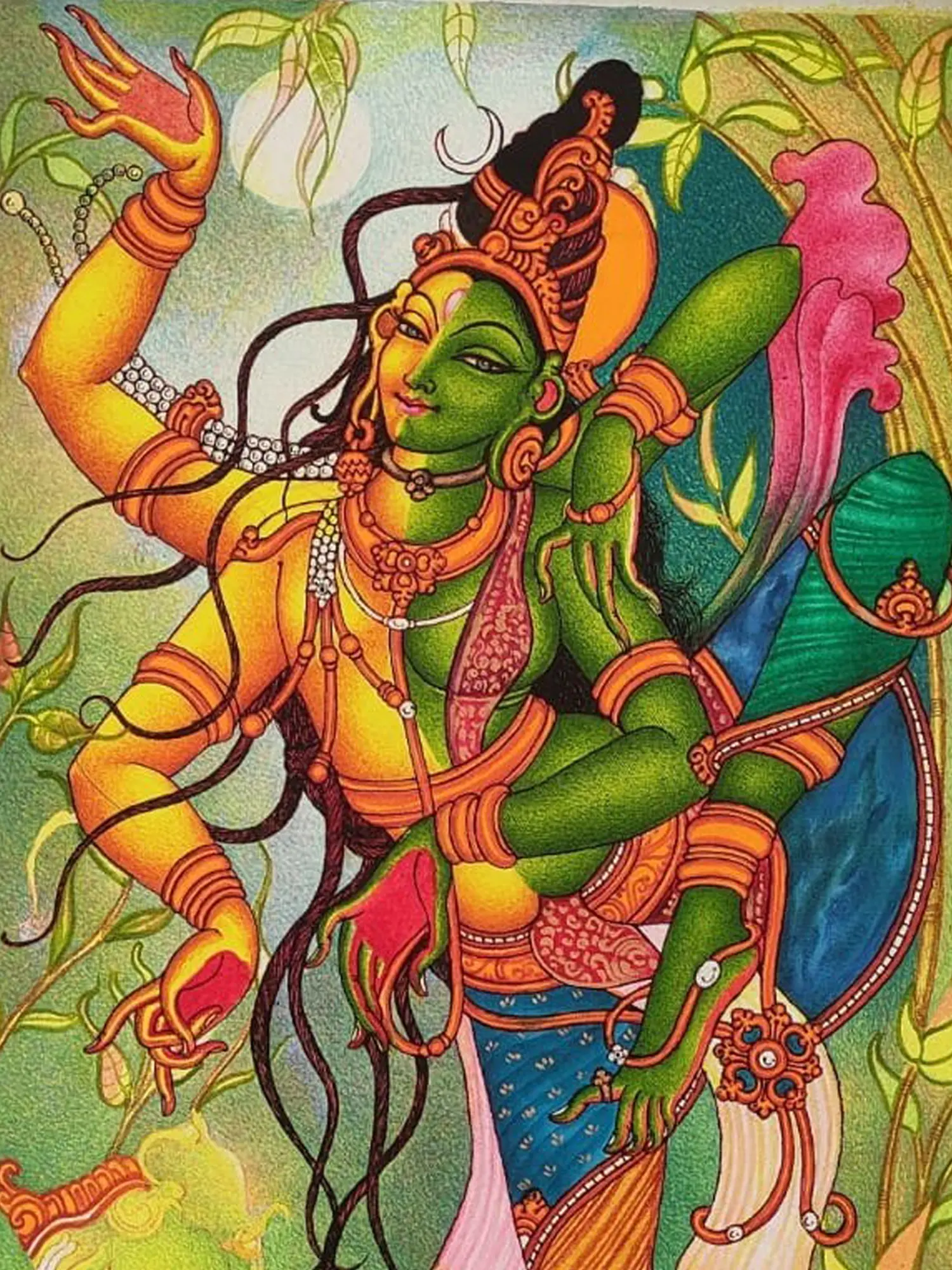 The dynamic composition, measuring 36.00 inches in height and 31.20 inches in width, captures the essence of celestial motion. Observe the fluidity of the limbs, the intricate details of the adornments, and the striking contrast between the dualities represented. The emerald green and golden yellow palette, accented with rich blues and soft pinks, creates a visual narrative that is both powerful and graceful, drawing you into the heart of the divine performance.