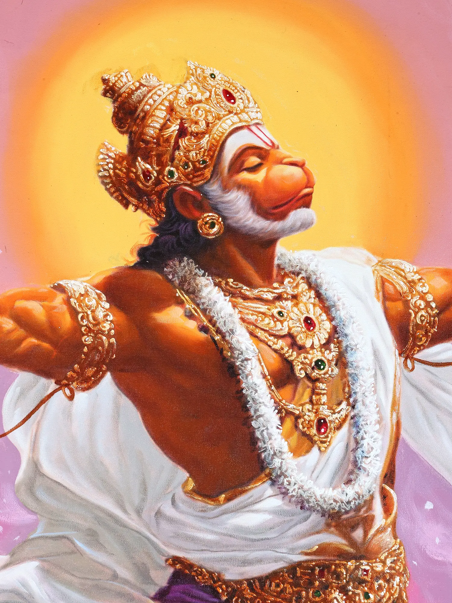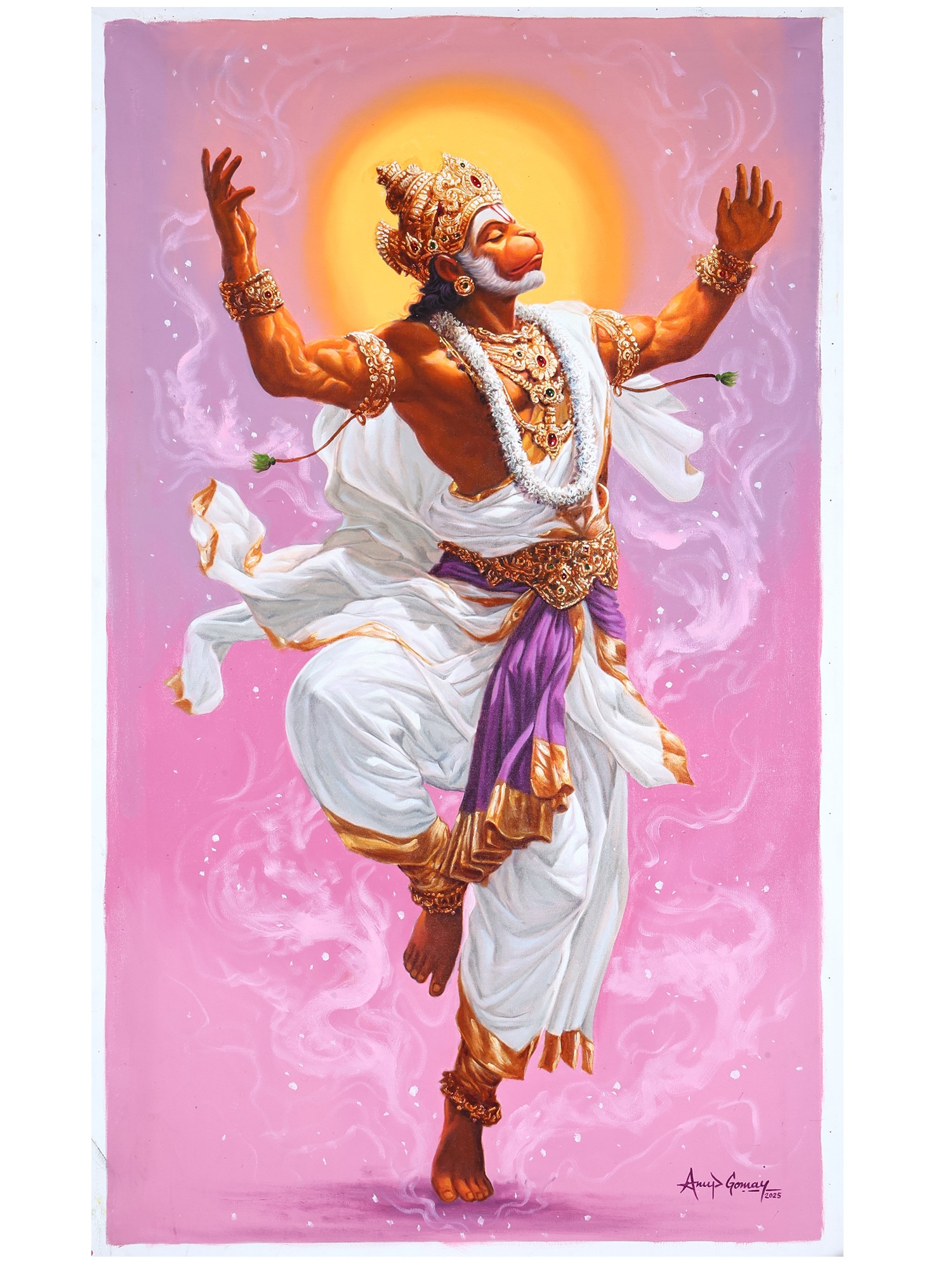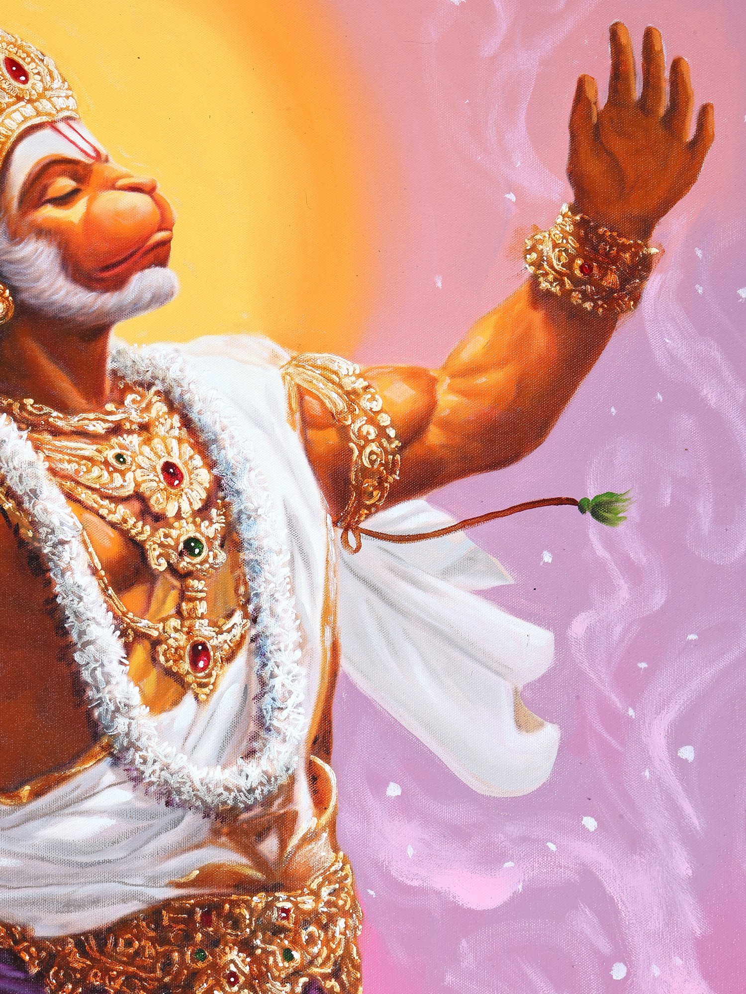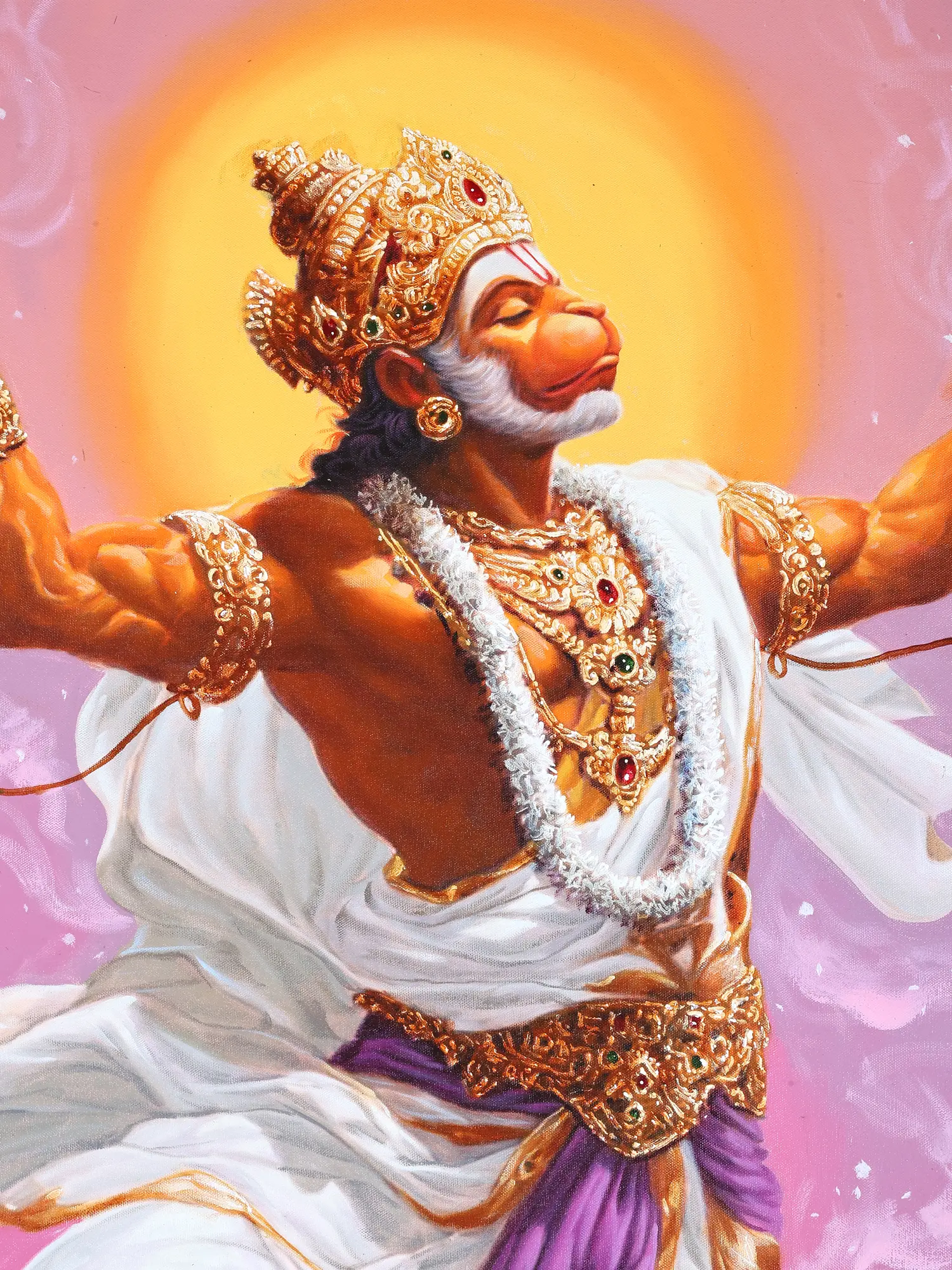 Behind him, the sun anoints Hanuman with radiance, crowning him in light as he rises as the very pinnacle of devotion.