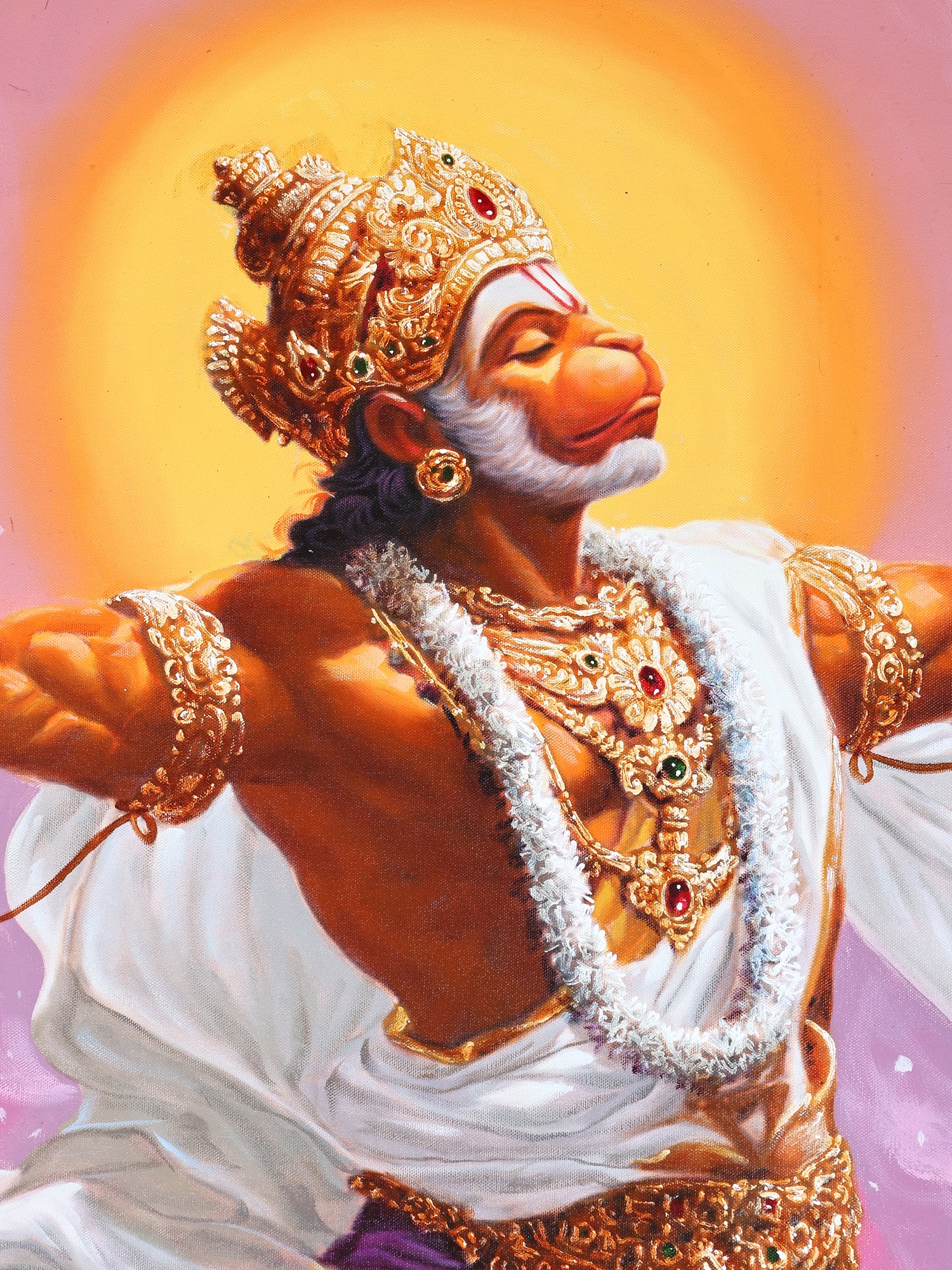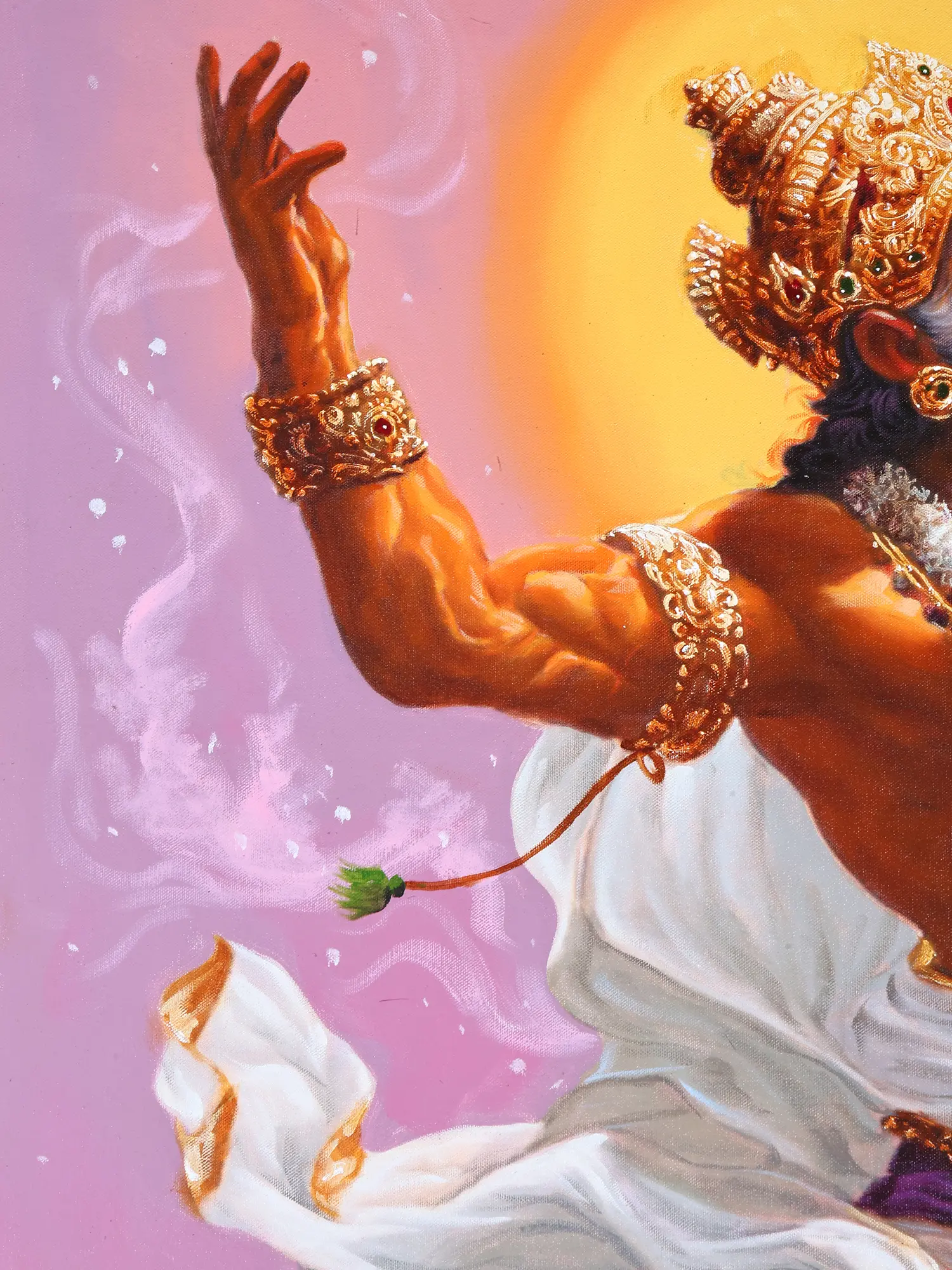 The first thing this painting gives you is a jolt of movement. A sudden yet swift surge of dynamism rises from the canvas, as if Hanuman has just leapt into view from another realm. His body is a perfect study in contrasts- muscled limbs alive with kinetic force, yet his face remains serene, eyes gently closed, expressing the inward stillness of a devotee who has no concern for the world, only for his Lord.
