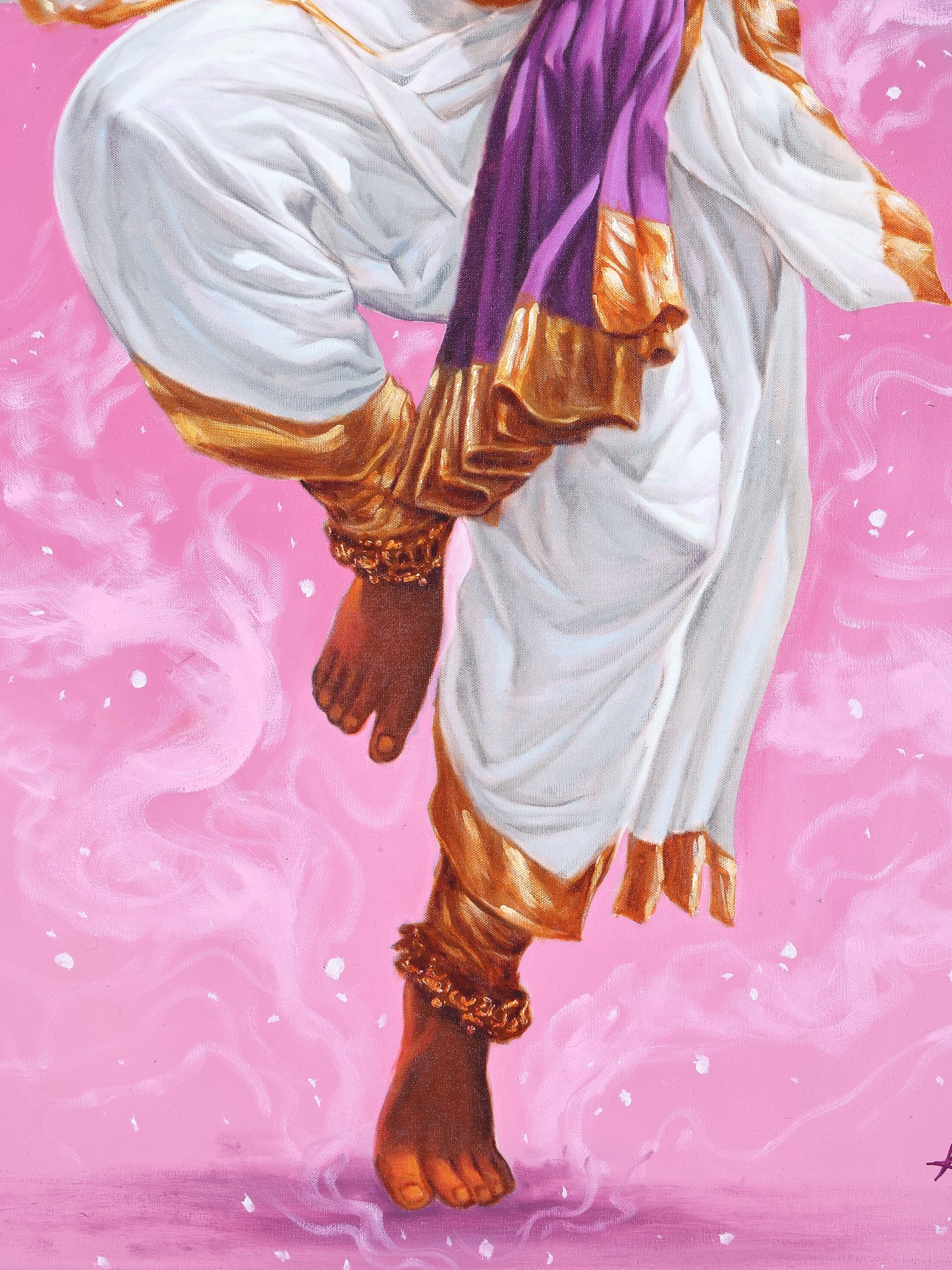 The colour palette is unlike any traditional rendering: a celestial pink haze swirling around him, warm golds catching the folds of his garments, and a soft lavender drape adding lyrical movement.