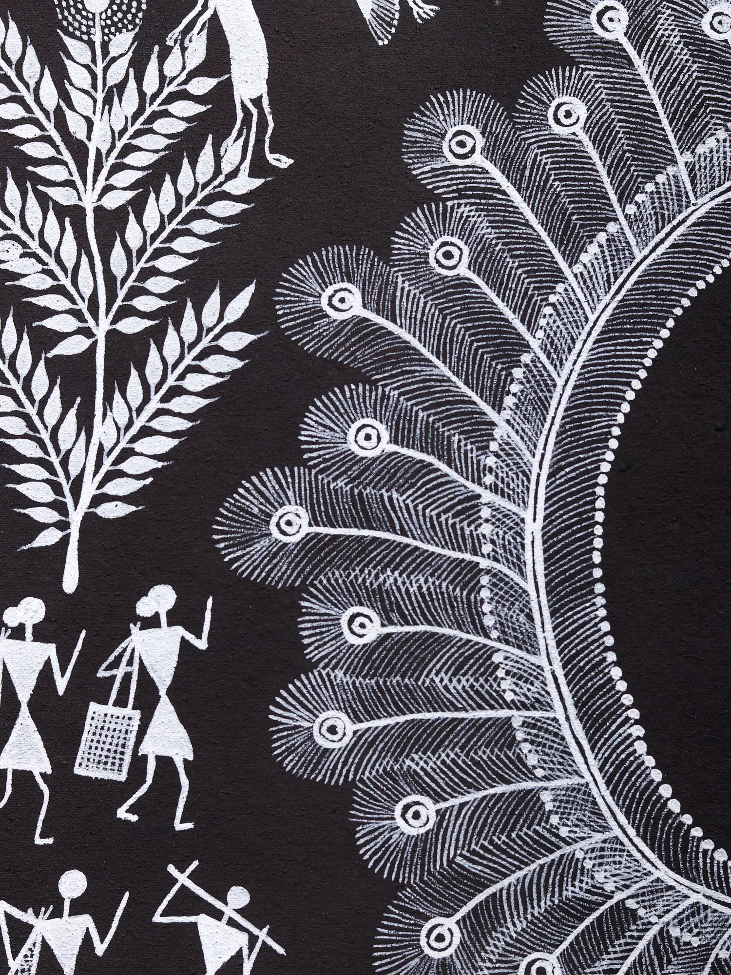 This painting is a testament to the rich cultural heritage of the Warli tribe of Maharashtra, India. Warli art is a unique form of tribal art, characterized by its simplicity and symbolic representation of daily life, nature, and mythology. Using only white paint on a dark background, the artists tell stories—stories of farming, hunting, celebrations, and nature. The geometric patterns and simple figures symbolize the harmony between humanity and the natural world. Each element in the painting holds significance, reflecting the worldview and beliefs of the Warli community. The depiction of humans, animals, and plants are not merely decorative, but narrative elements within the larger context of Warli mythology and folklore. For example, the trees often represent the world tree, which connects the earthly and spiritual realms.