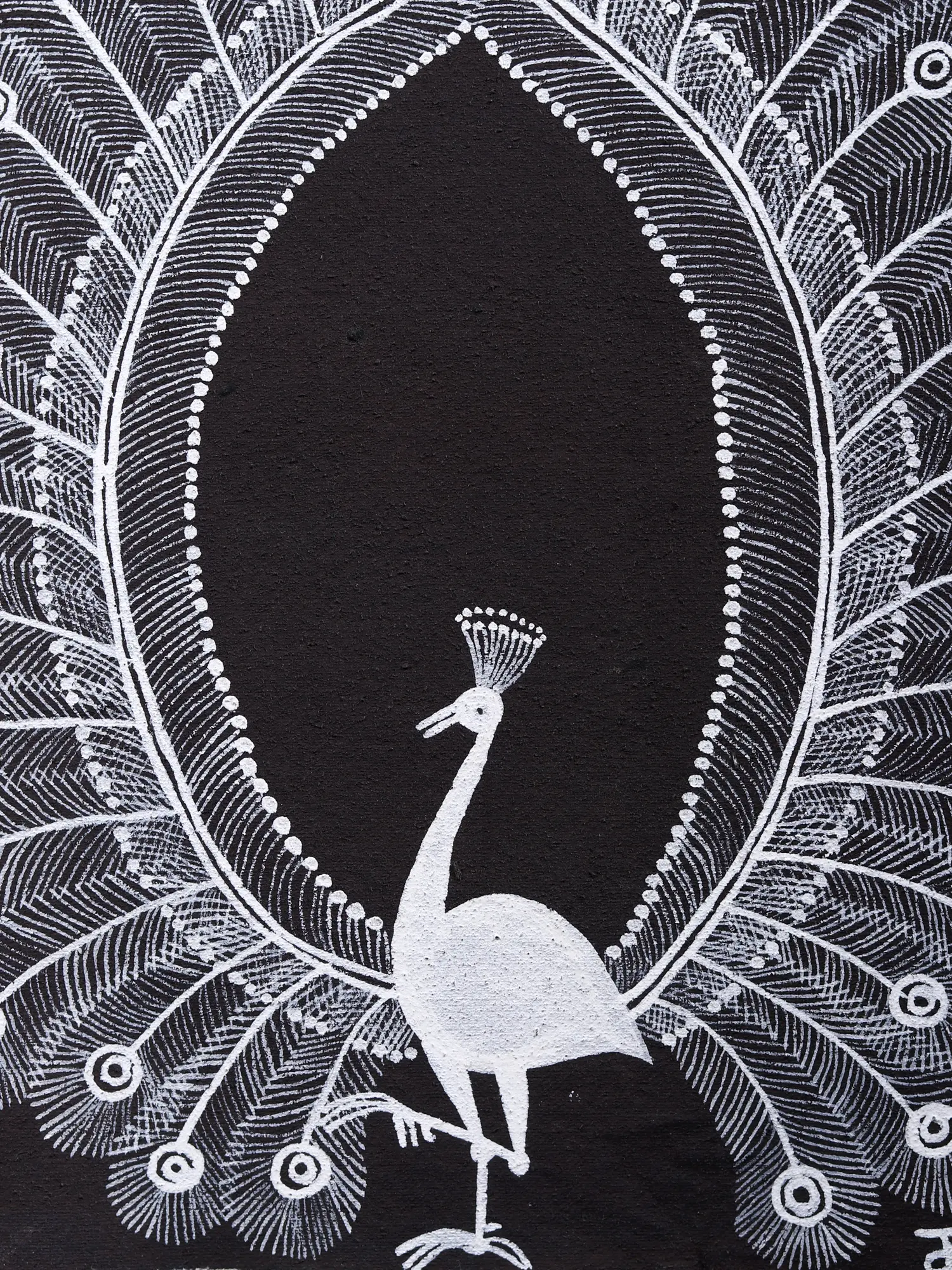 Behold the breathtaking beauty of this Warli painting, a vibrant depiction of a dancing peacock, a creature deeply revered in Indian mythology. The peacock, with its iridescent plumage, has long been associated with royalty, divinity, and beauty. In Hindu mythology, it's the vehicle of the god Kartikeya, the son of Shiva and Parvati, symbolizing strength, power, and grace. This artwork captures the essence of this magnificent bird, its feathers rendered with exquisite detail, creating a mesmerizing visual spectacle. The peacock's dance is a celebration of life, a joyful expression often portrayed in art as a symbol of prosperity and good fortune. The artist masterfully uses the characteristic Warli style—simple lines and dots—to create a sense of movement and energy.